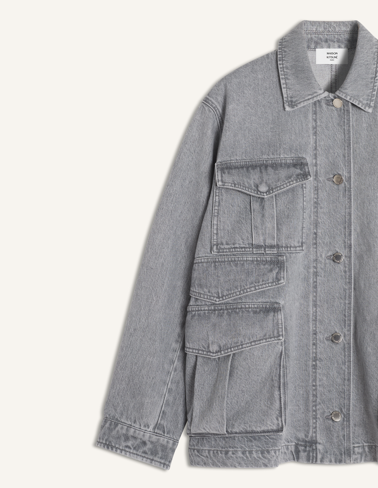 Veste Barn en denim italien mid-weight. Coupe confort avec rivet en métal gravé Maison Kitsuné Paris à lencolure dos.