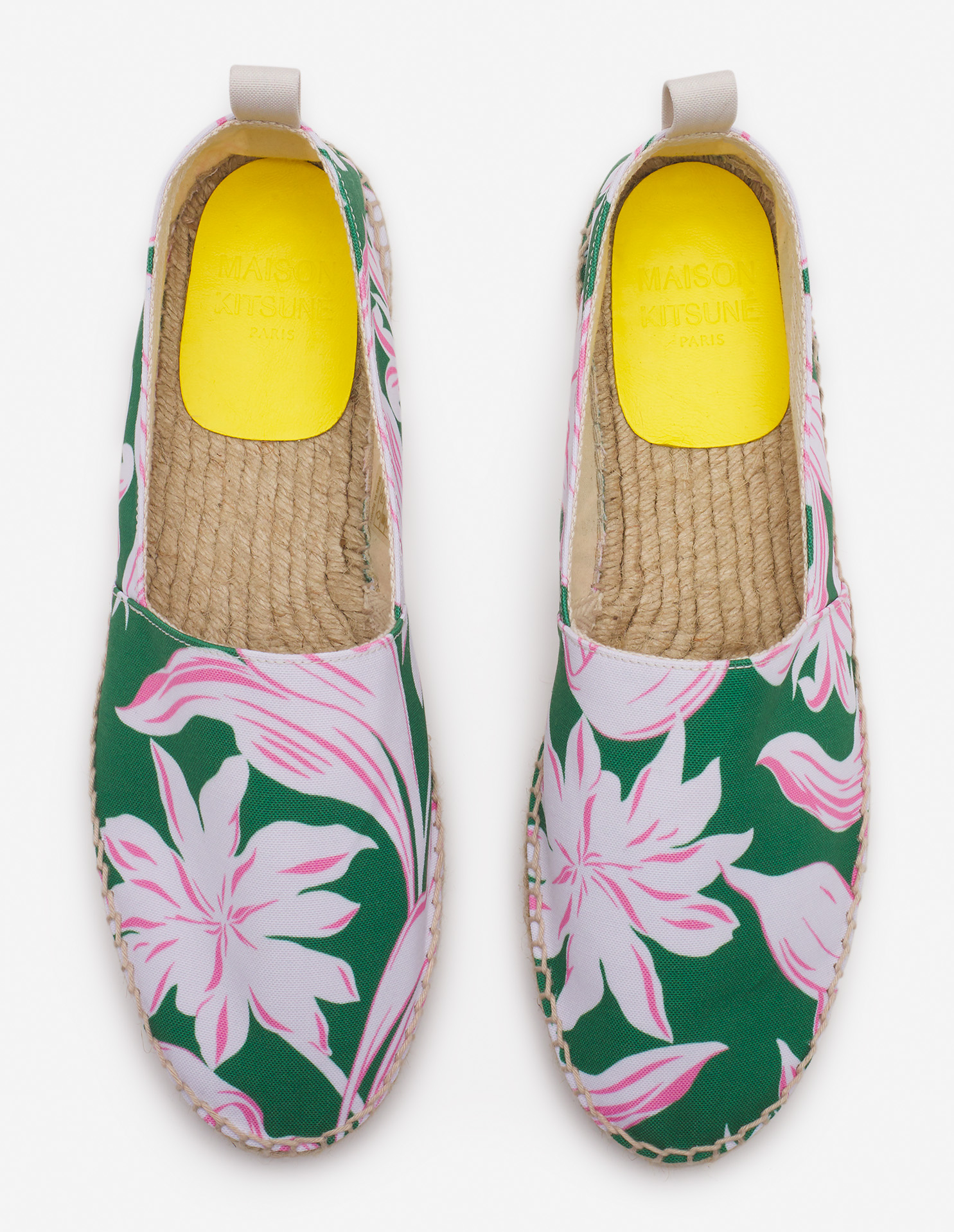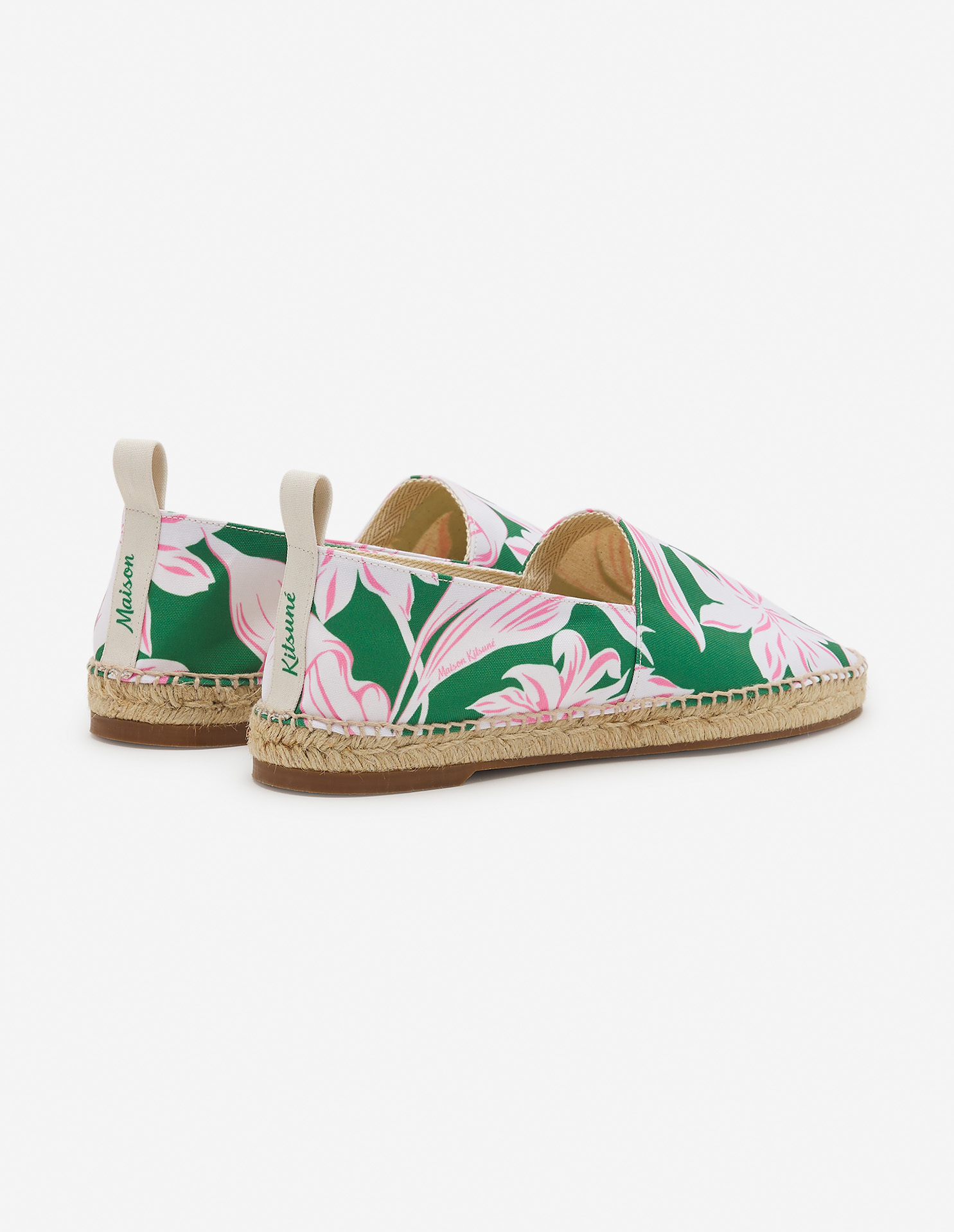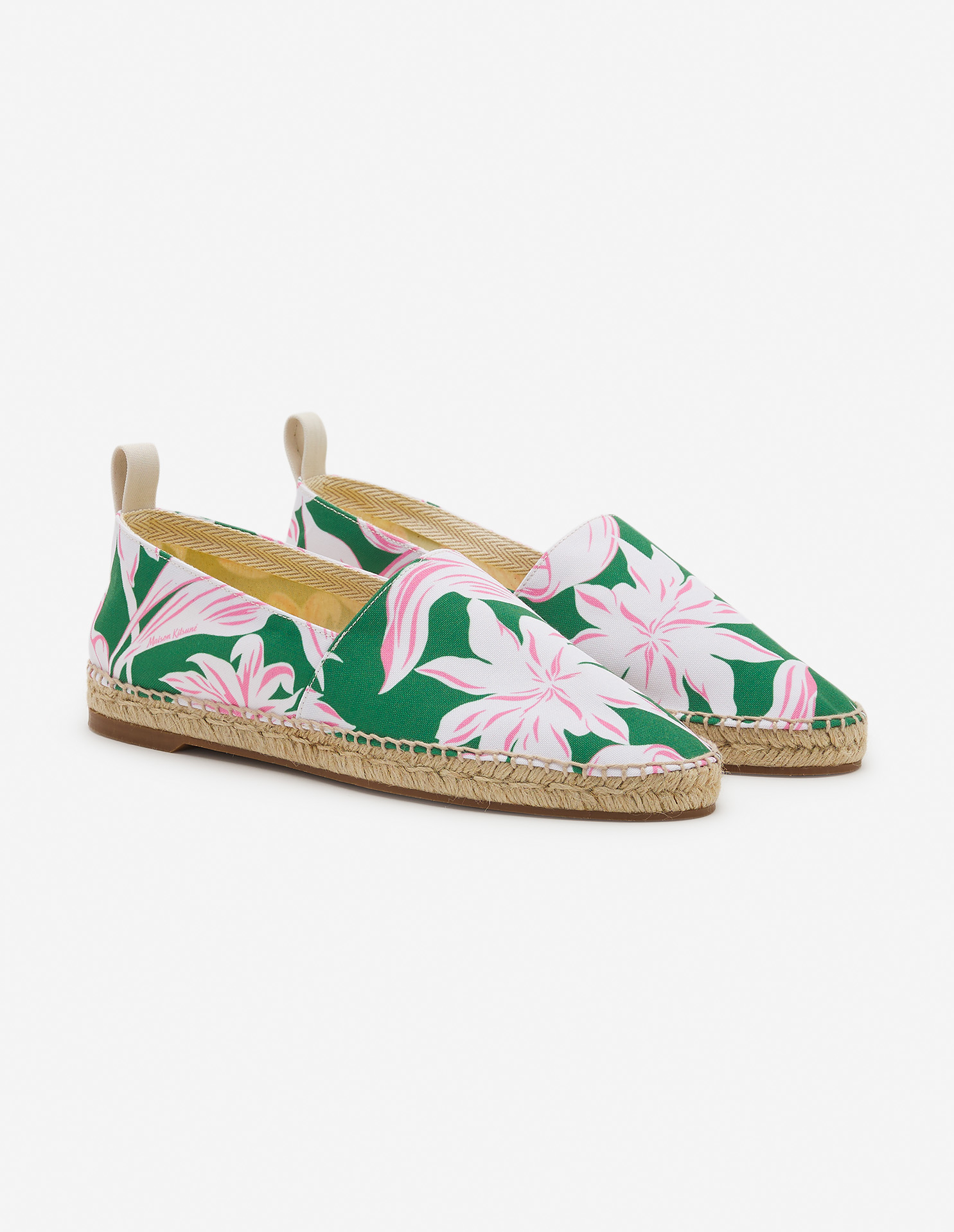 Collection signée Maison Kitsuné et Hotel Olympia. Espadrilles en toile avec imprimé fleuri.