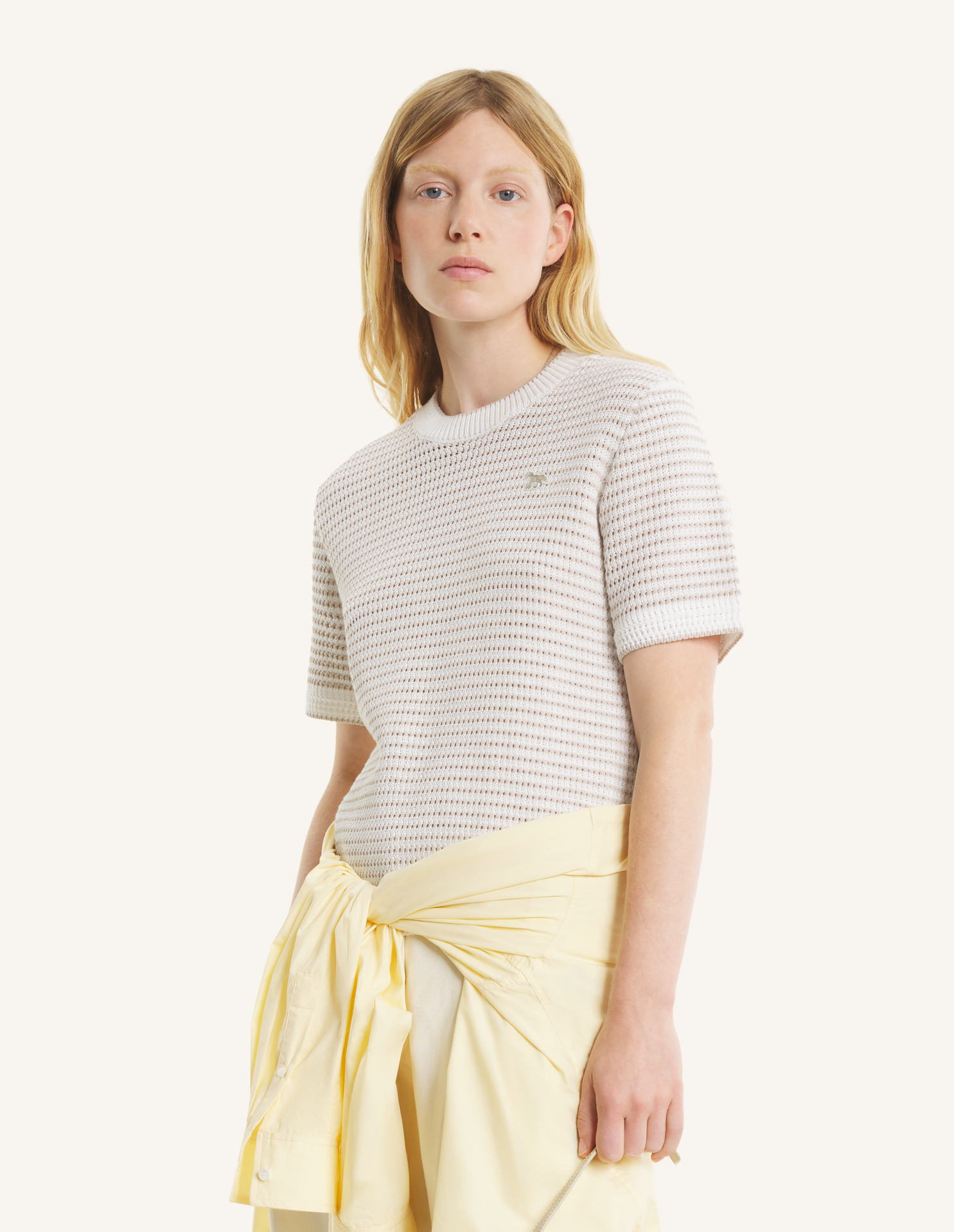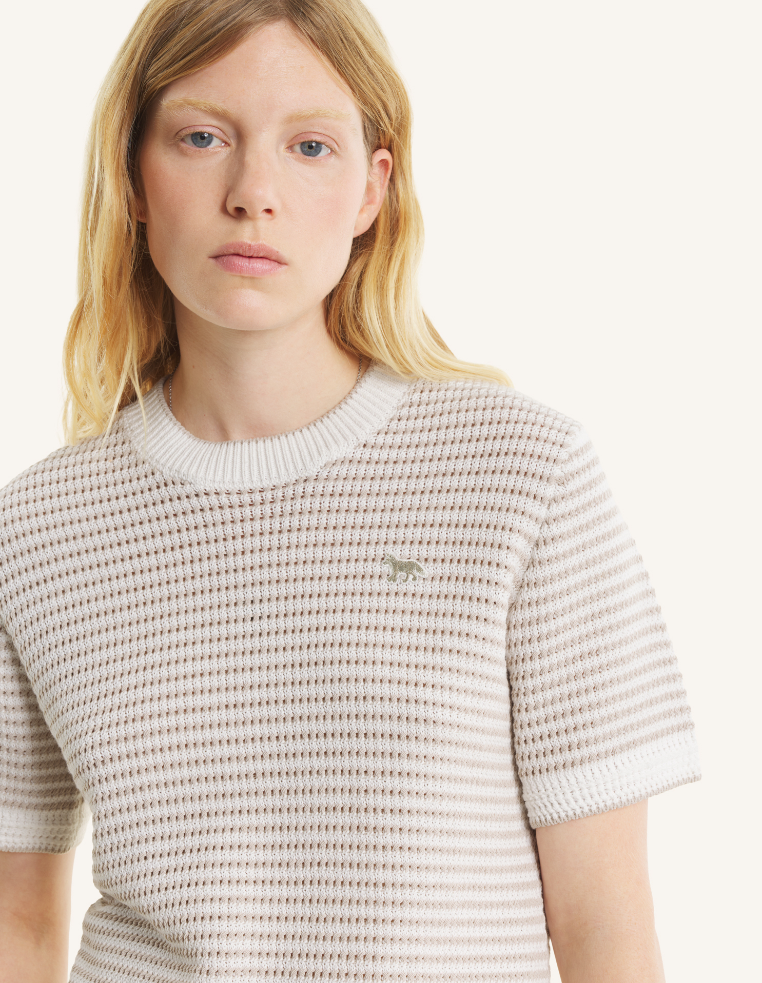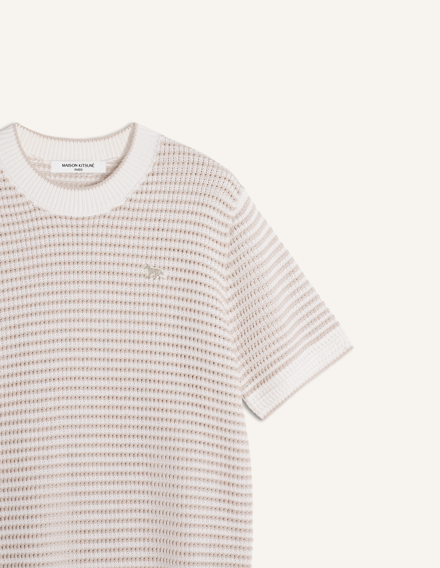 Pull à manches courtes en maille pointelle de coton rayée. Coupe ajustée avec patch brodé Baby Fox sur la poitrine.