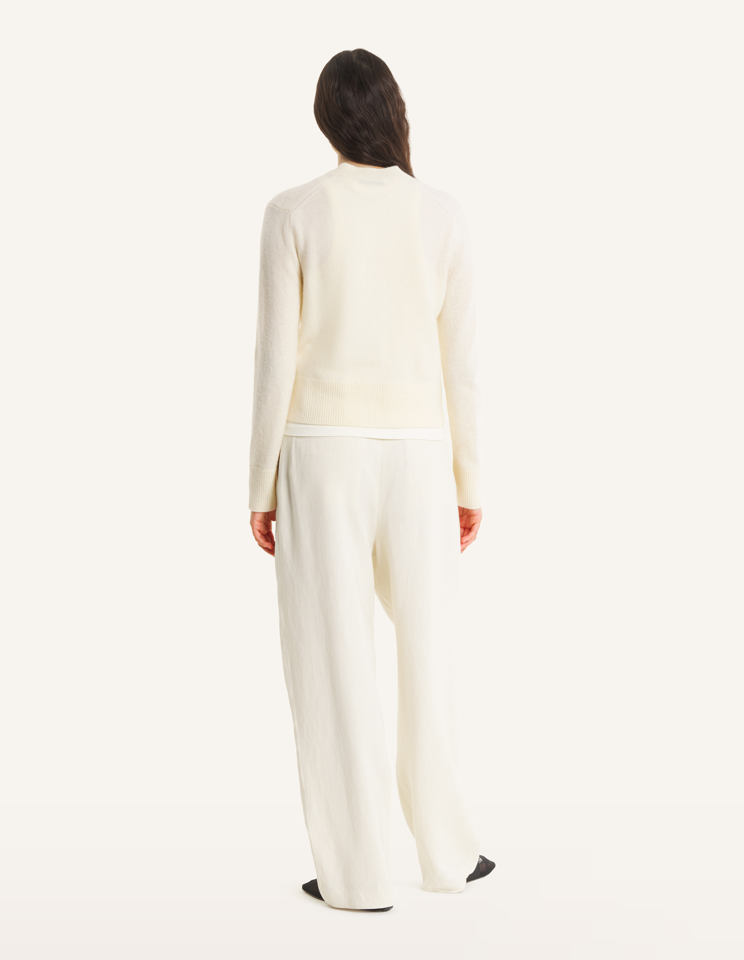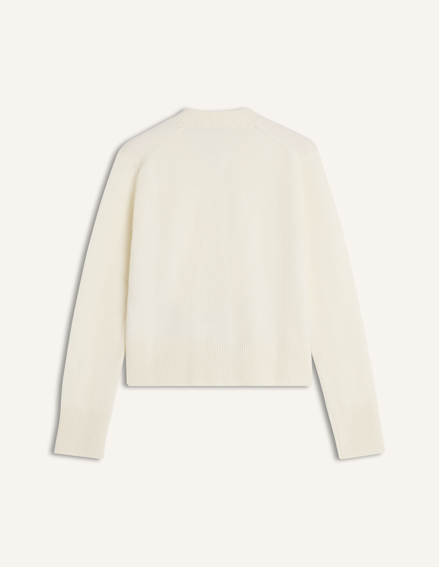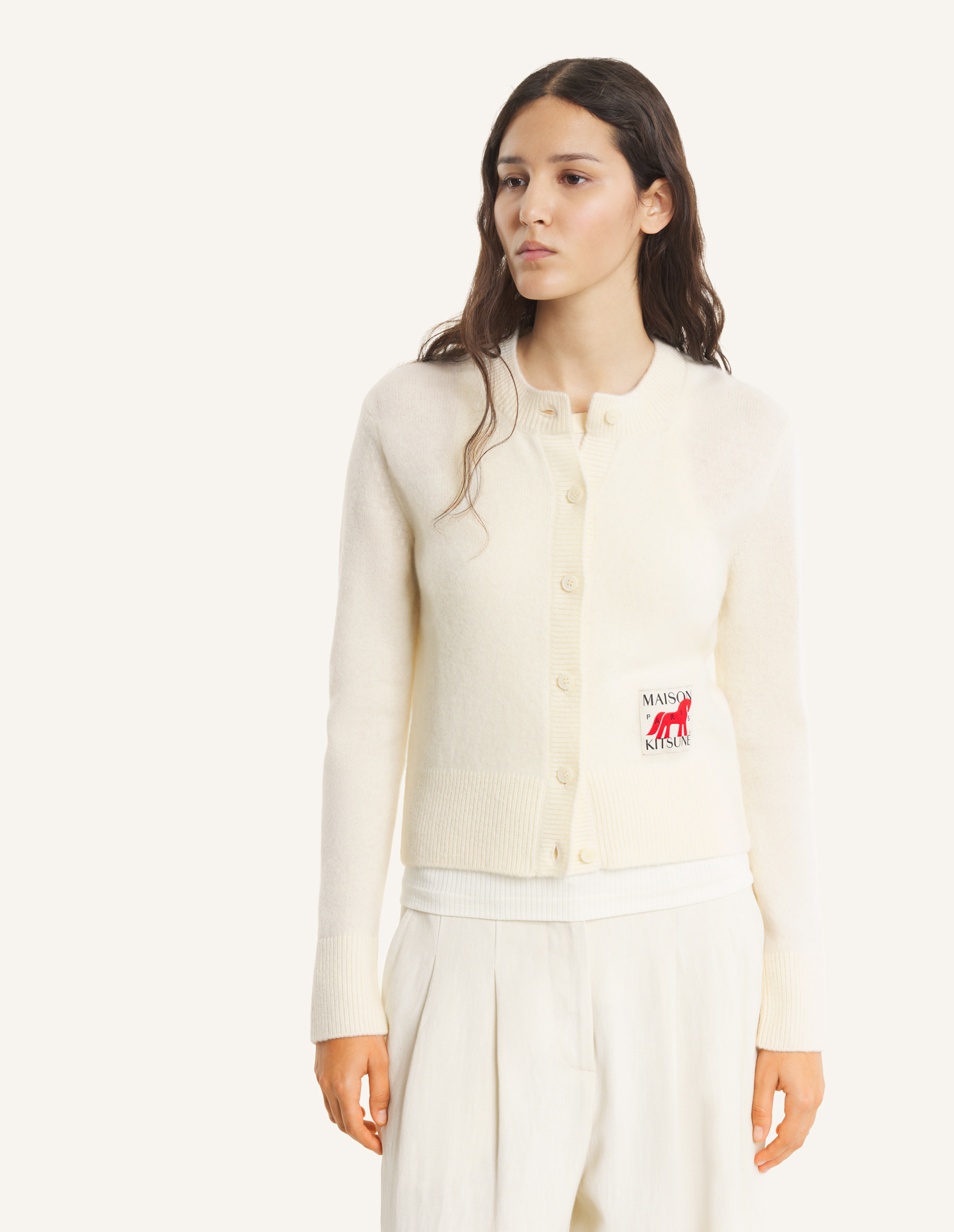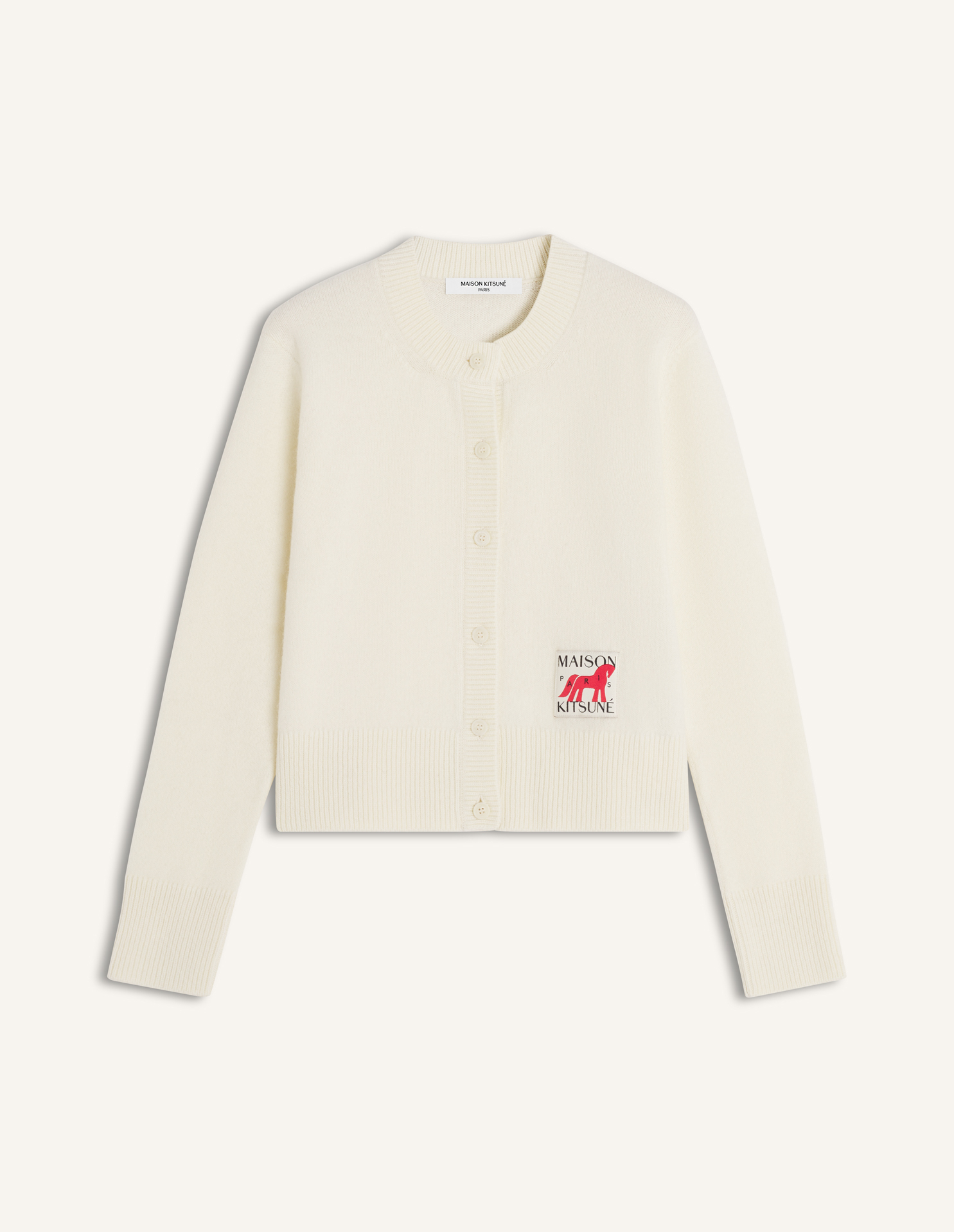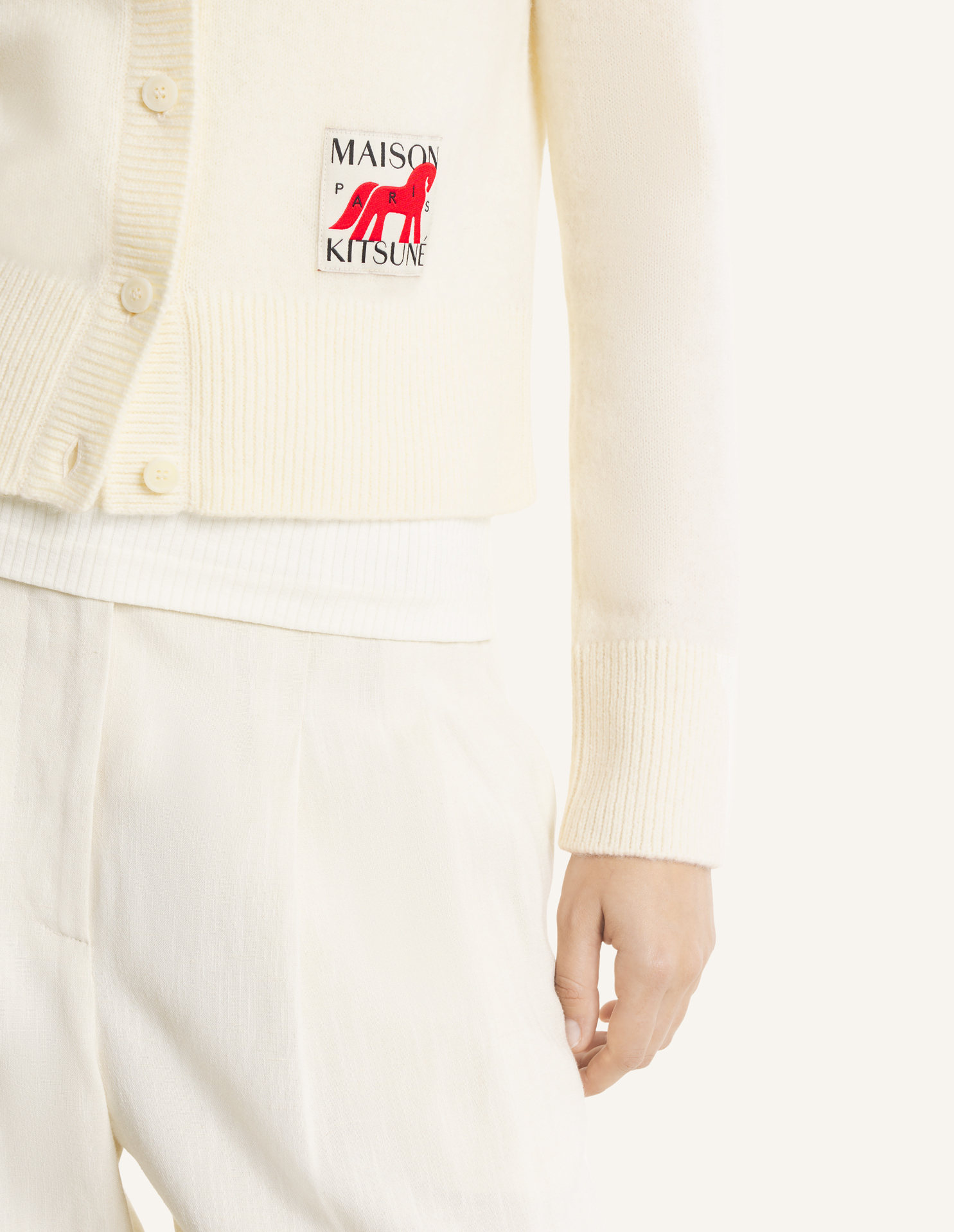 Cardigan en laine d'agneau. Coupe ajustée avec une étiquette tissée Year of the Horse en bas à gauche.
