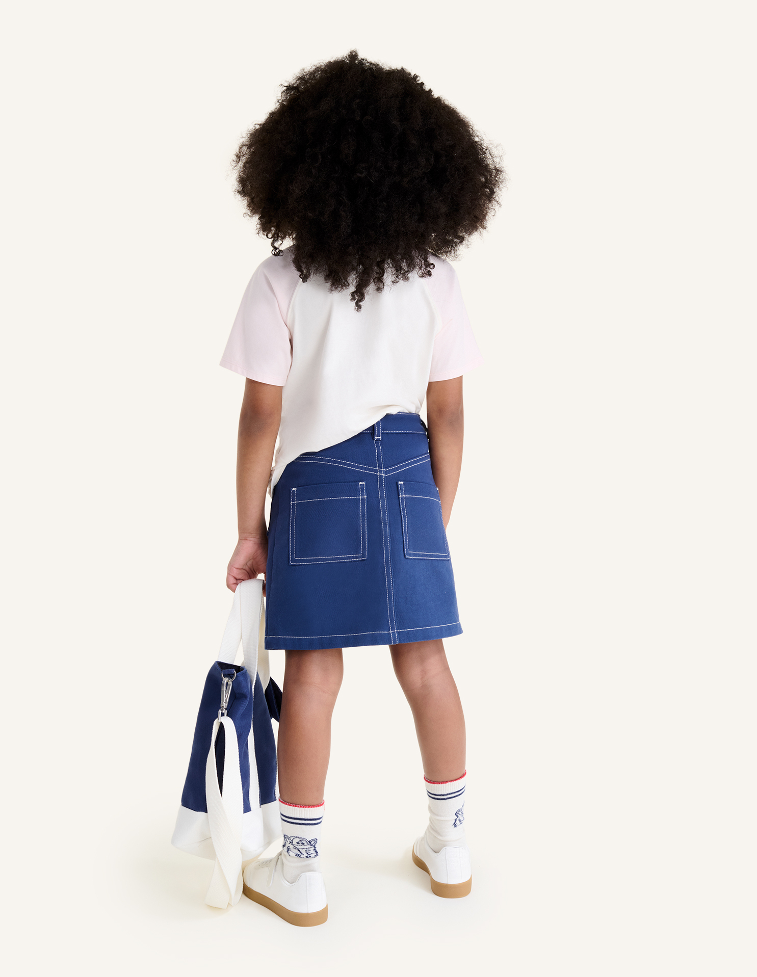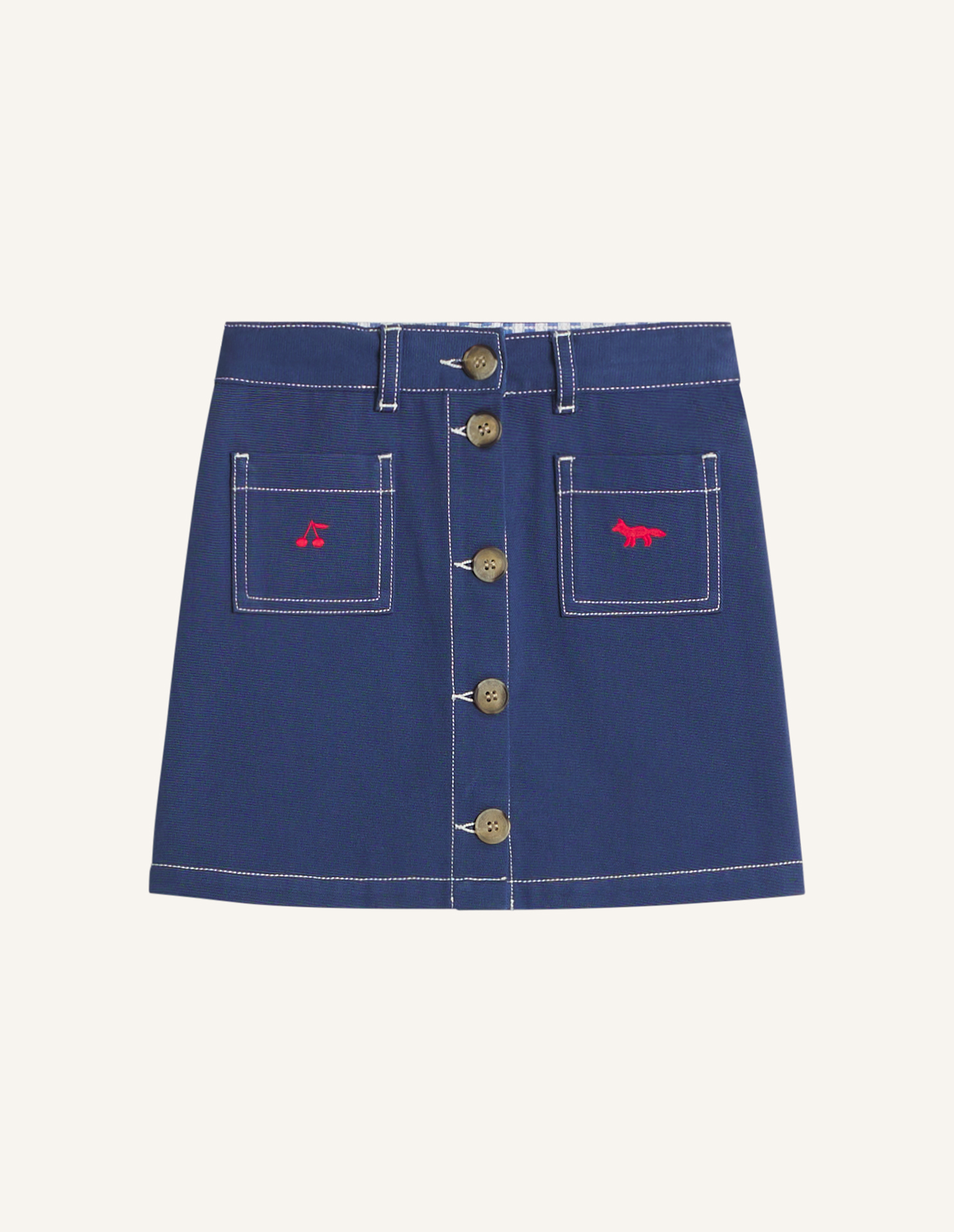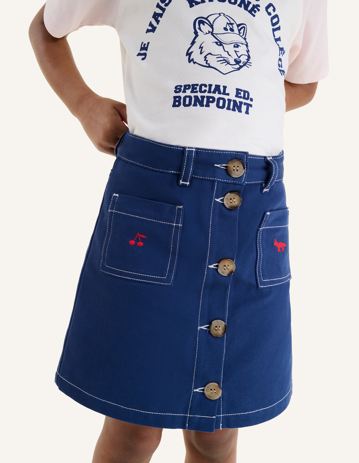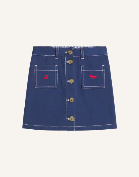 Jupe en gabardine Maison Kitsuné x Bonpoint avec broderies sur le devant.