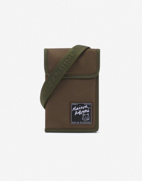 Pochette en Nylon avec bandoulière pour un porté au cou avec patch "Maison Kitsuné Richelieu" sur le devant.