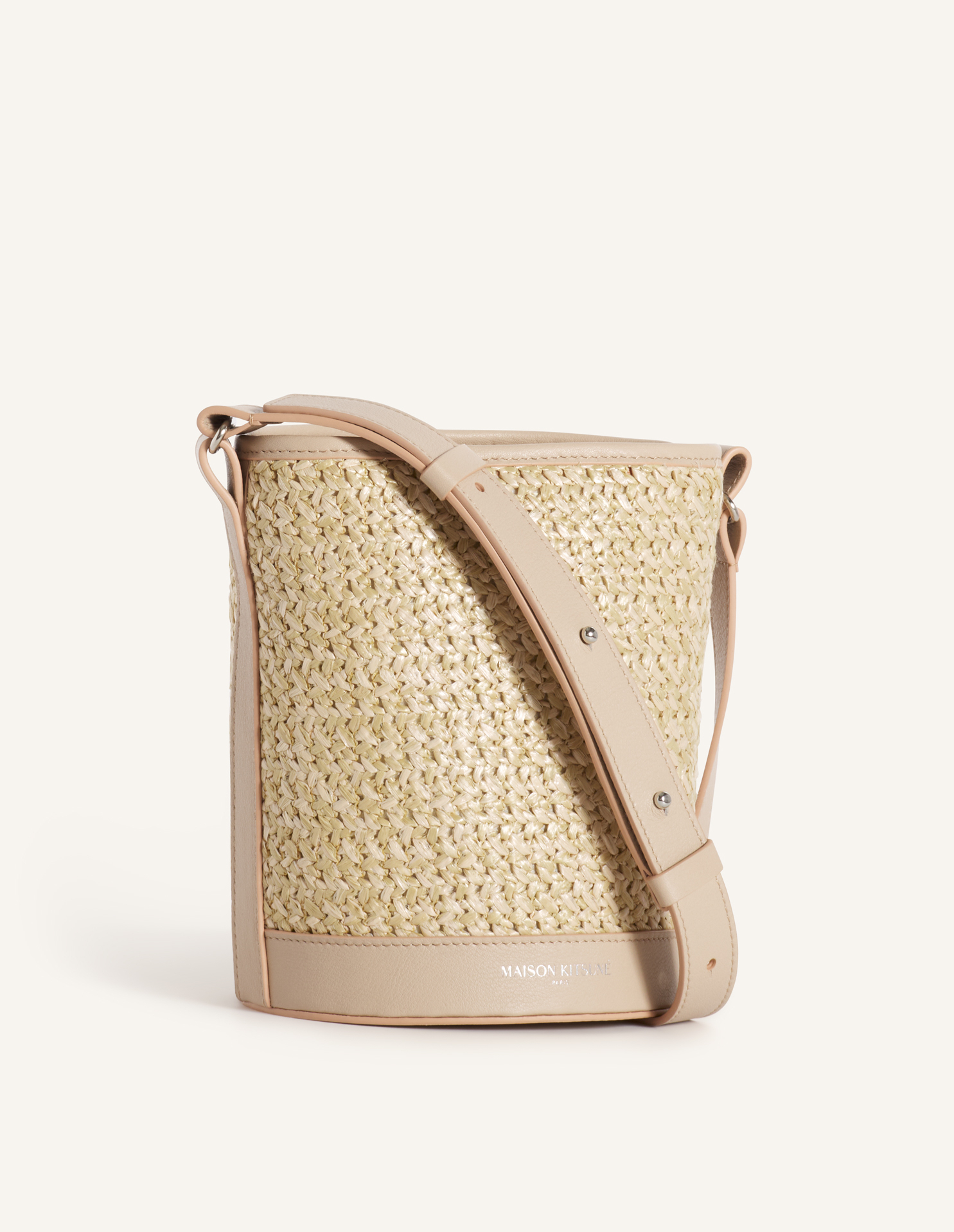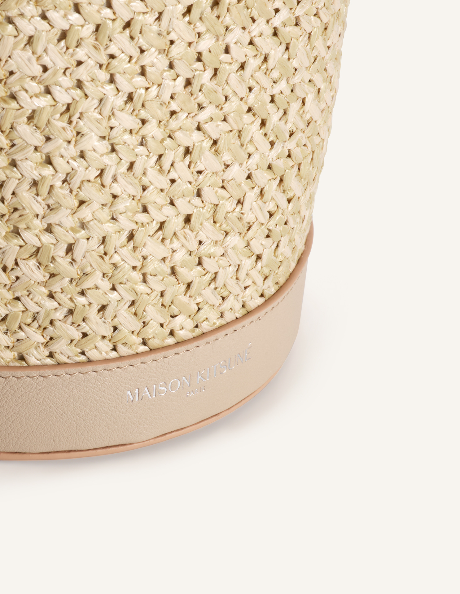 Sac seau en raphia et cuir. Maison Kitsuné Paris embossé doré sur le devant.