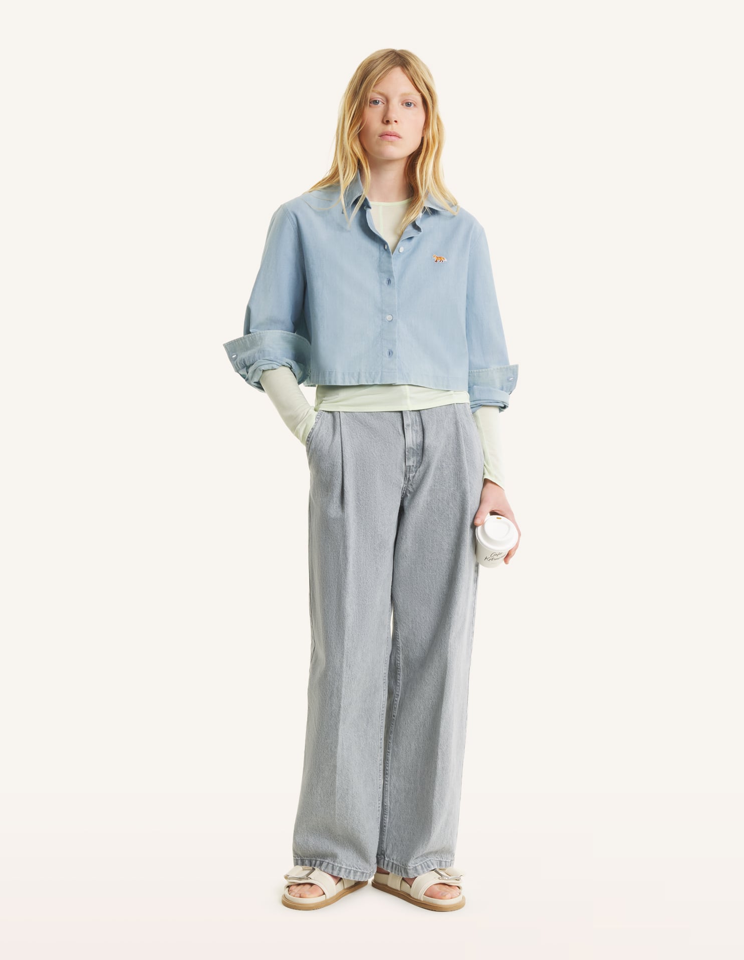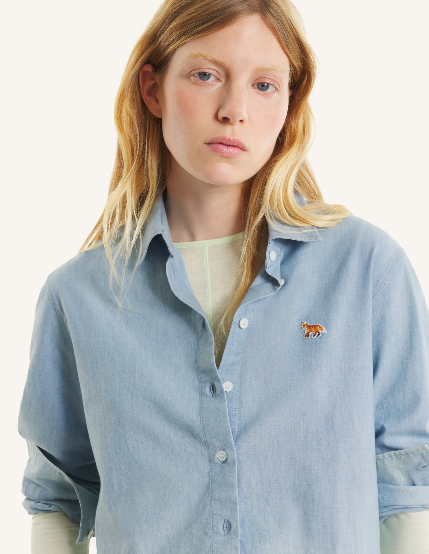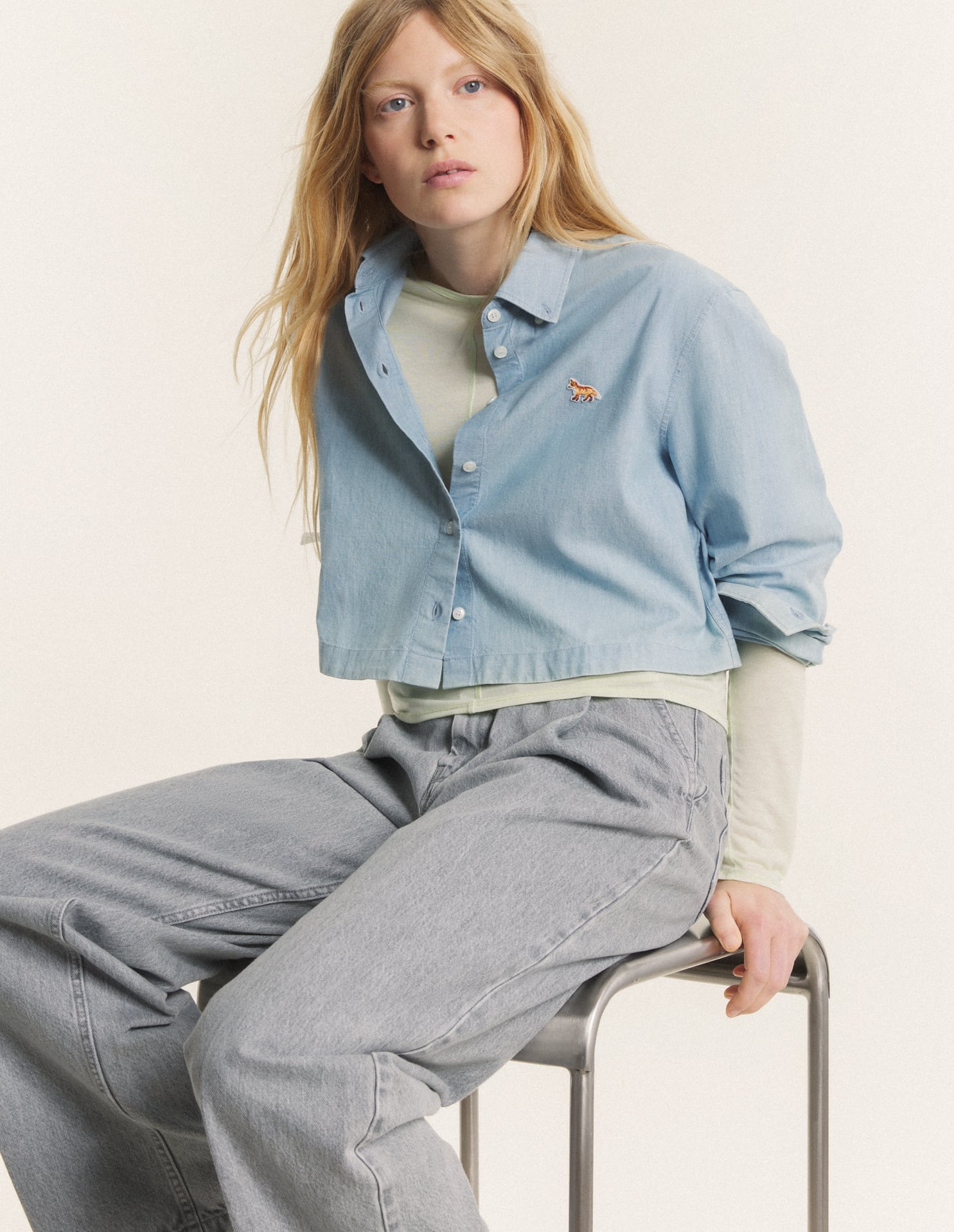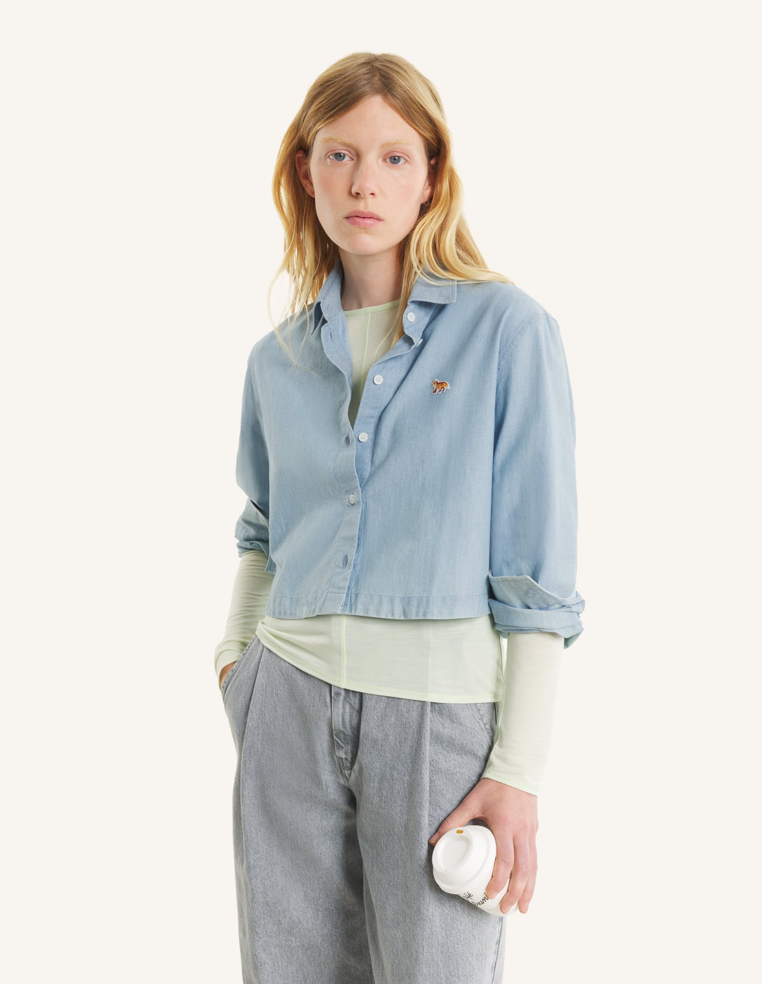Cropped shirt in chambray. Baby Fox embroidered patch on the chest.