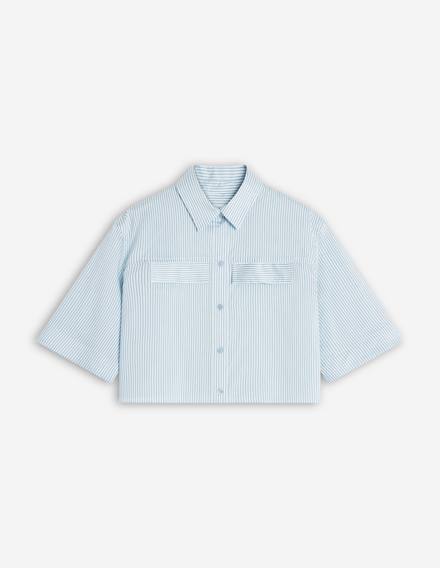 Cropped lyocell-silk stripe shirt. Boxy fit with signature gold Profile fox button.