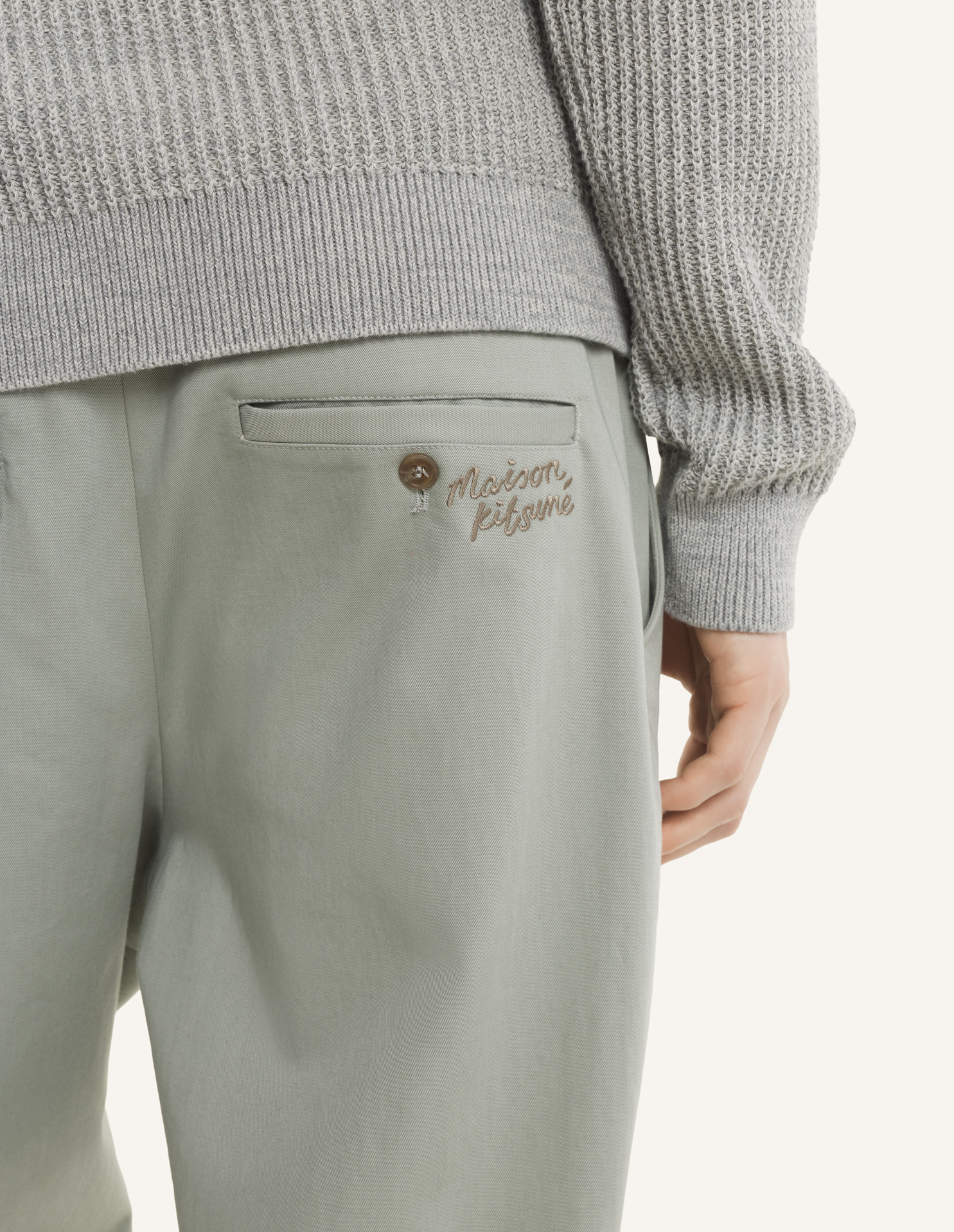 Button closure and hidden zipped fly with Maison Kitsuné engraved buttons