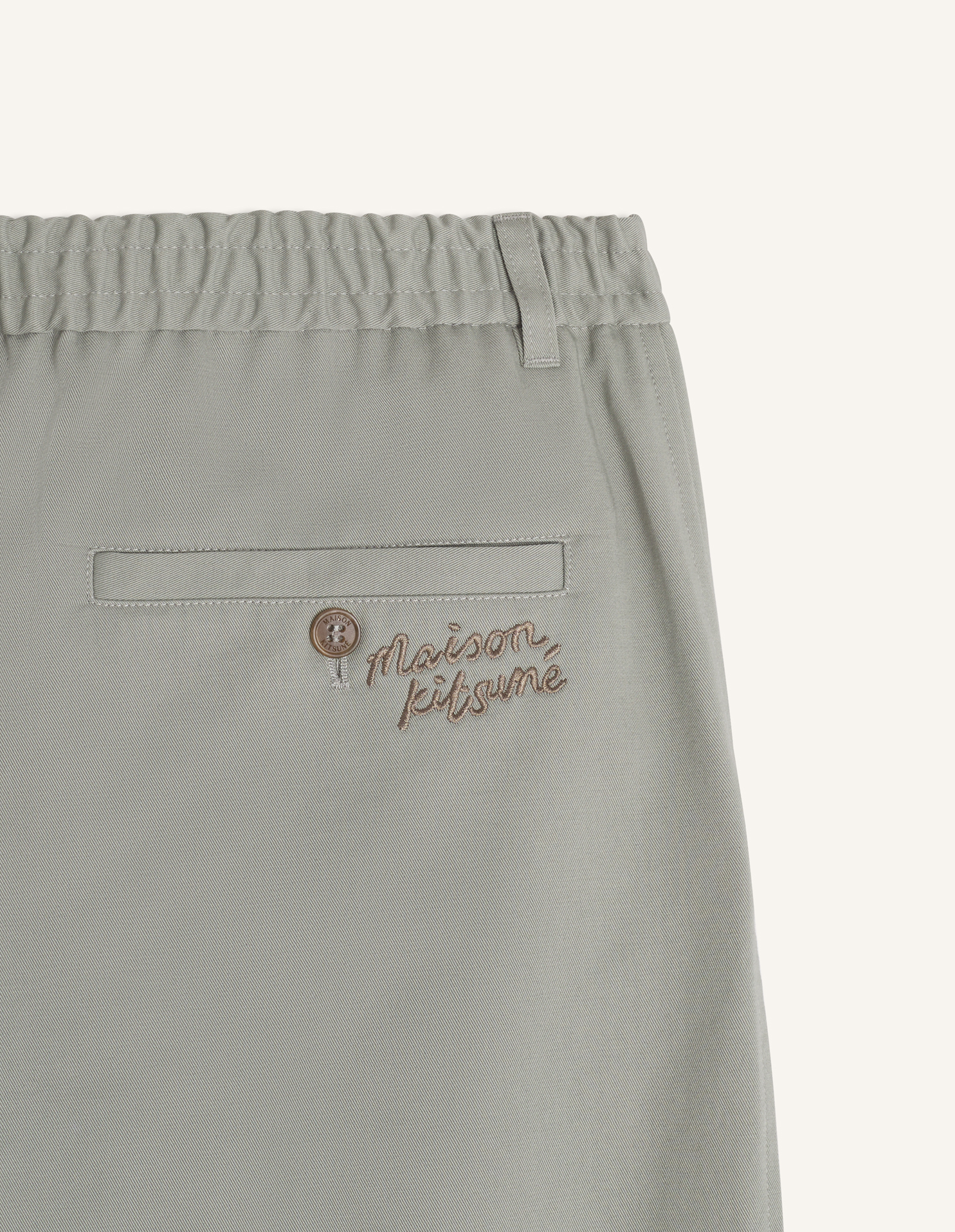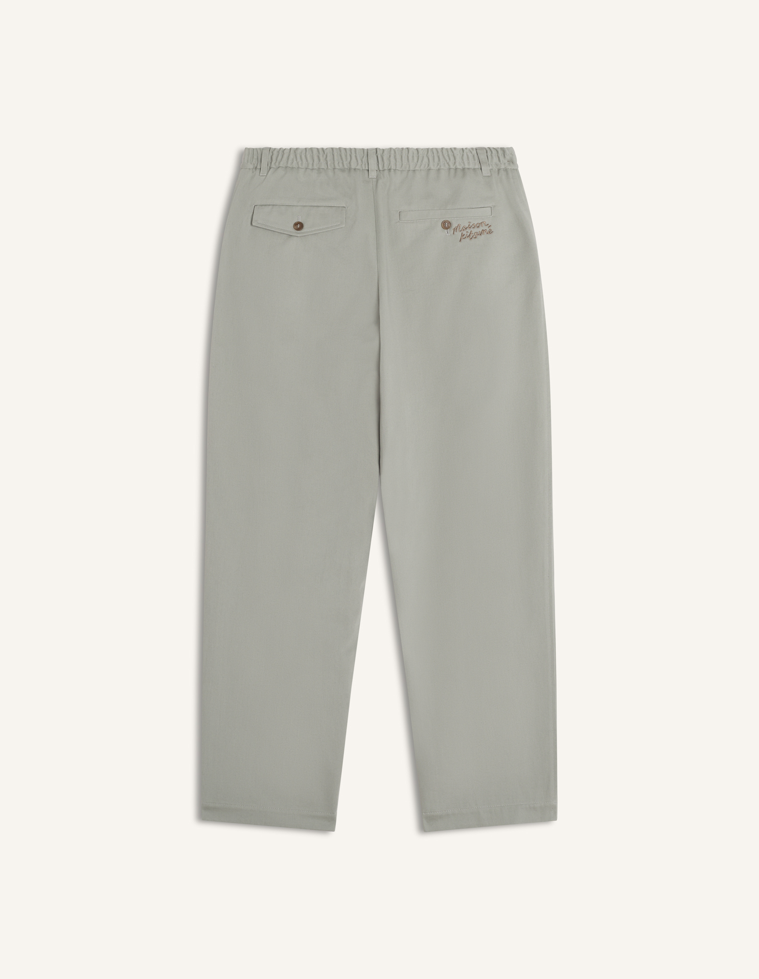 Elasticated pleated pants in washed light canvas. Relaxed fit with Maison Kitsuné Handwriting embroidery.