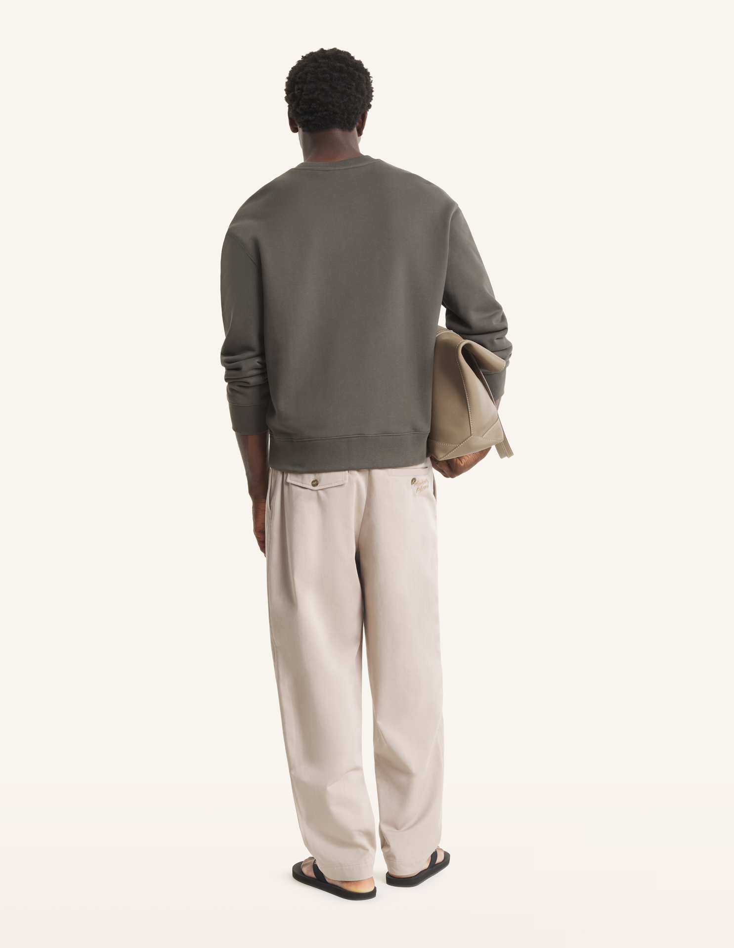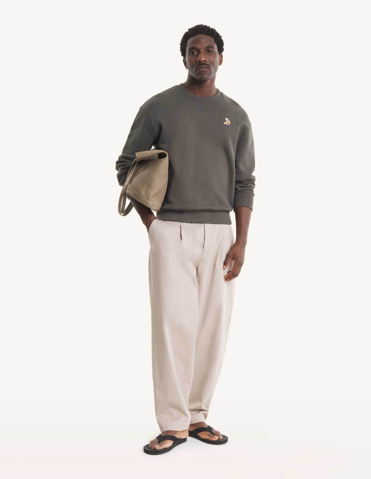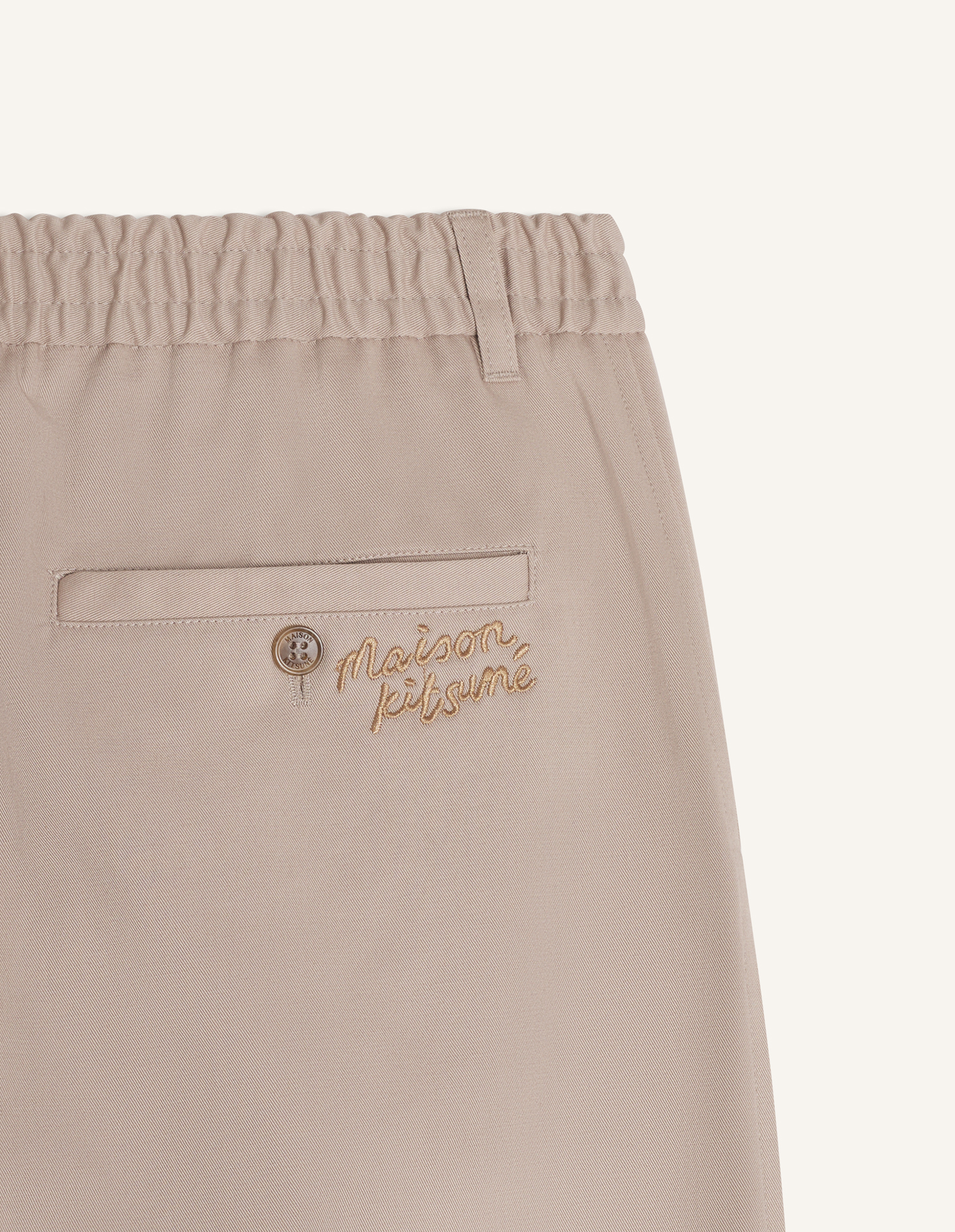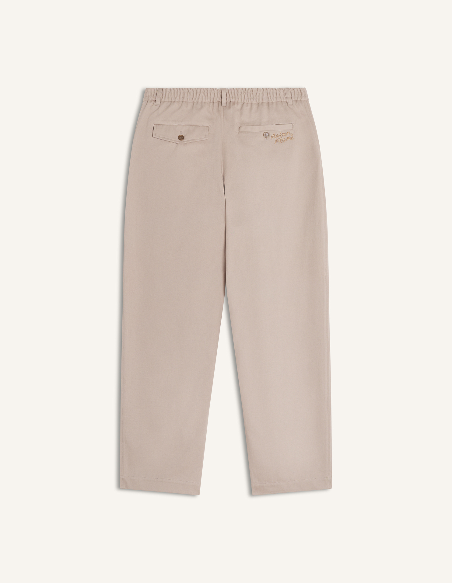 Elasticated pleated pants in washed light canvas. Relaxed fit with Maison Kitsuné Handwriting embroidery.