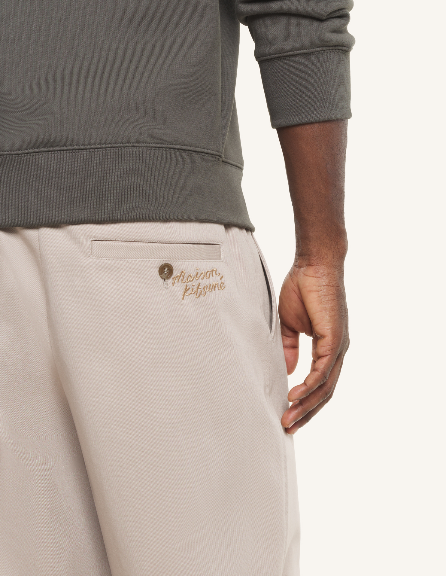 Button closure and hidden zipped fly with Maison Kitsuné engraved buttons