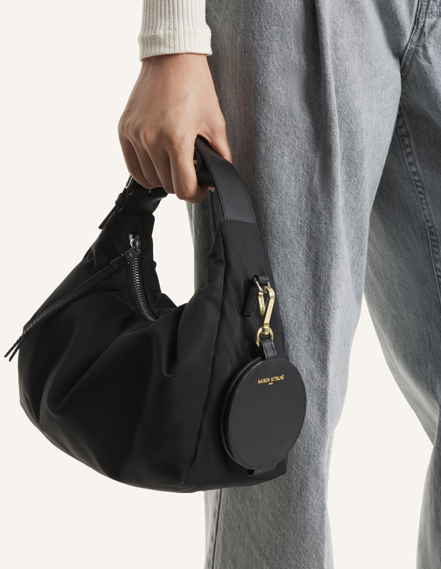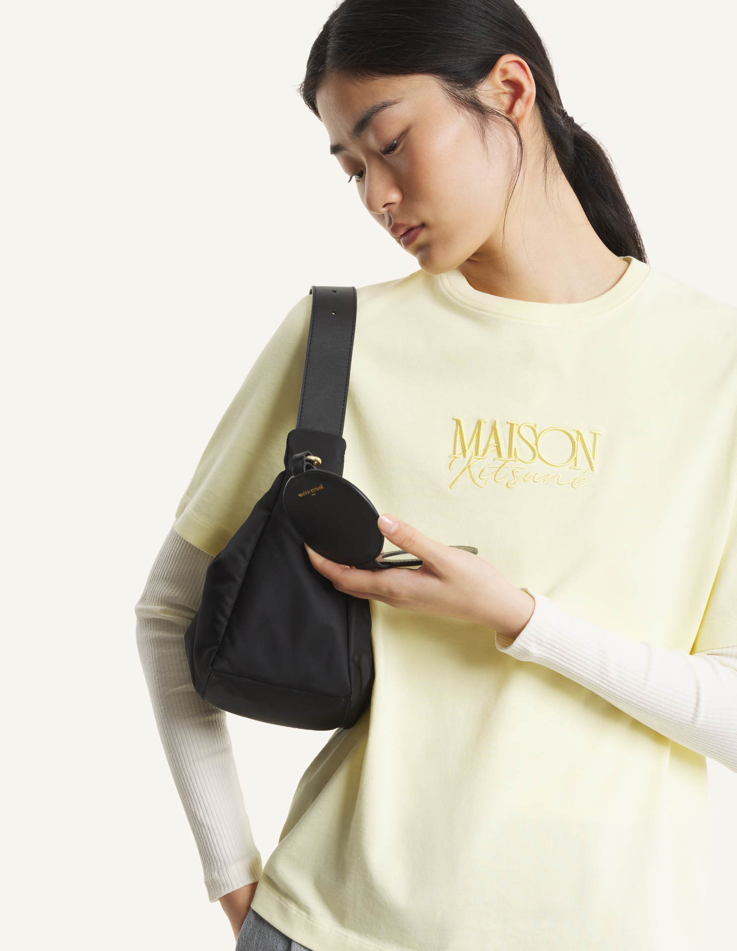 Mirror charm in soft grained leather. Maison Kitsuné Paris engraved on the front.