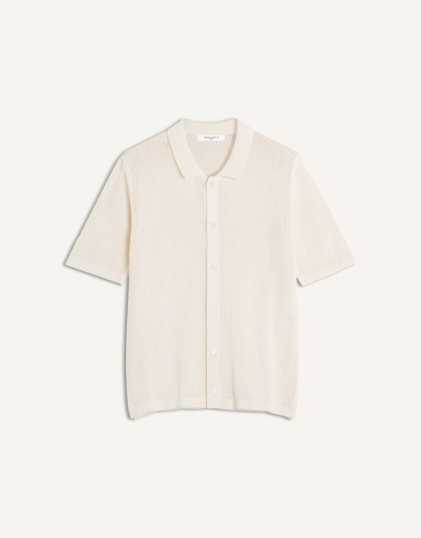Open knit short sleeve cardigan in cotton blend. Relaxed fit with Maison Kitsuné Paris embroidery at back neckline.
