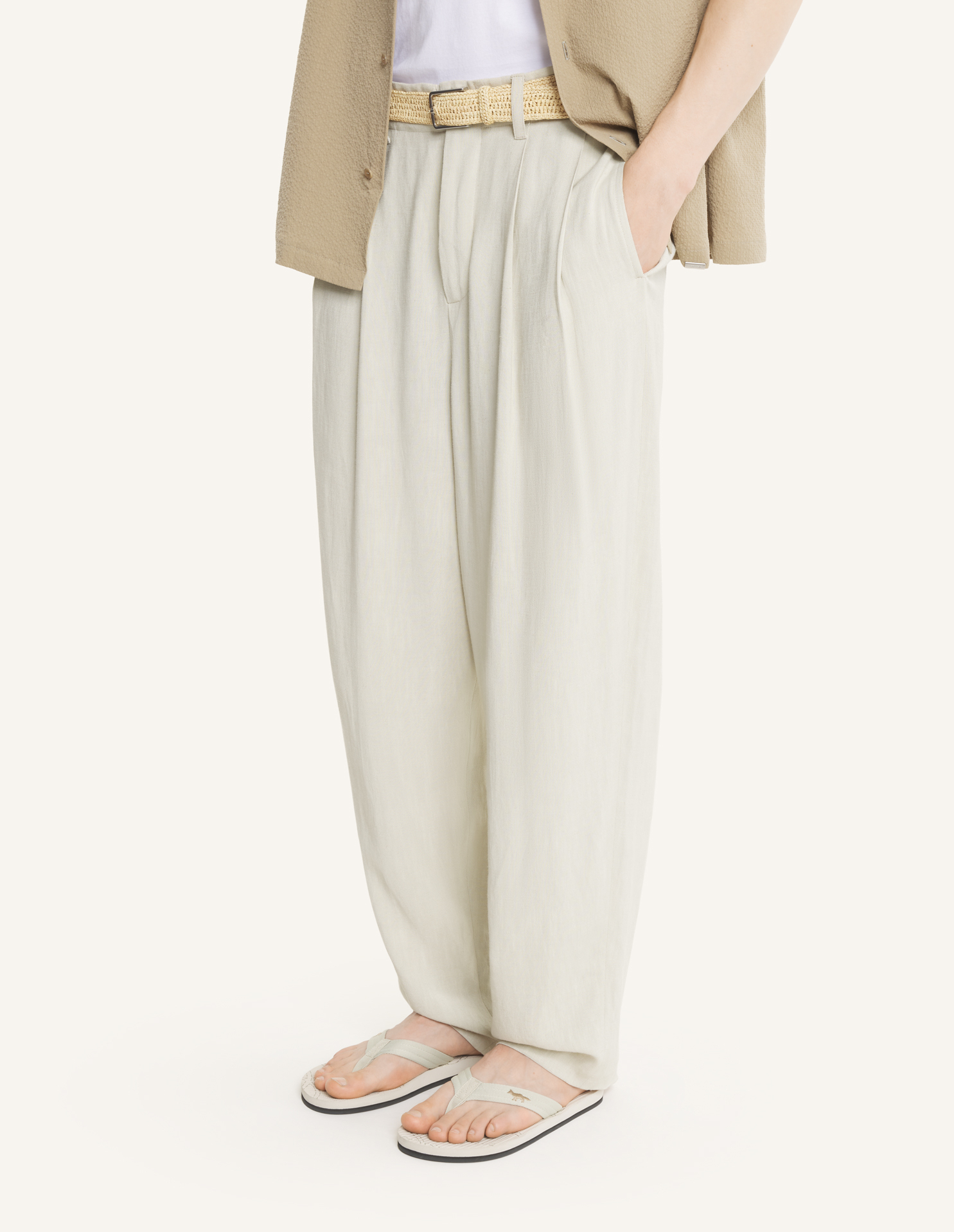 Tailored pleated pants in textured linen blend. Tailored fit.