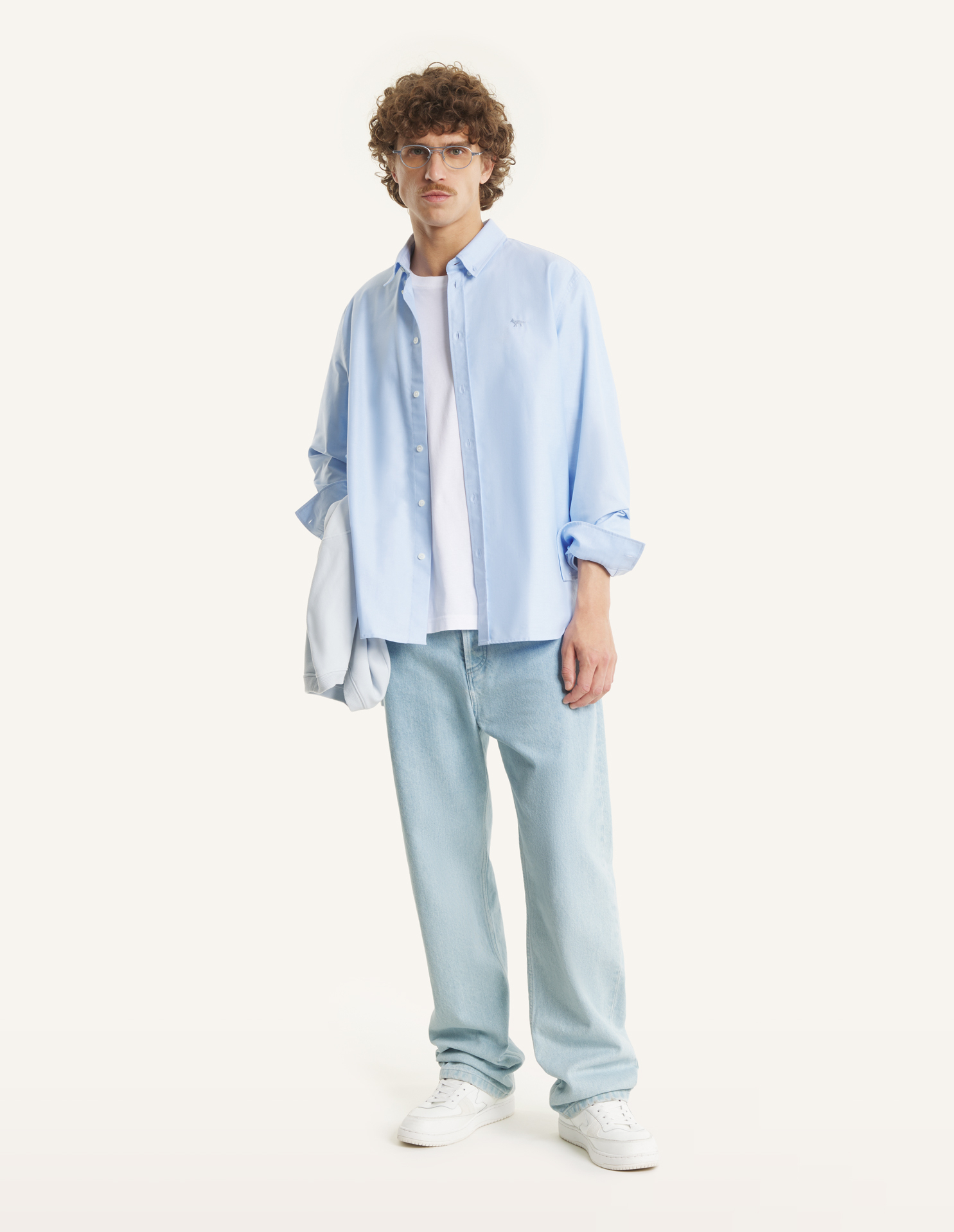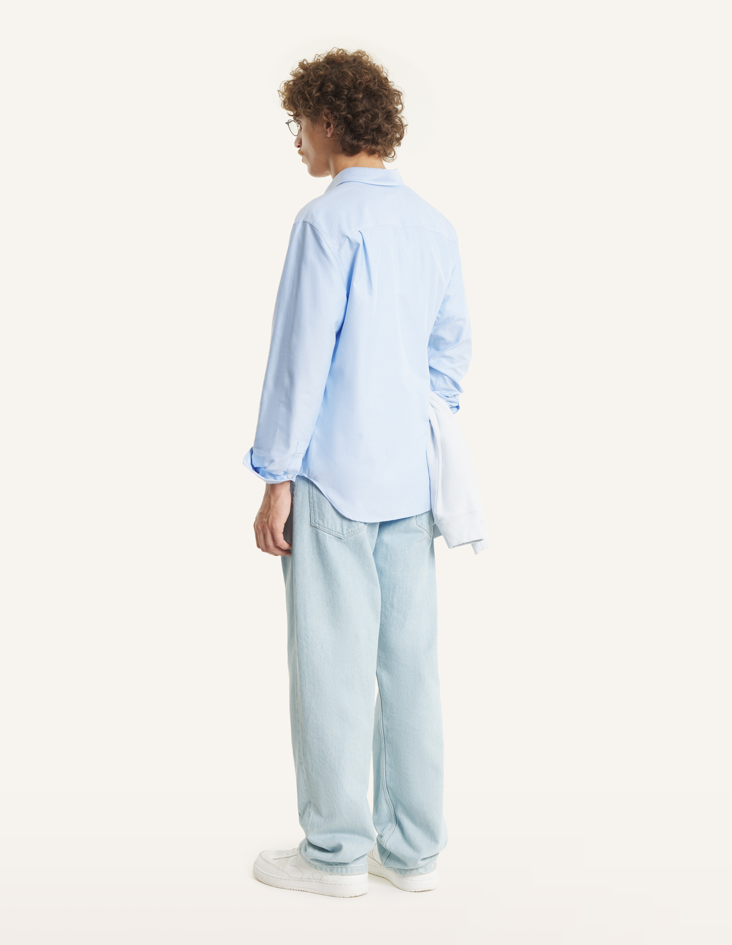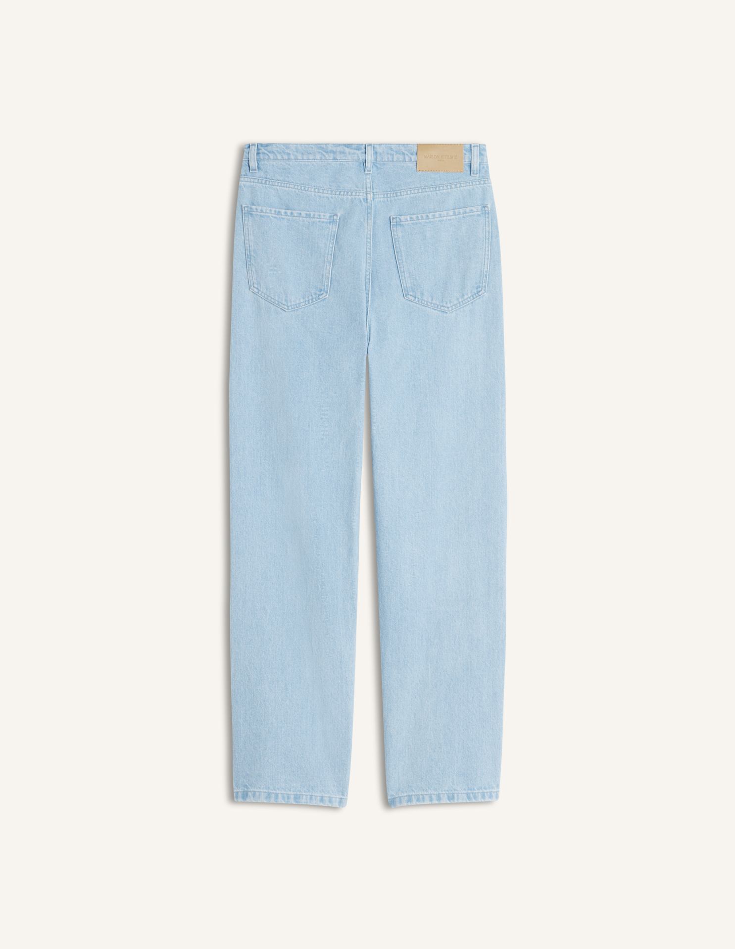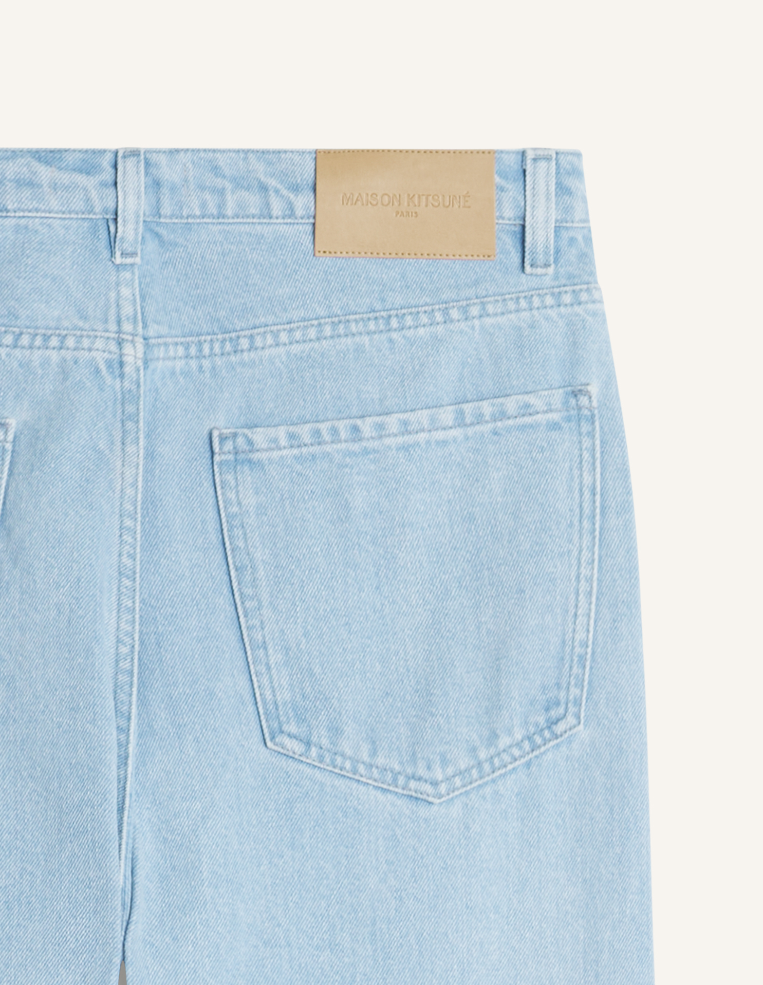 Wide jeans in mid-weight Italian denim. Maison Kitsuné Paris jacron at the back.