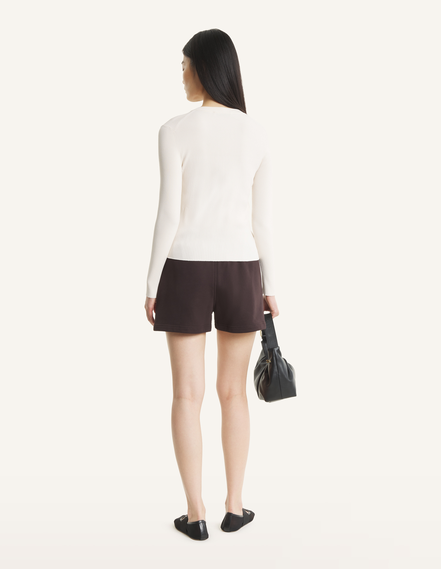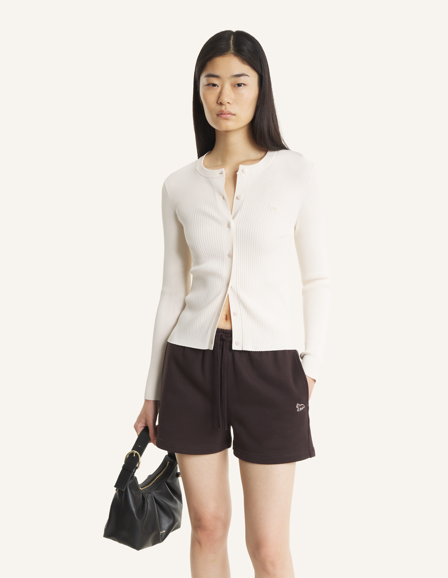 ヴィスコース素材のプリーツリブカーディガン。フィットカットで、胸元にはトーナルベイビーフォックスの刺繍パッチが施されています。