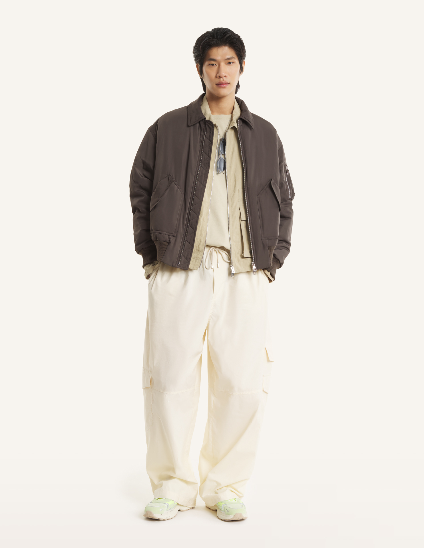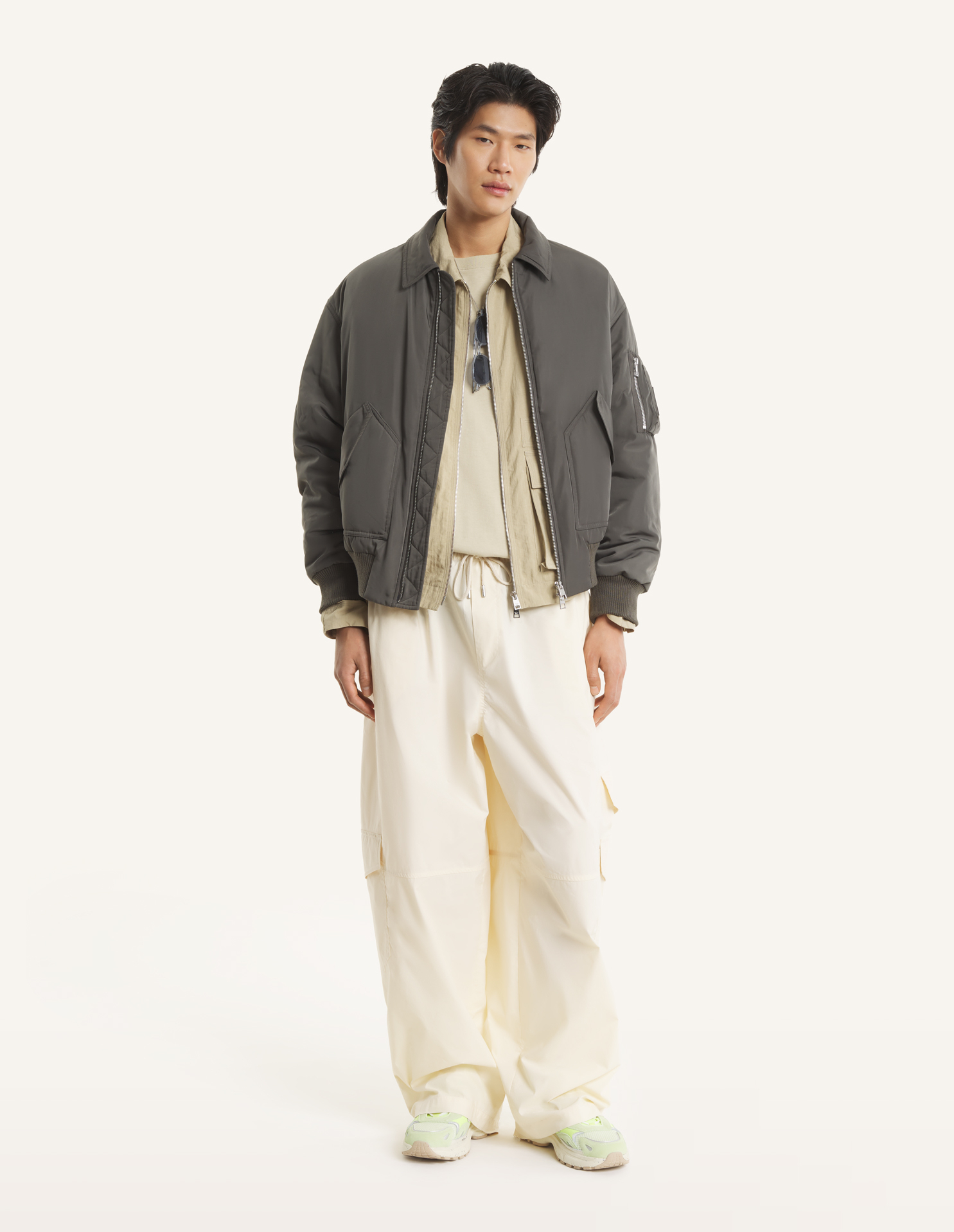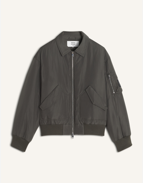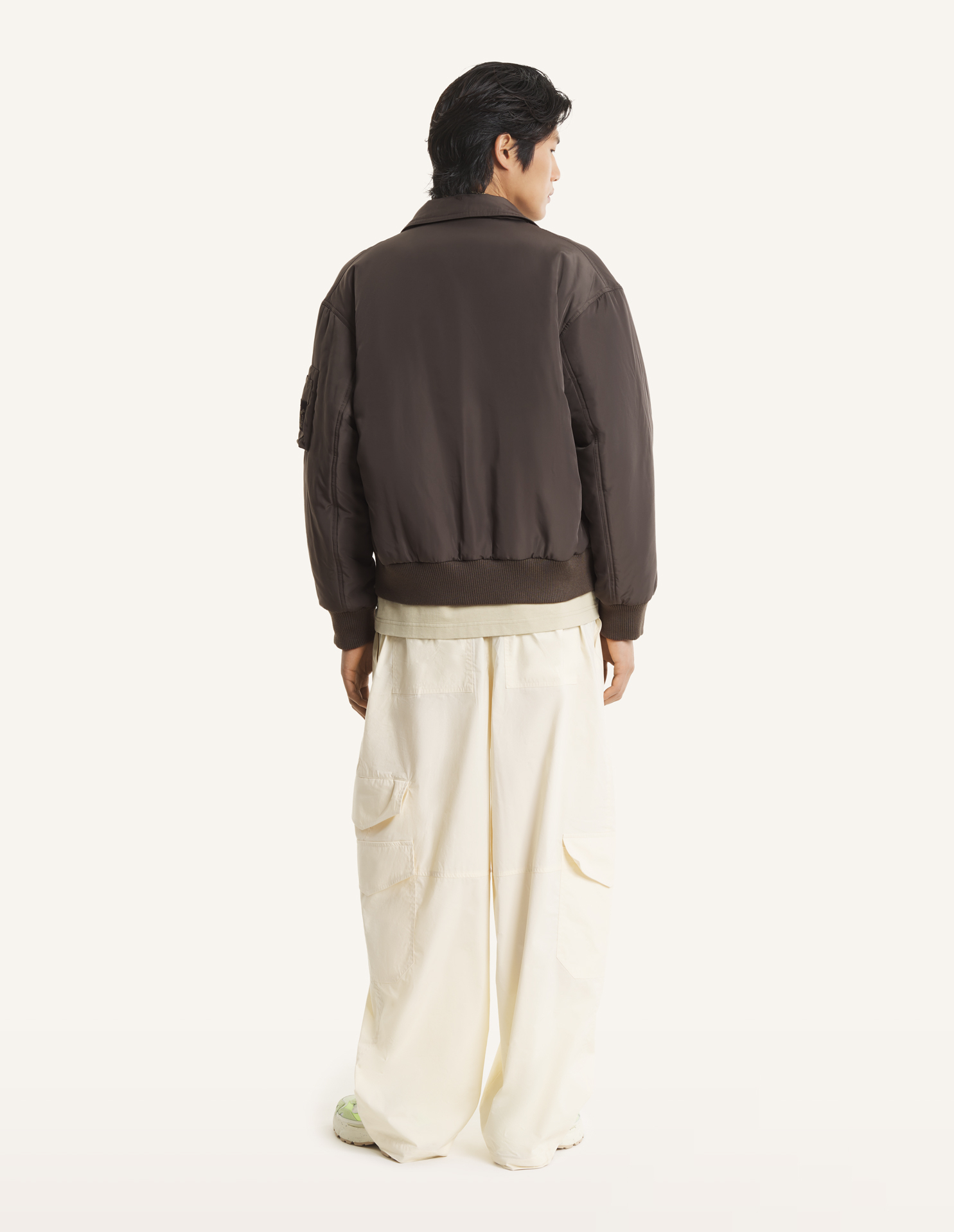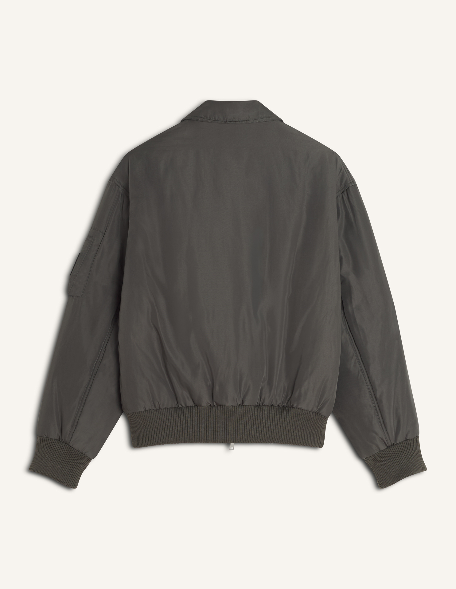 ライトキャンバス素材のボンバージャケット。コンフォートフィットで、袖にギャラリーフォックスの織りタグが施されています。