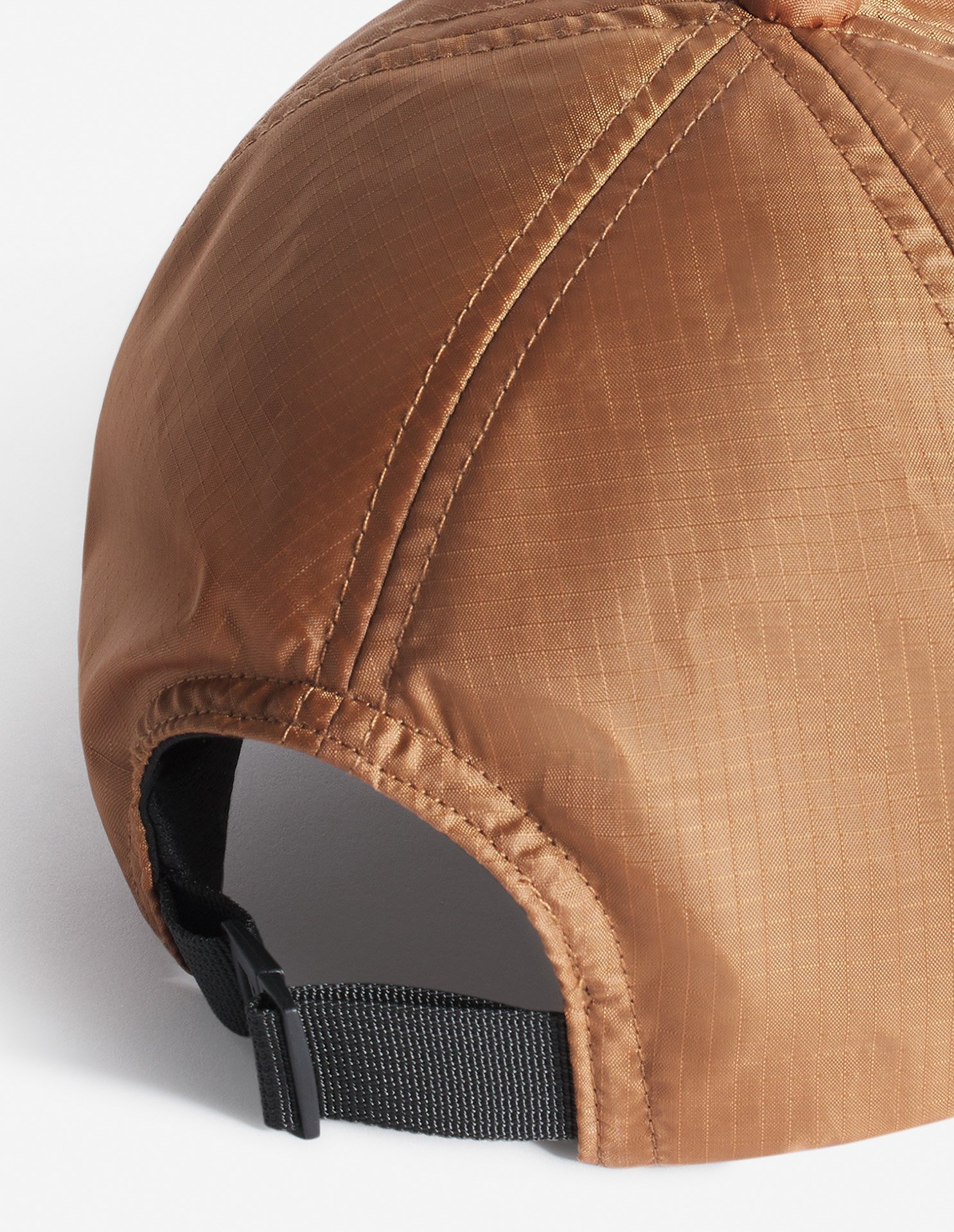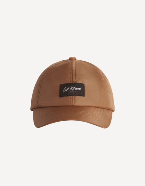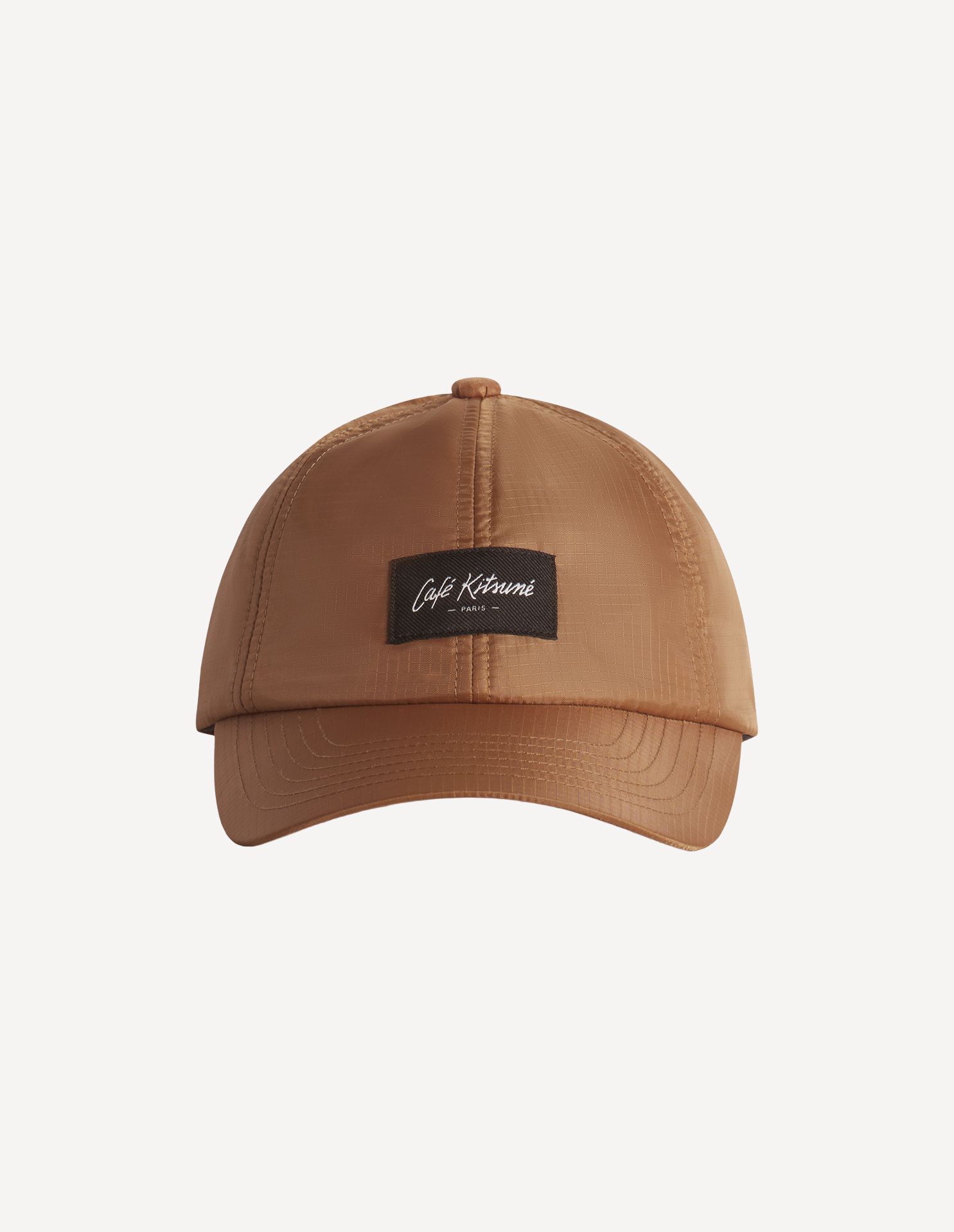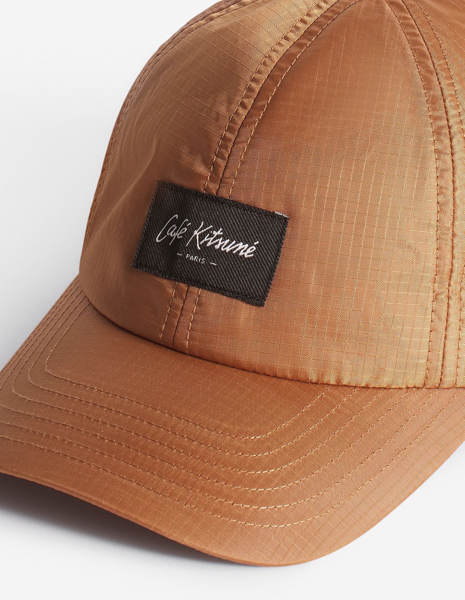 ライトリップストップ素材の6パネルキャップ。フロントに「Café Kitsuné」ハンドライティングロゴの織りラベルが施されています。