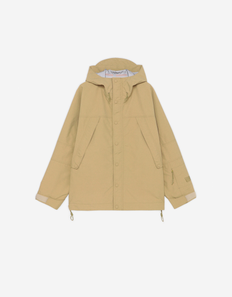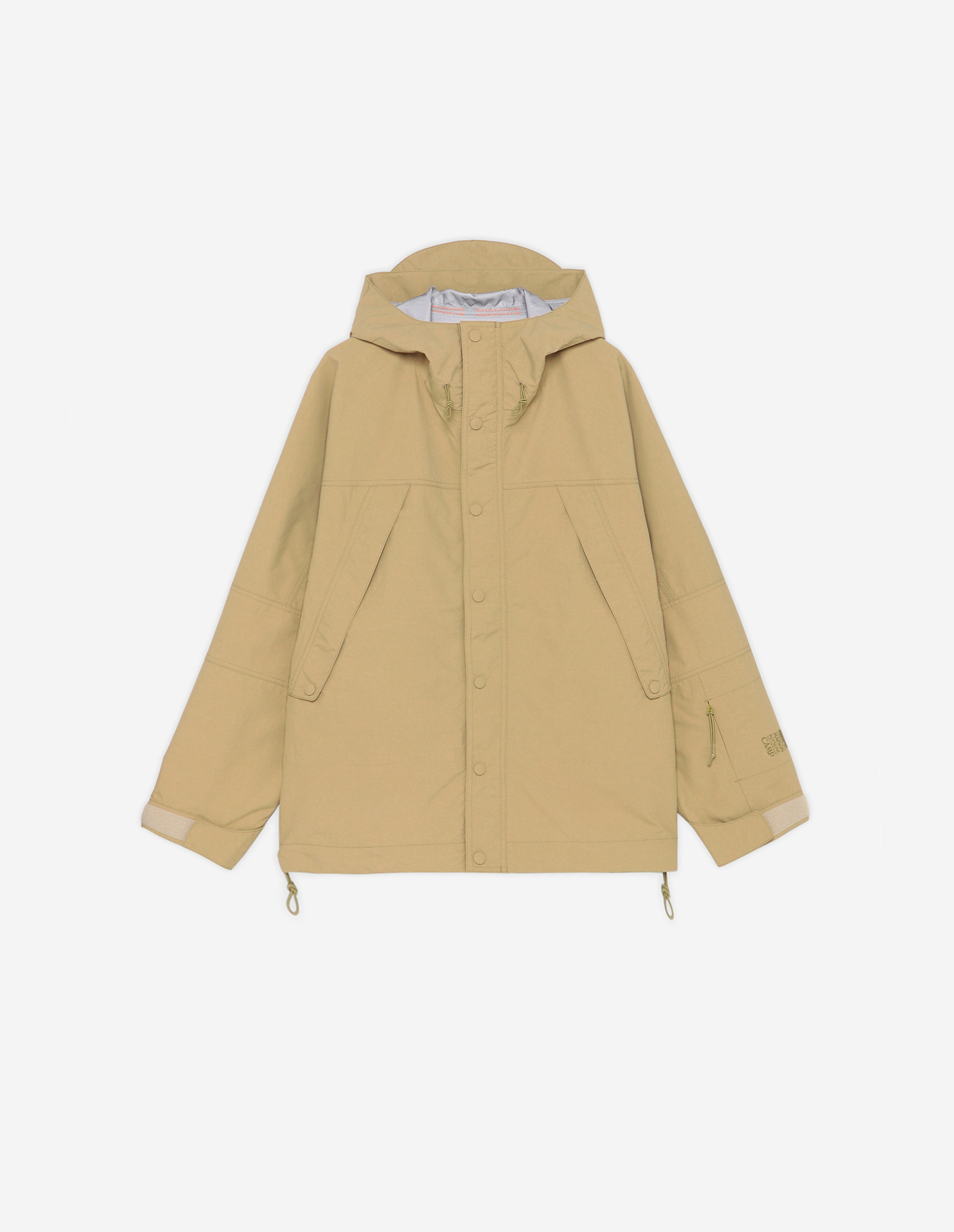 耐水性テクニカルナイロン素材のパーカ。フードと袖口には「MAISON KITSUNÉ CAMP」のロゴプリントが施されています。