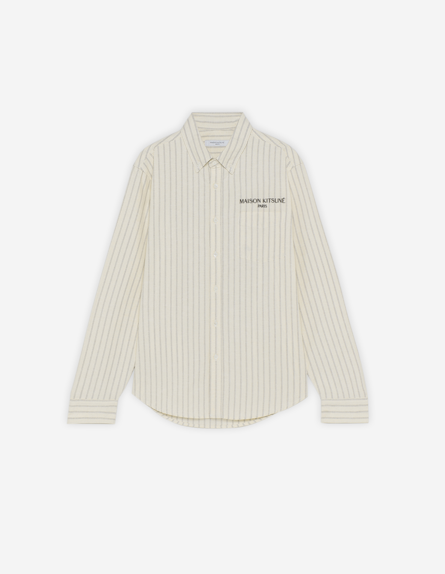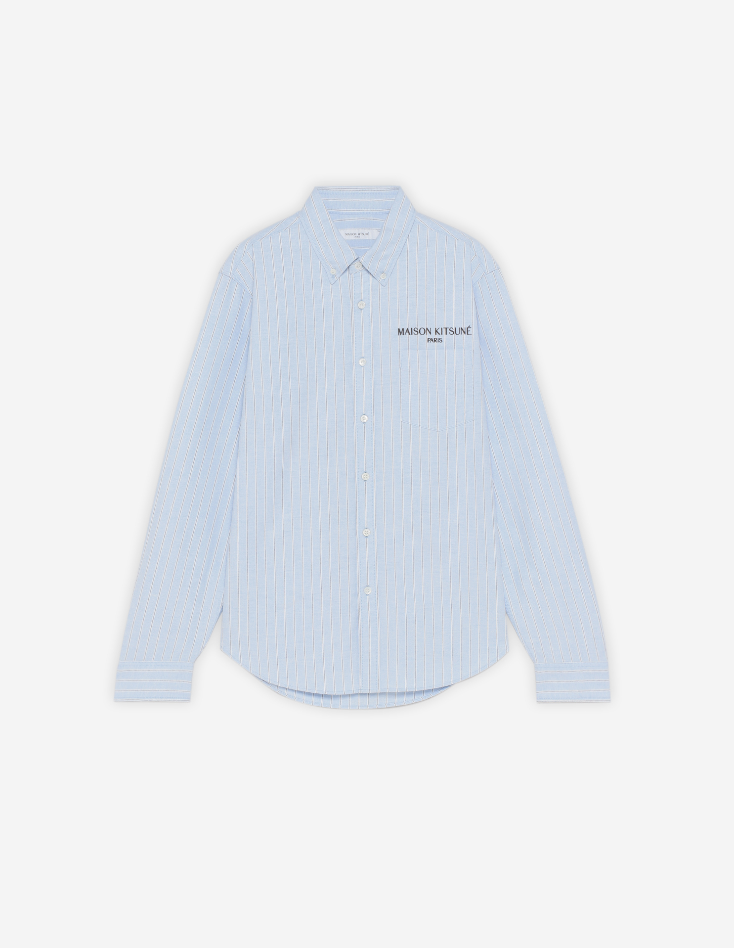 ストライプ柄オックスフォードシャツ。リラックスフィットで、胸元には「MAISON KITSUNÉ PARIS」の刺繍が施されています。