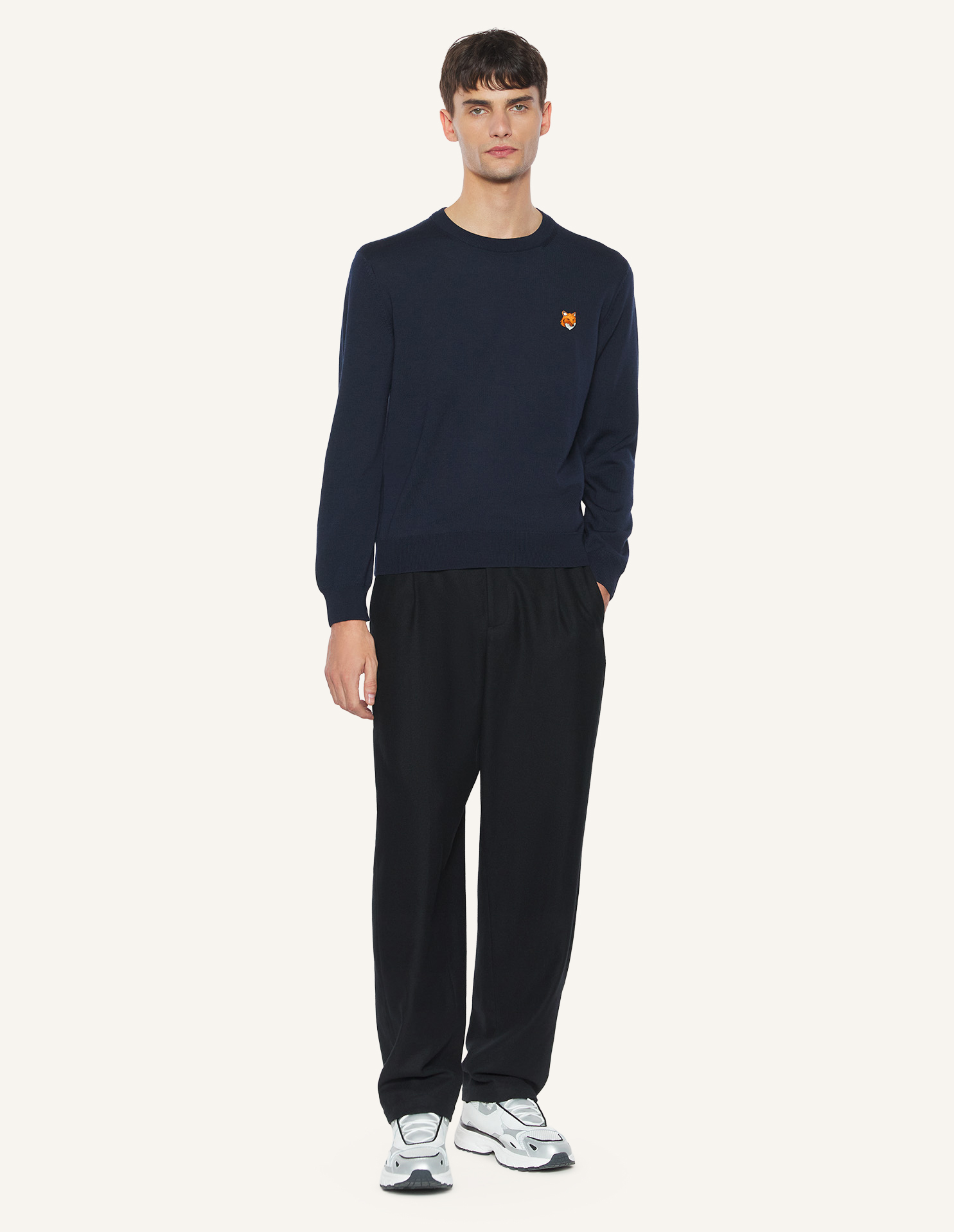 エクストラファインメリノウール長袖プルオーバー。レギュラーフィットで、フォックスヘッドの刺繍パッチが施されています。