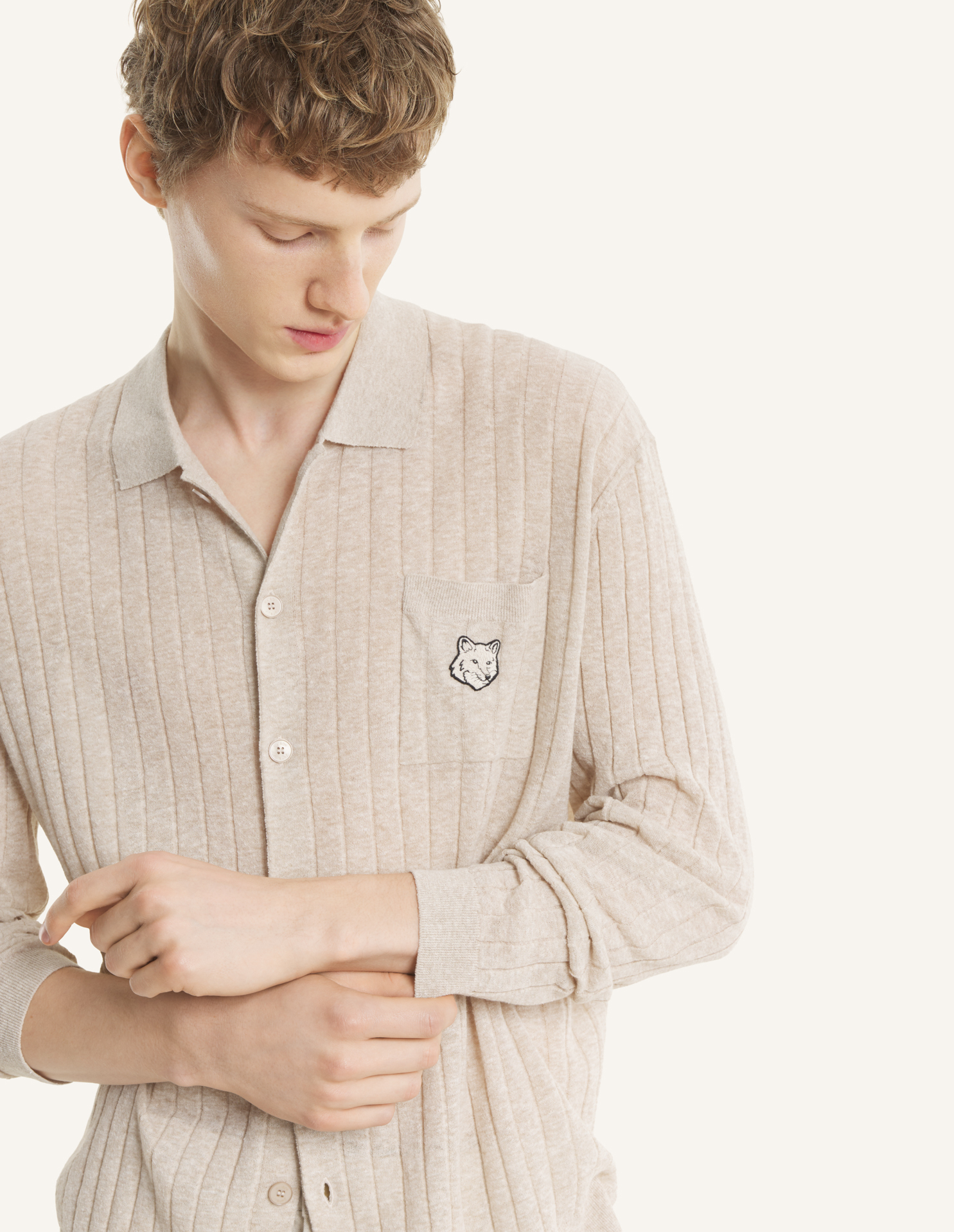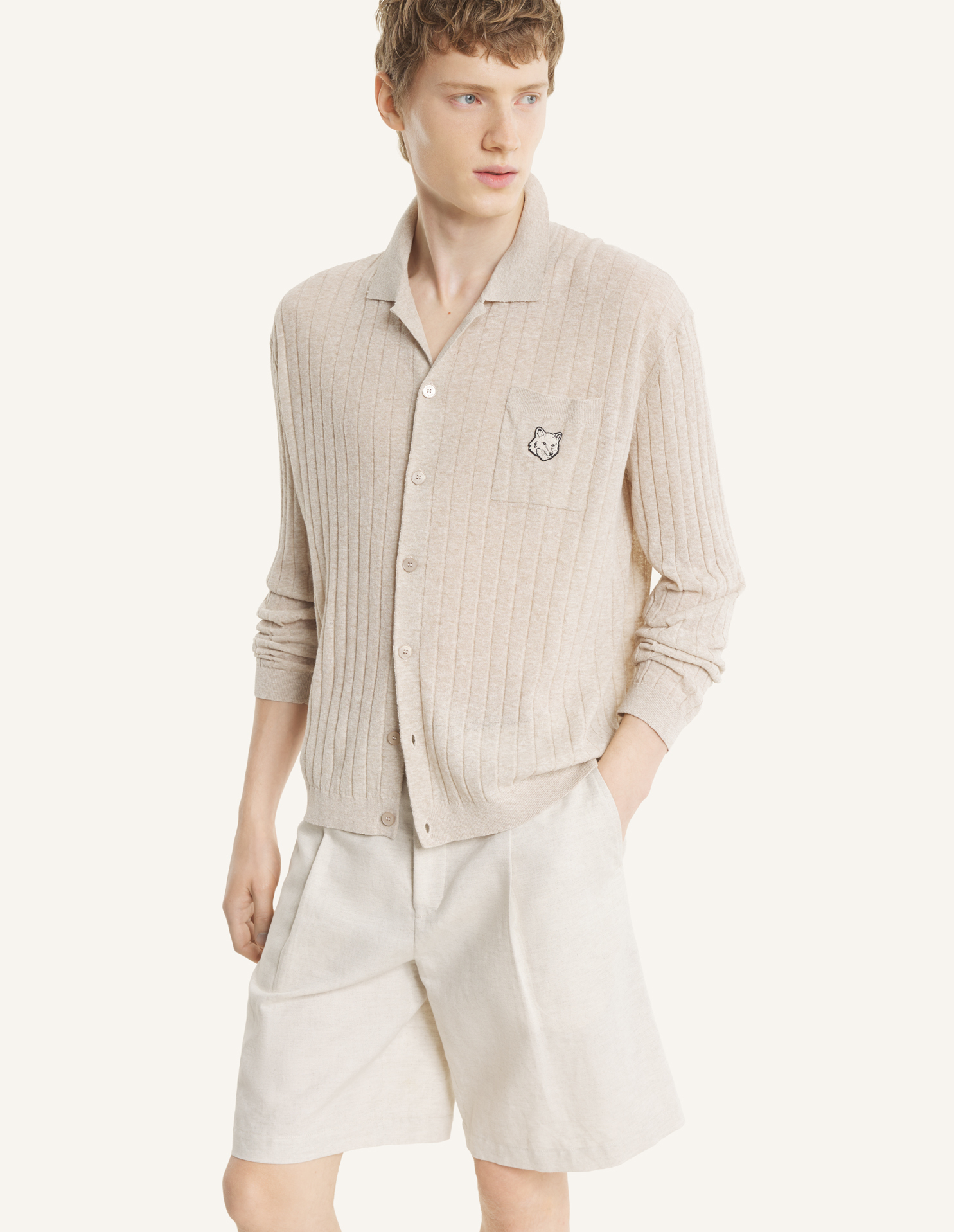 コットンリネンブレンド素材のリブ編みロングスリーブシャツ。リラックスフィットで、胸元にトーナルフォックスヘッドの刺繍パッチが施されています。