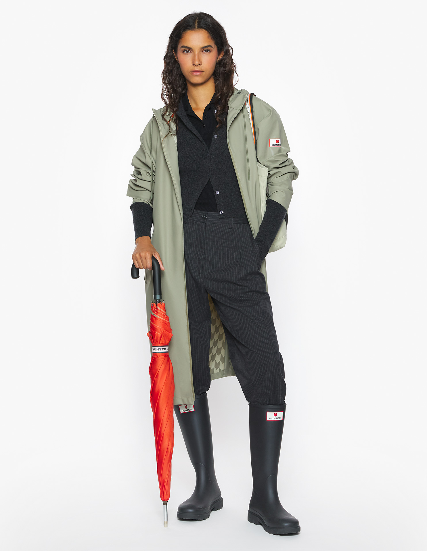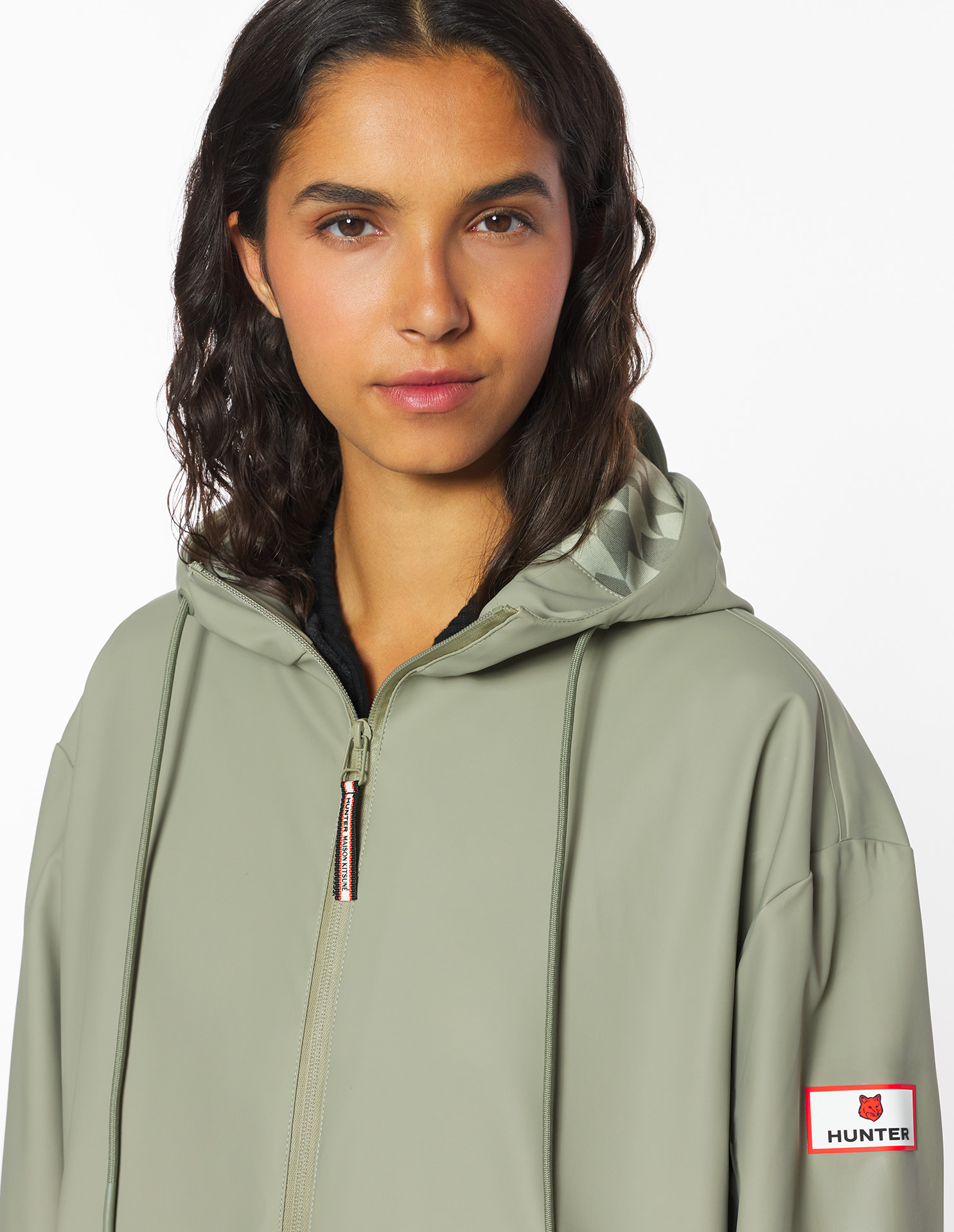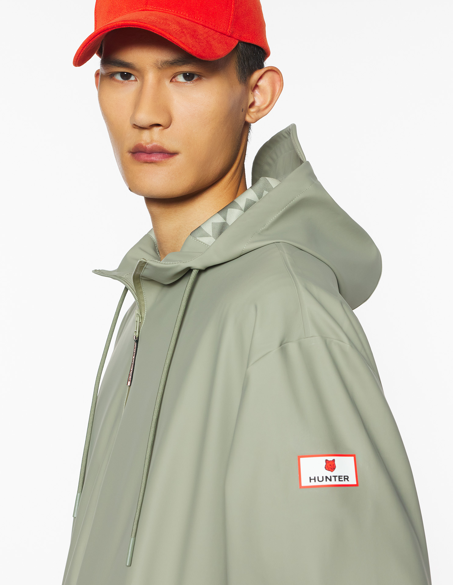 Maison Kitsuné x Hunterの防水コーティングポリエステル製ジップ付きレインケープ。オーバーサイズフィットで、袖に「Maison Kitsuné × Hunter」のコーブランドロゴラバーパッチが施されています。