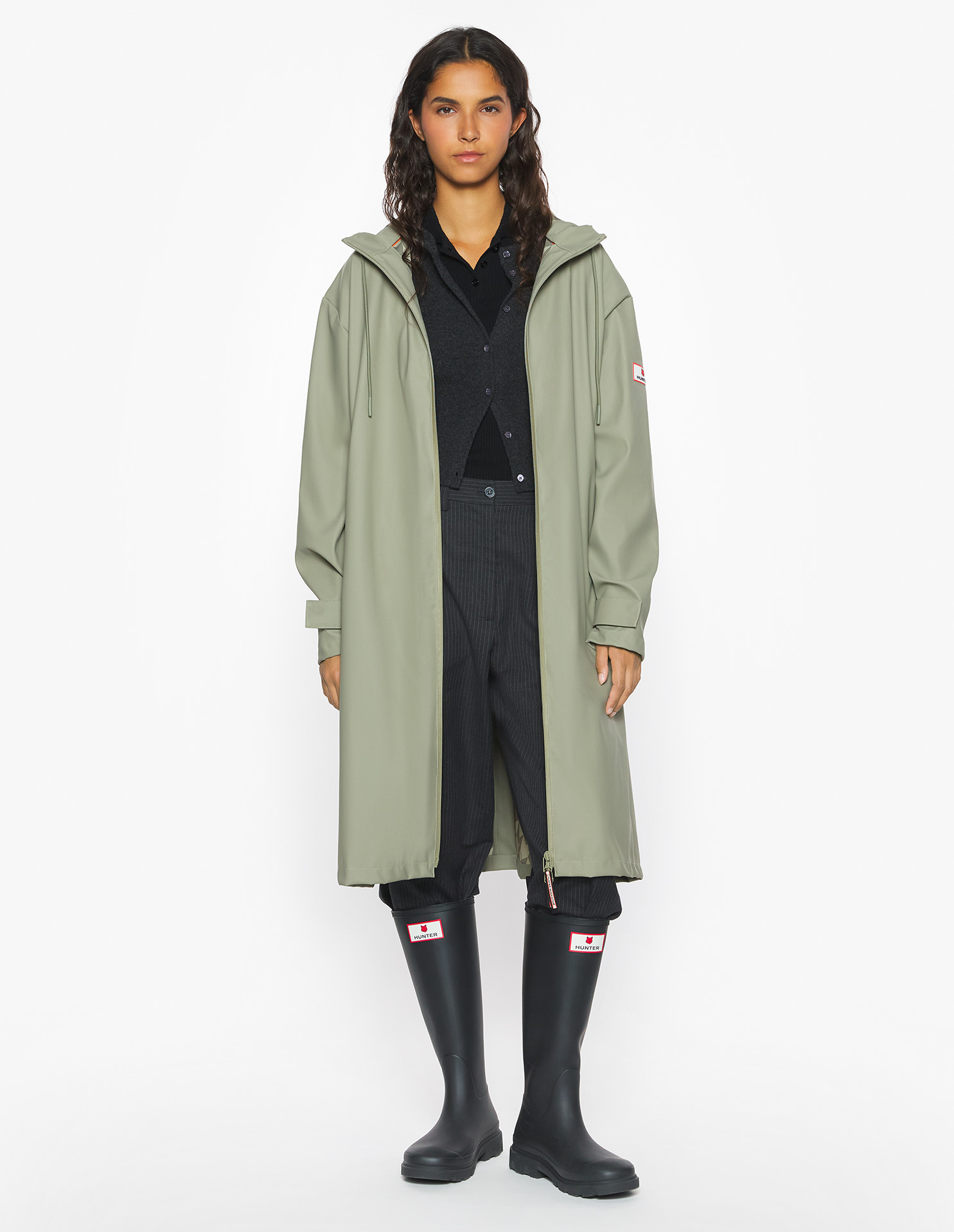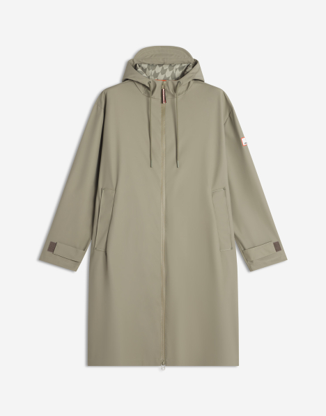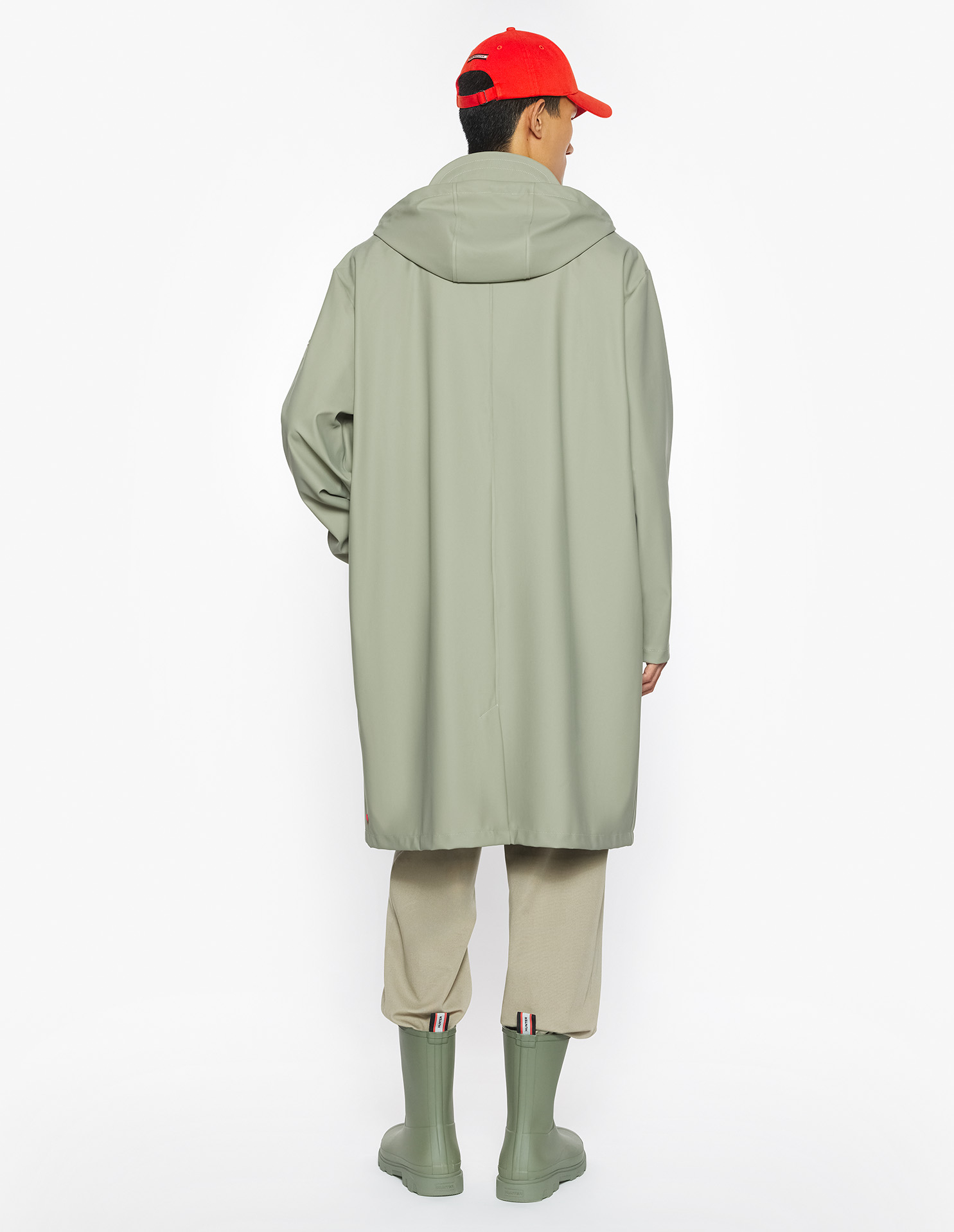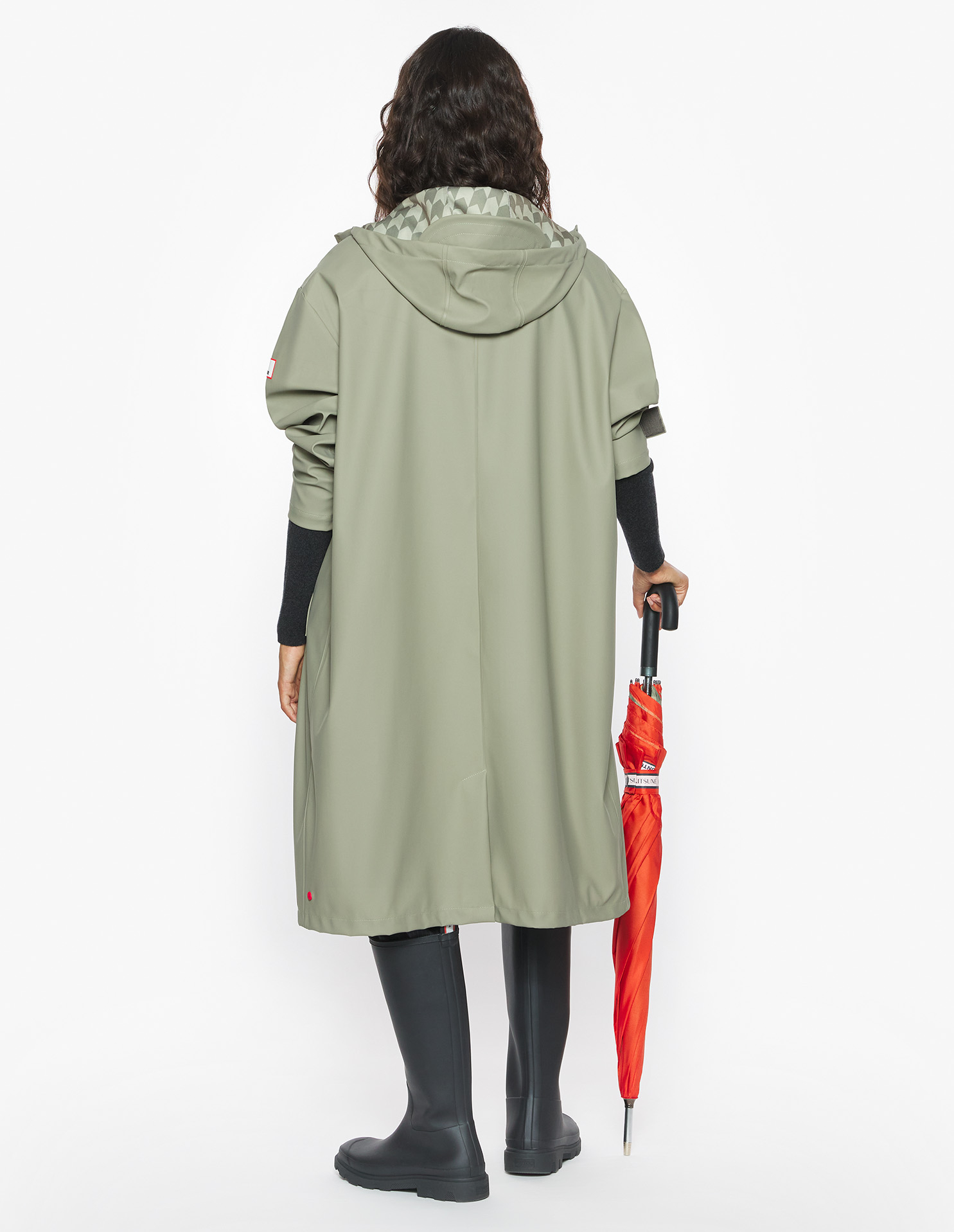 Maison Kitsuné x Hunterの防水コーティングポリエステル製ジップ付きレインケープ。オーバーサイズフィットで、袖に「Maison Kitsuné × Hunter」のコーブランドロゴラバーパッチが施されています。