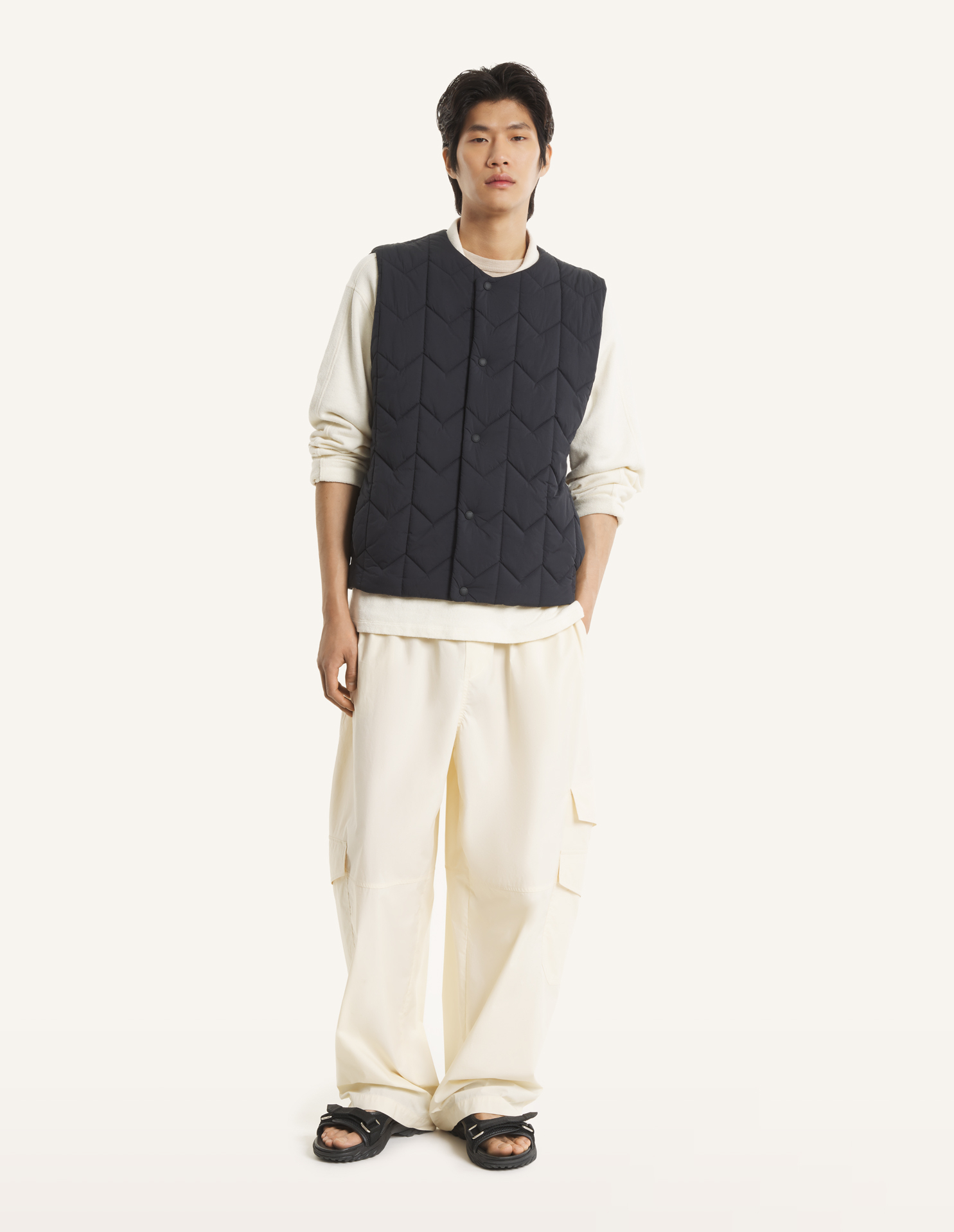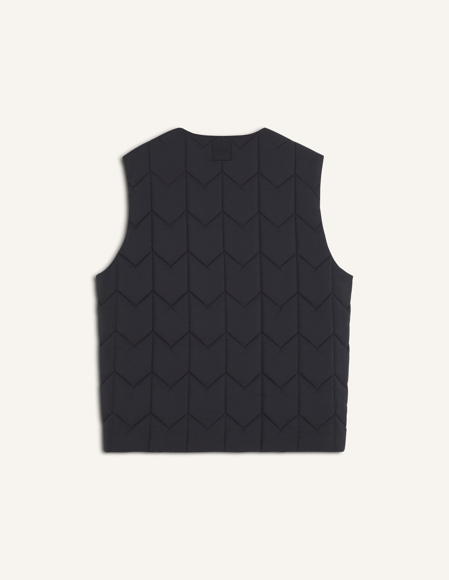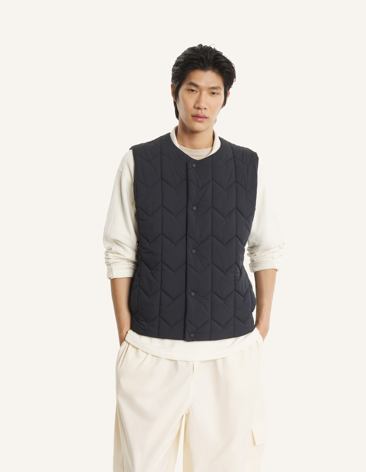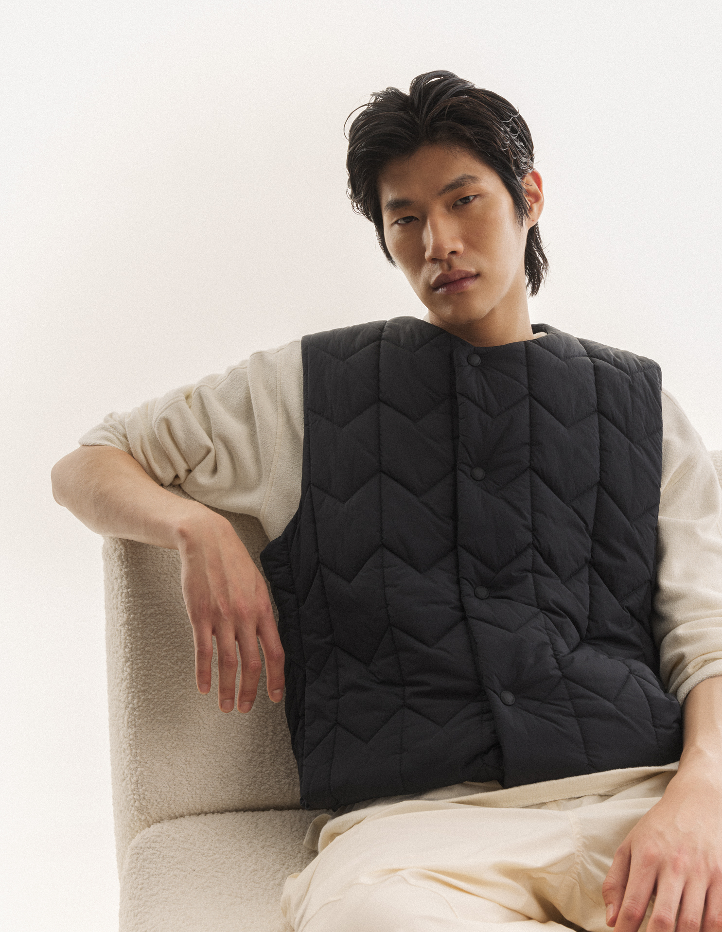 撥水キルティングナイロン素材のベスト。ストレートフィットで、後ろの襟ぐりに「MAISON KITSUNE PARIS」ロゴのシリコンパッチが施されています。