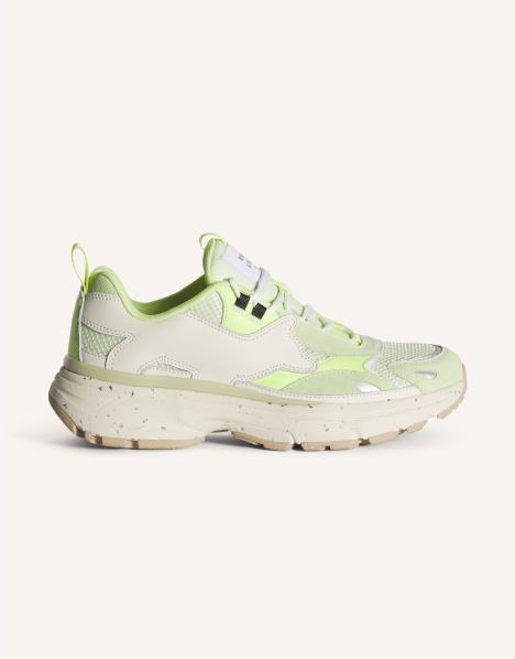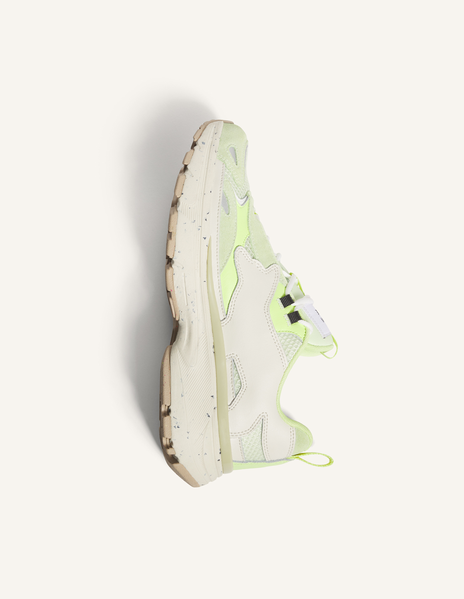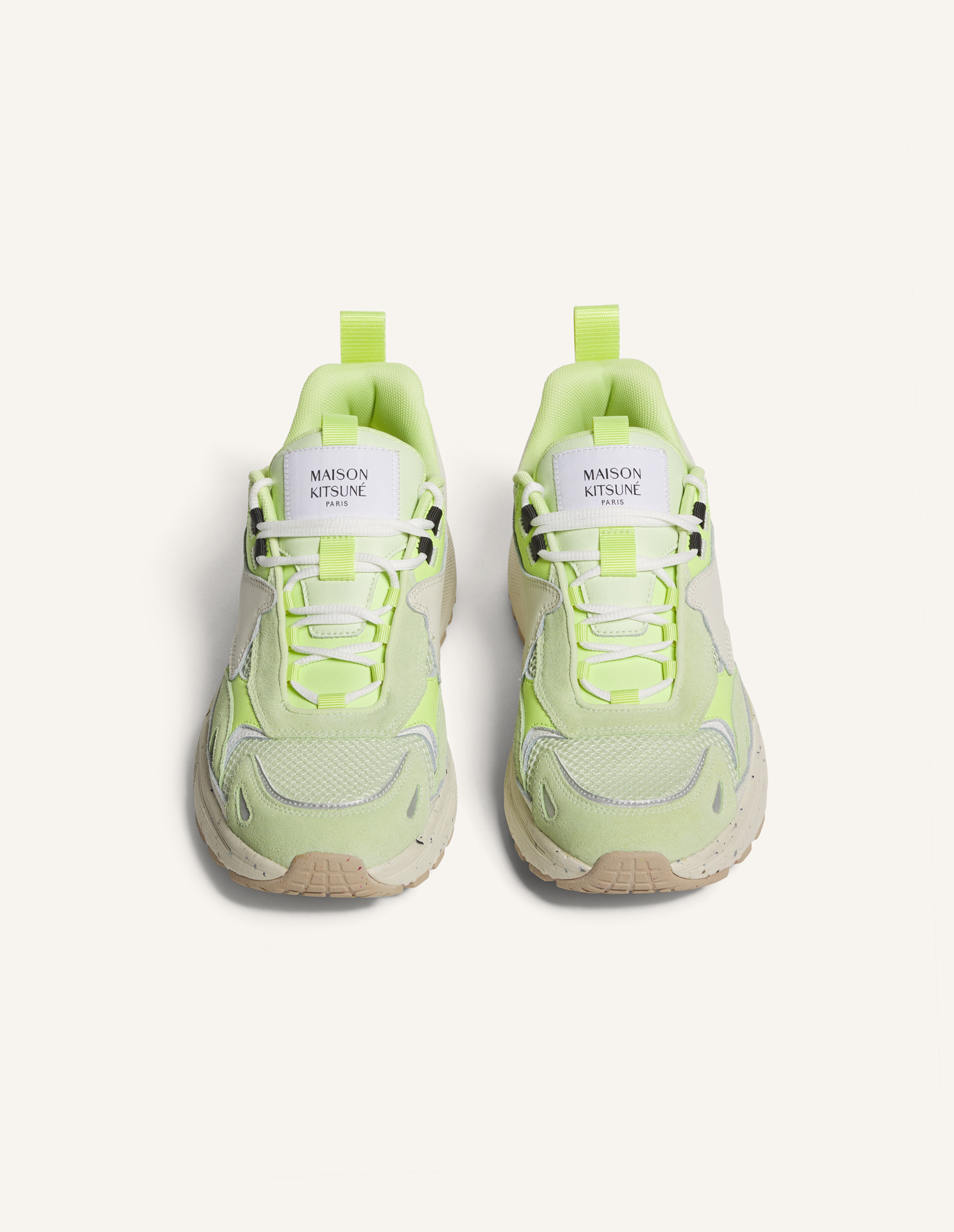 メッシュ、テクニカルファブリック、レザー素材の「Sora」ランナー。ローカットで、サイドにプロフィールフォックスのパネルアップリケが施されています。