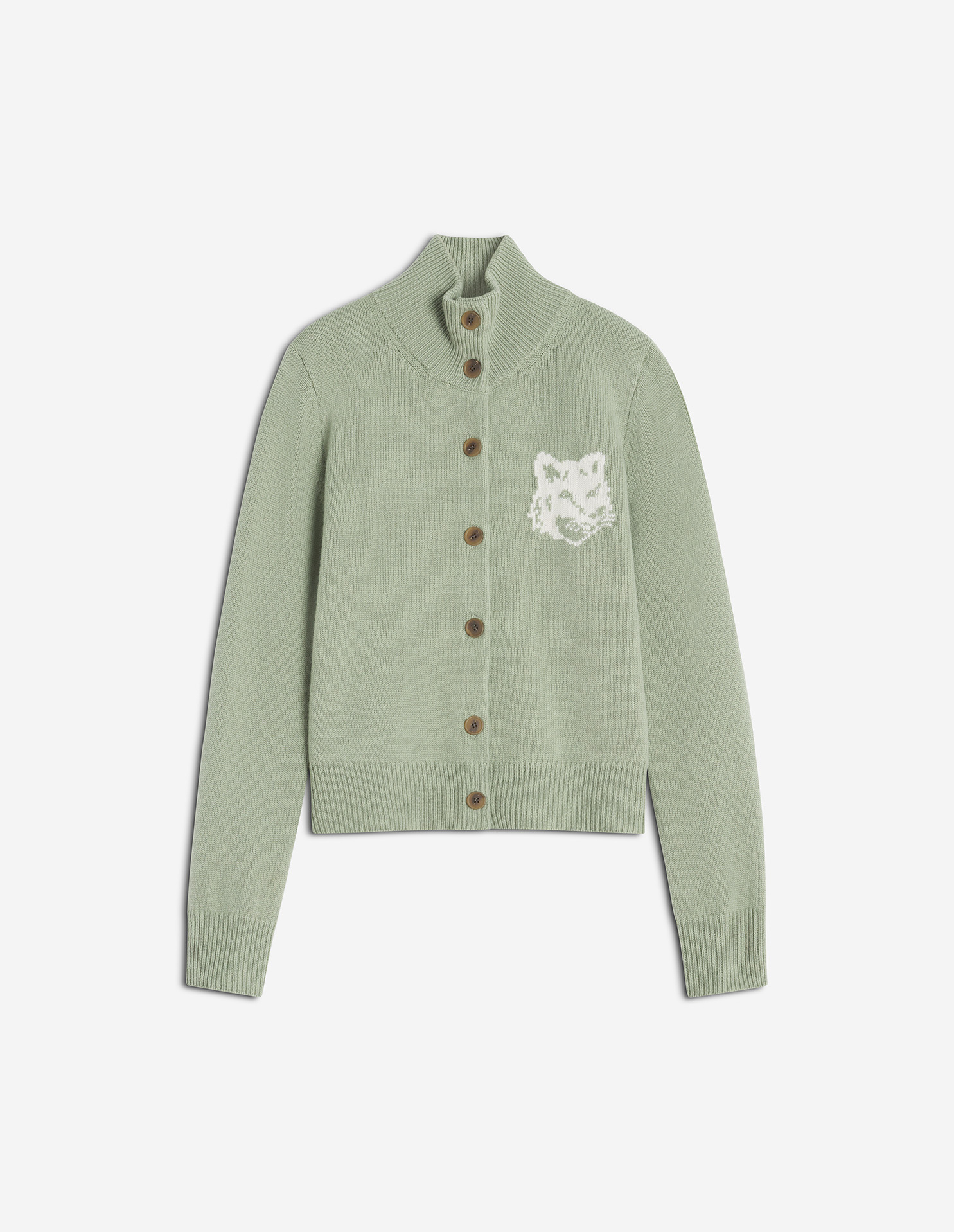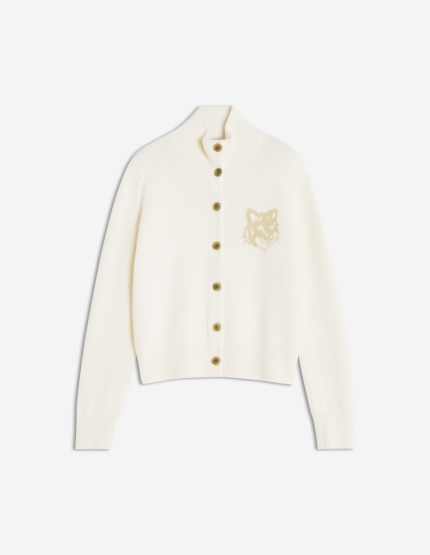 Merino wool cardigan with high neck. Regular fit with Fox Head intarsia on the chest.