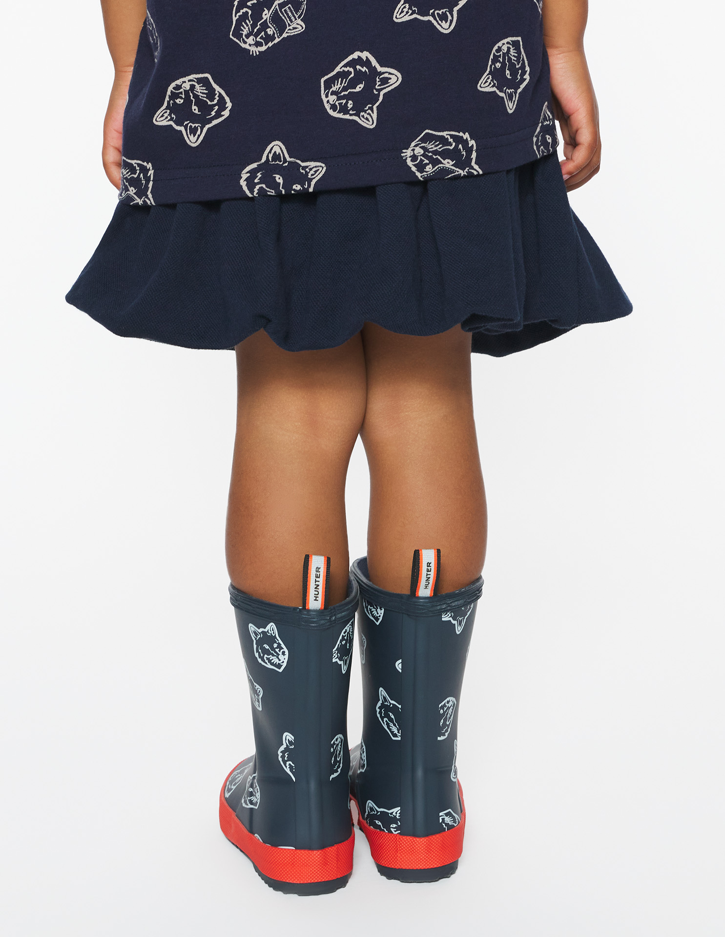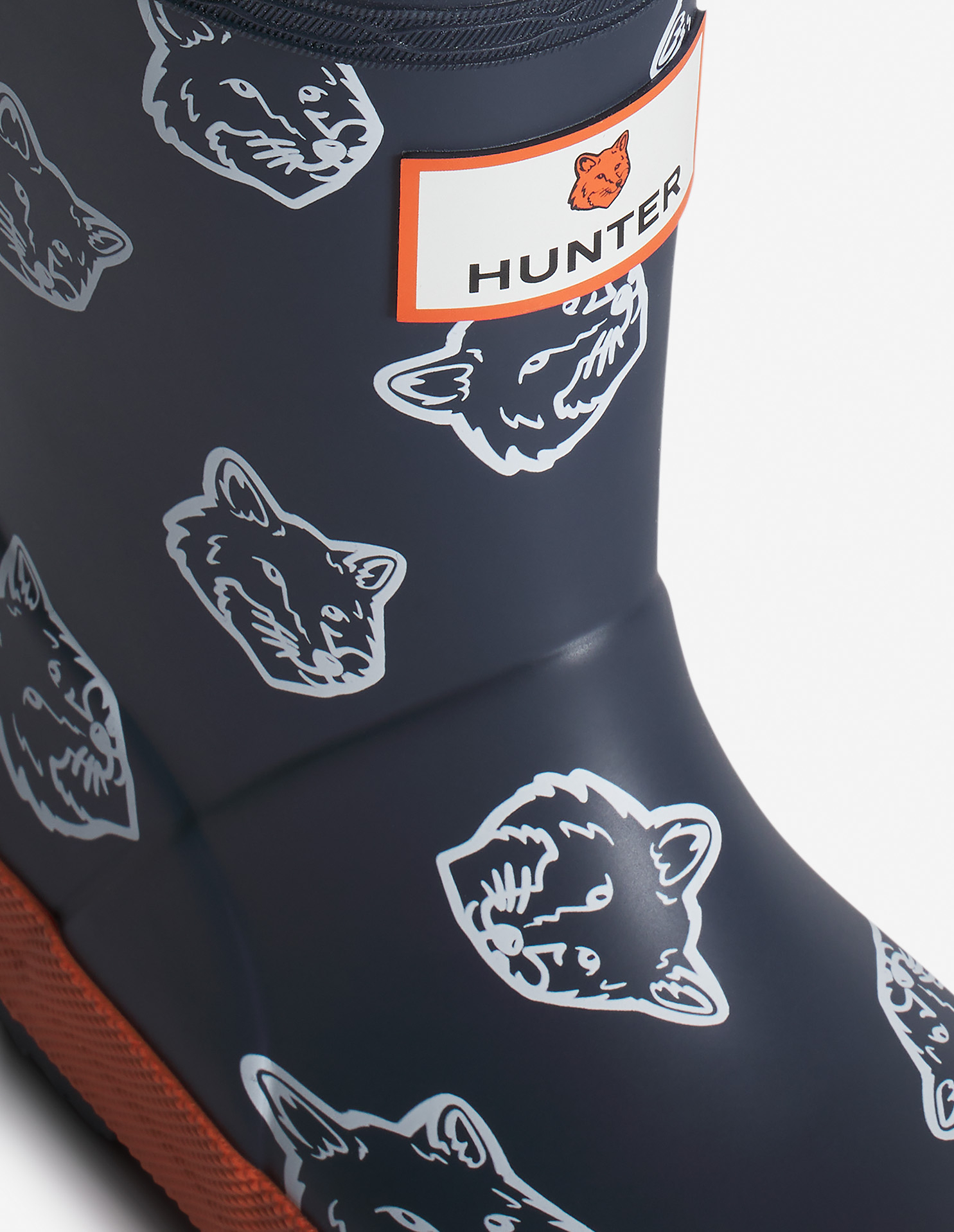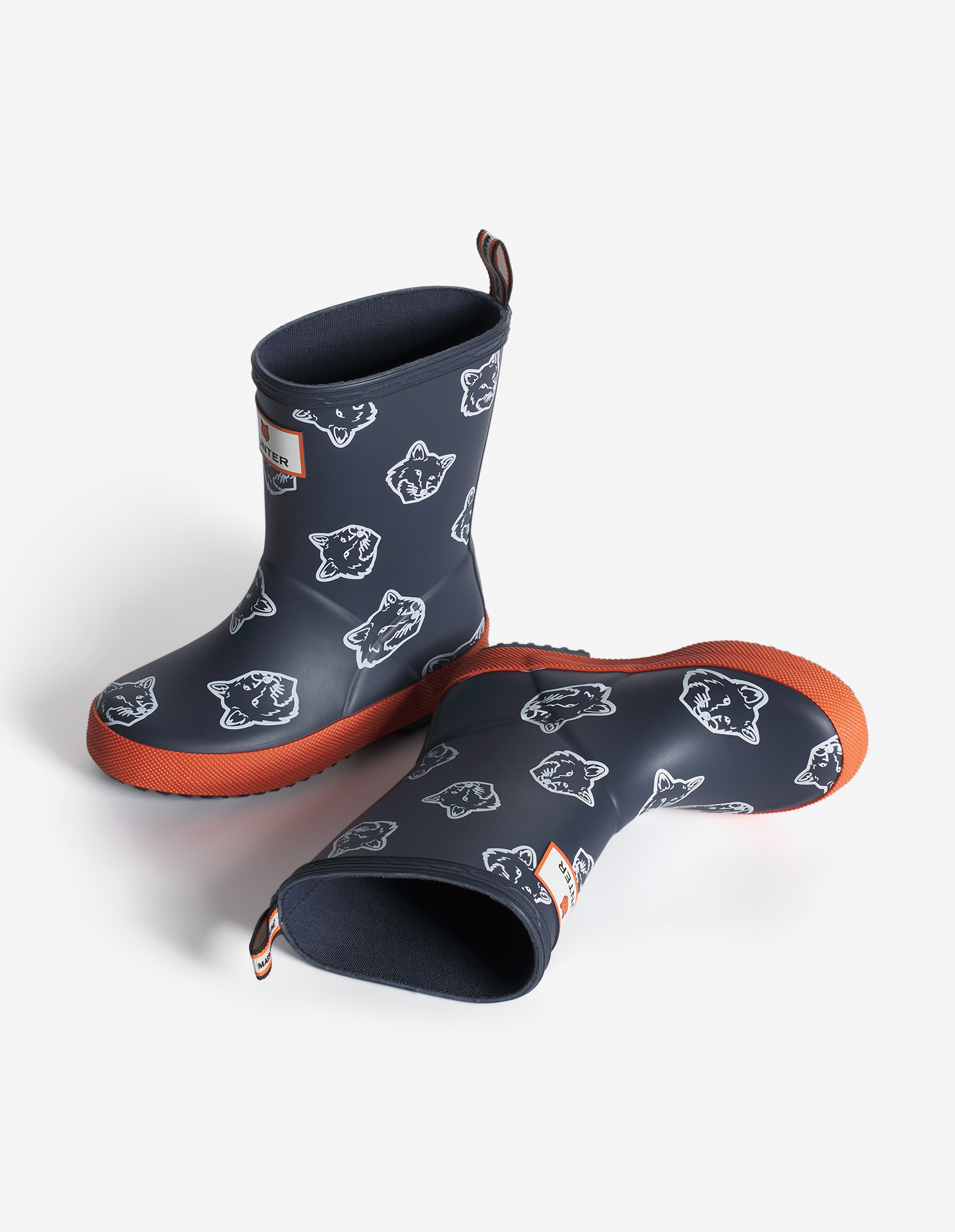 Waterproof rubber boots for kids with Fox Head print all-over. Maison Kitsuné x Hunter collaboration.