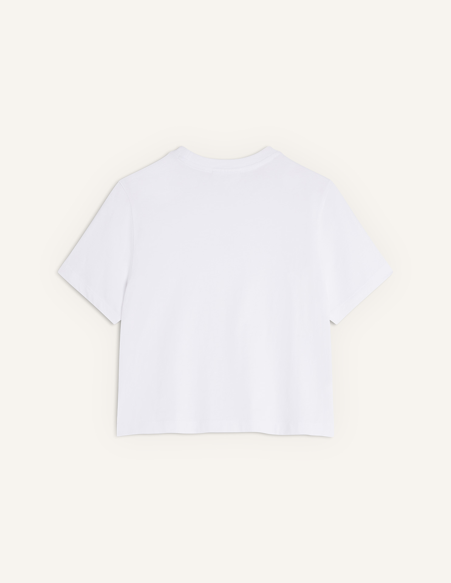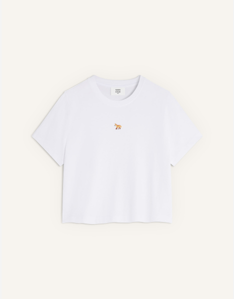 면 저지(180g) 소재의 반소매 티셔츠. 가슴 부분에 베이비 폭스 자수 패치가 장식된 크롭핏입니다.