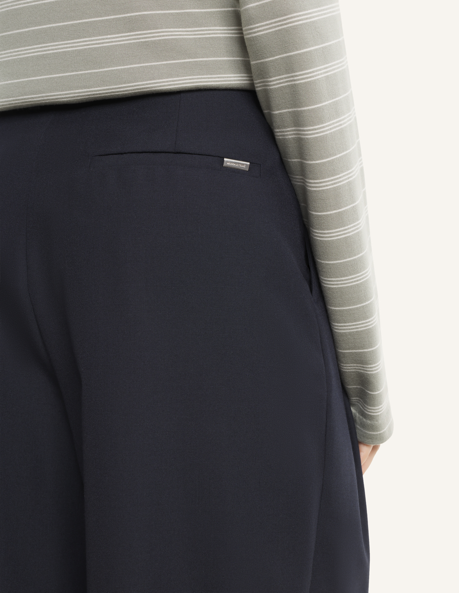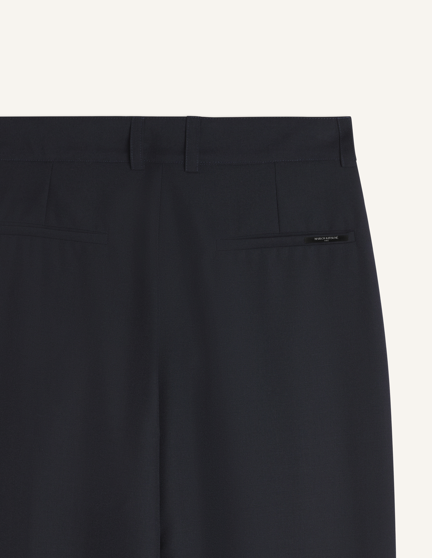 가벼운 울 혼방 소재의 캐롯 플리츠 팬츠. 뒷면에 메종키츠네 파리 우븐 라벨이 있습니다.