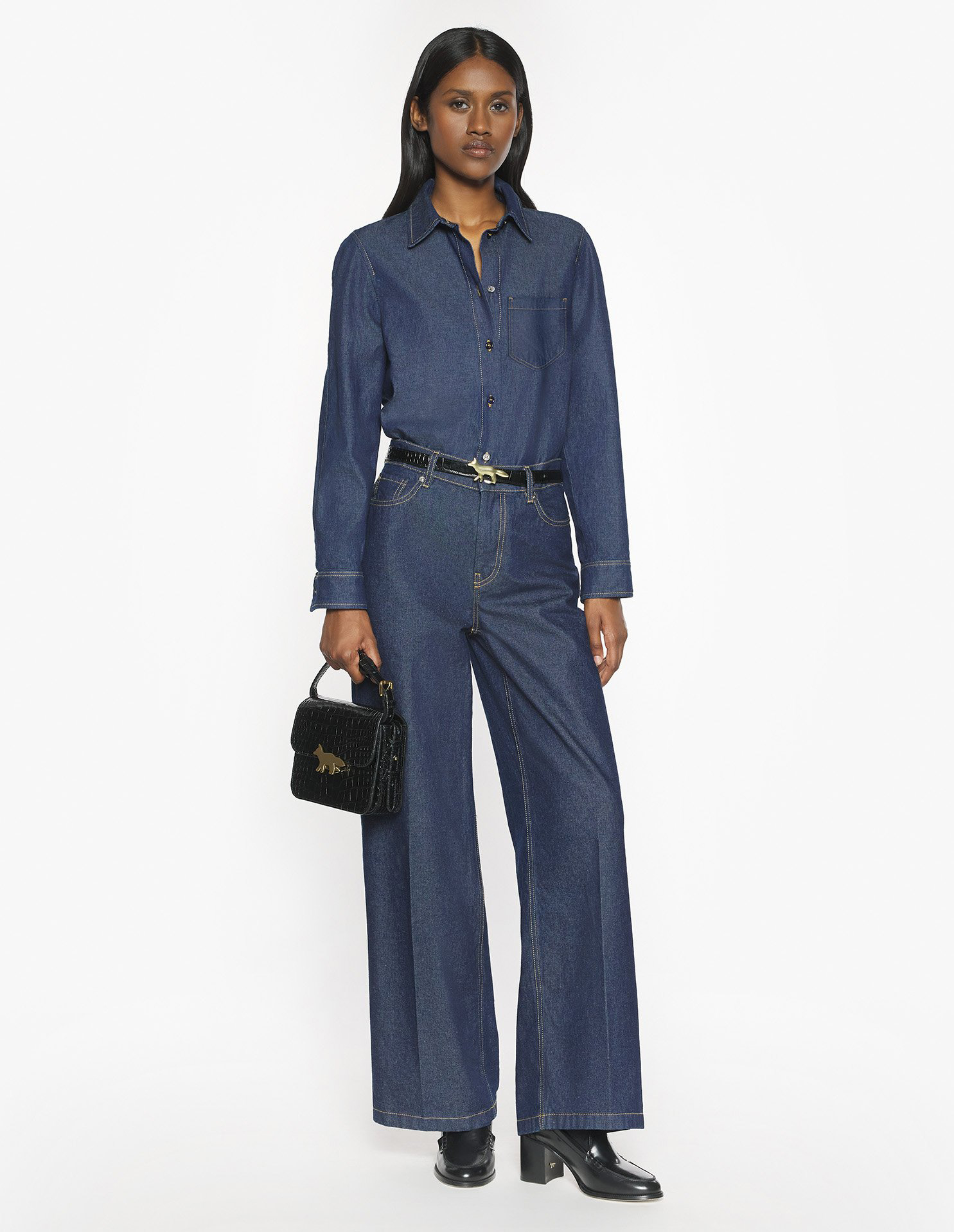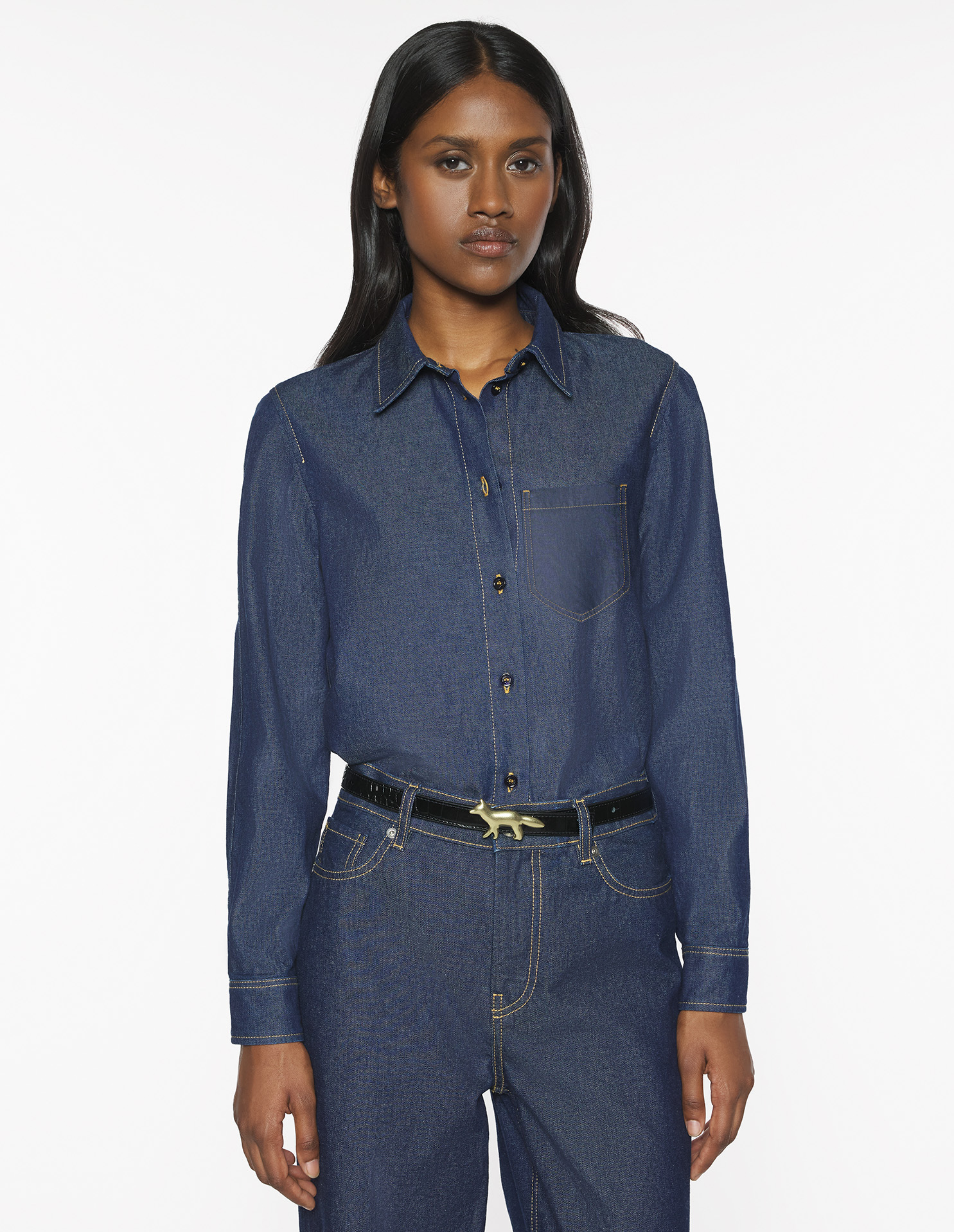 가벼운 일본산 데님 셔츠, 편안한 핏, 대비 스티치, 메종키츠네 각인 버튼.