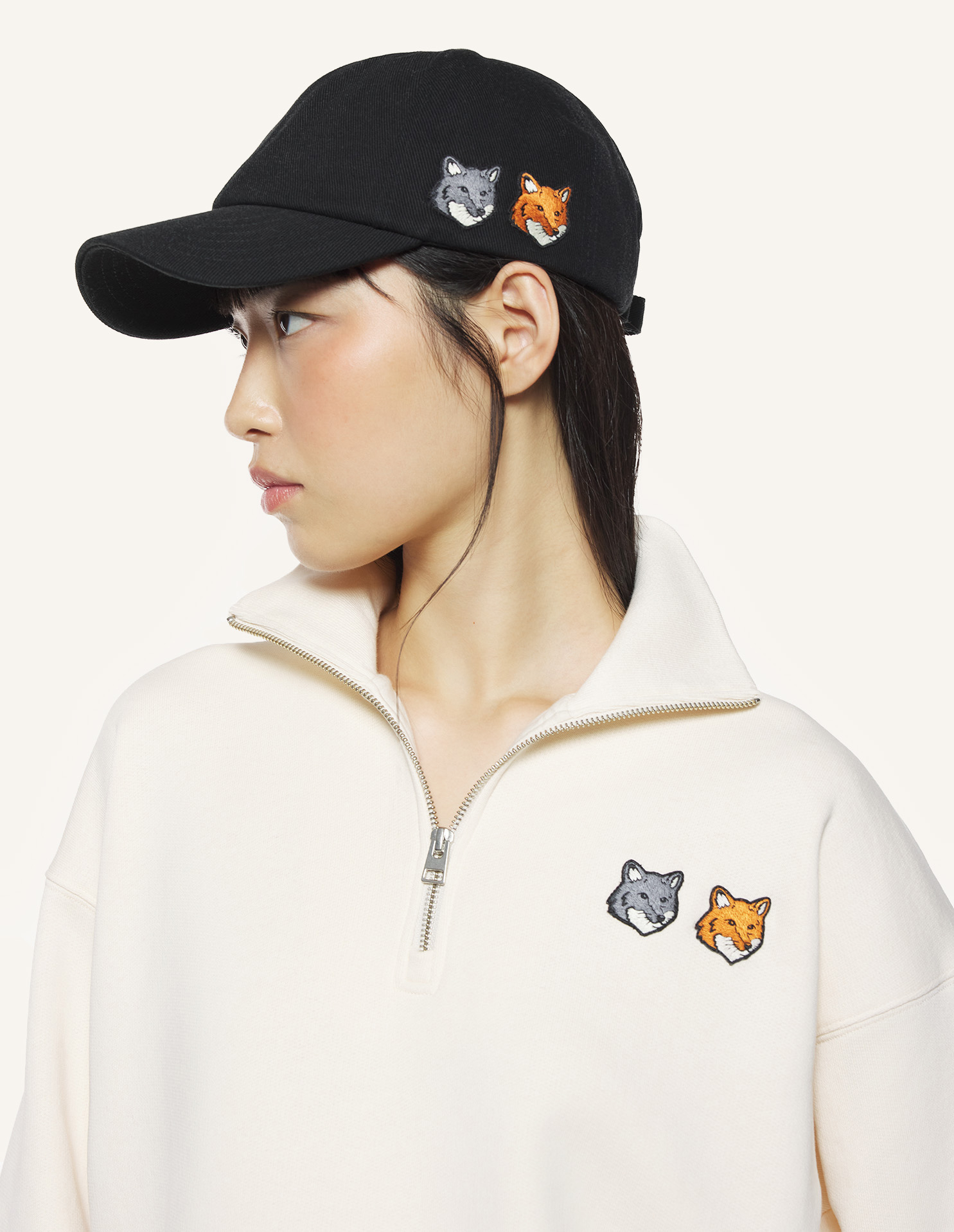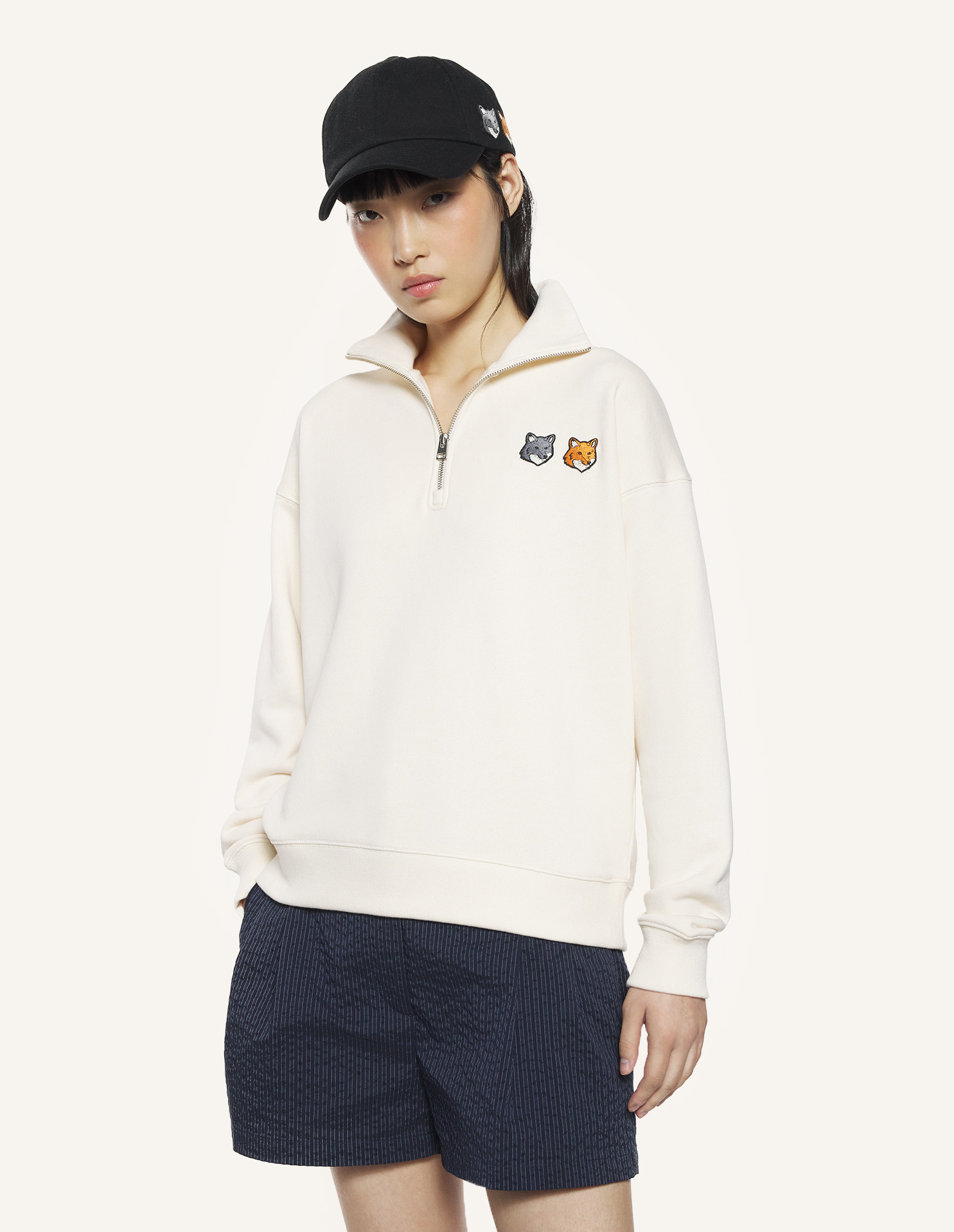 플리스 소재의 하프 집업 스웻셔츠. 가슴에 더블 폭스헤드 자수 패치가 더해진 컴포트핏입니다.