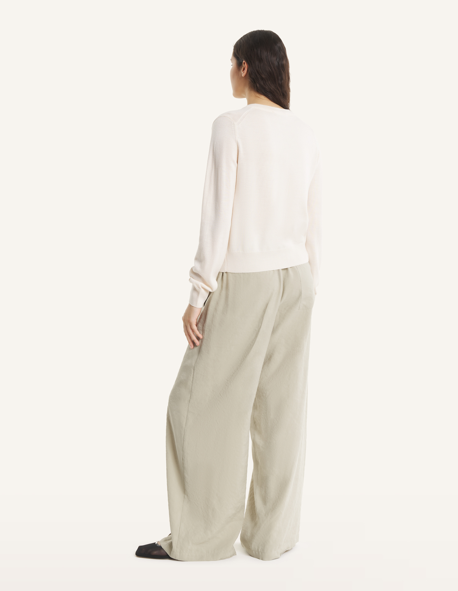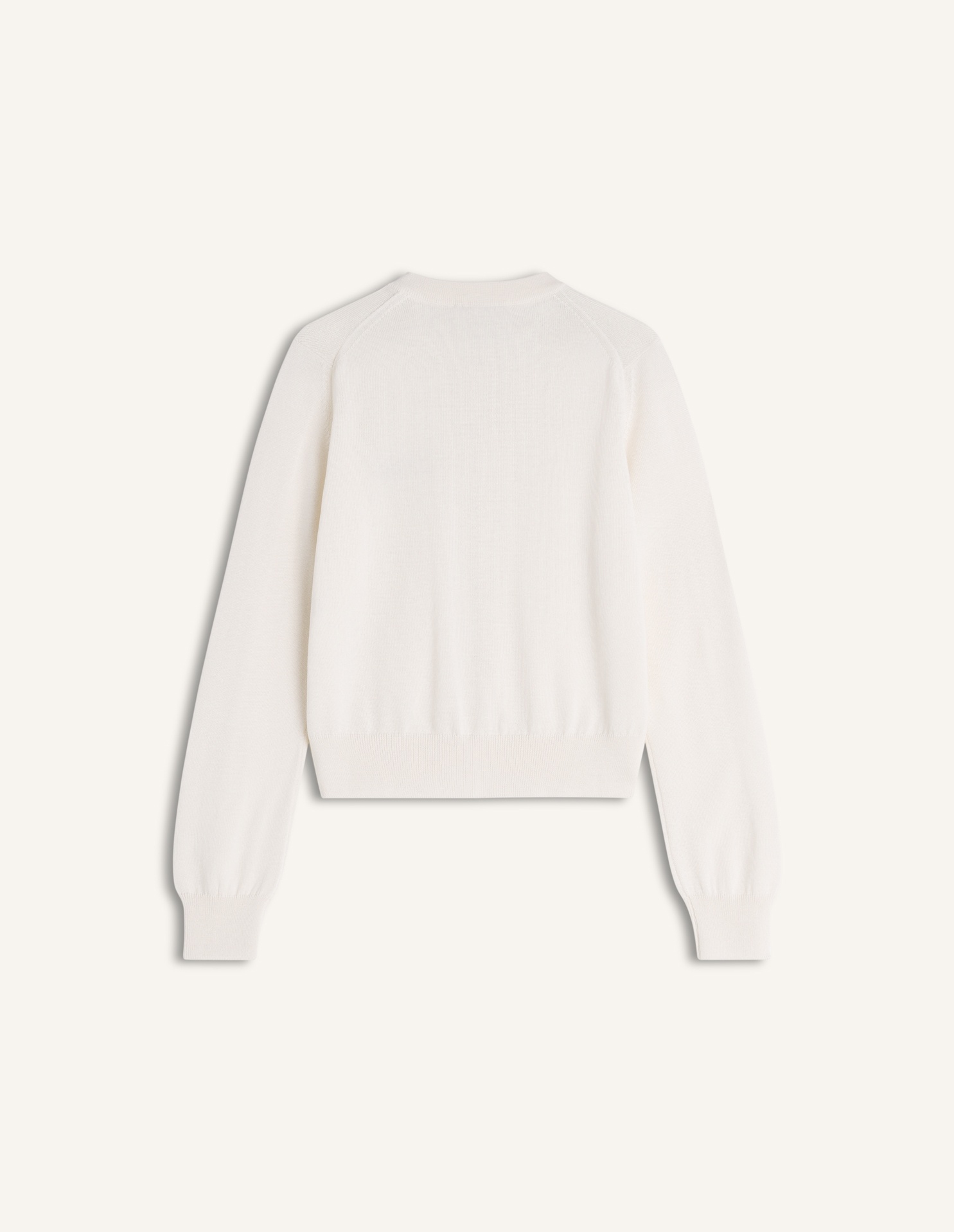 메리노 울 소재의 가디건. 가슴 부분에 더블 폭스헤드 자수 패치가 장식된 레귤러핏.