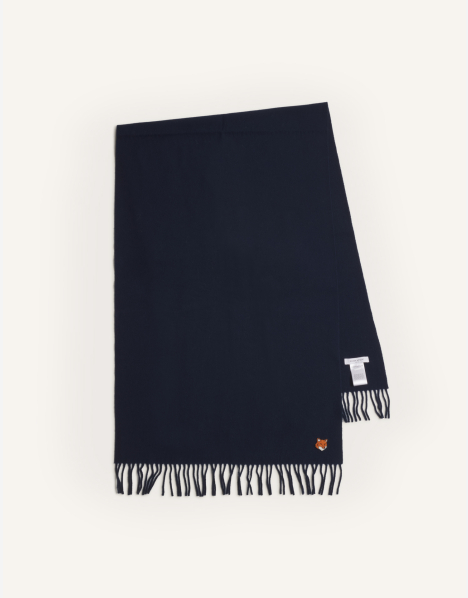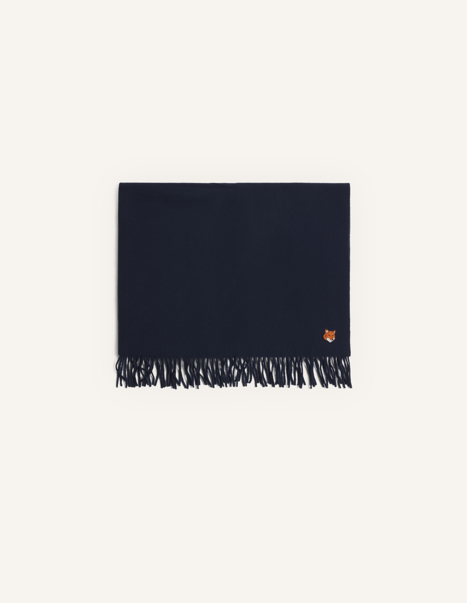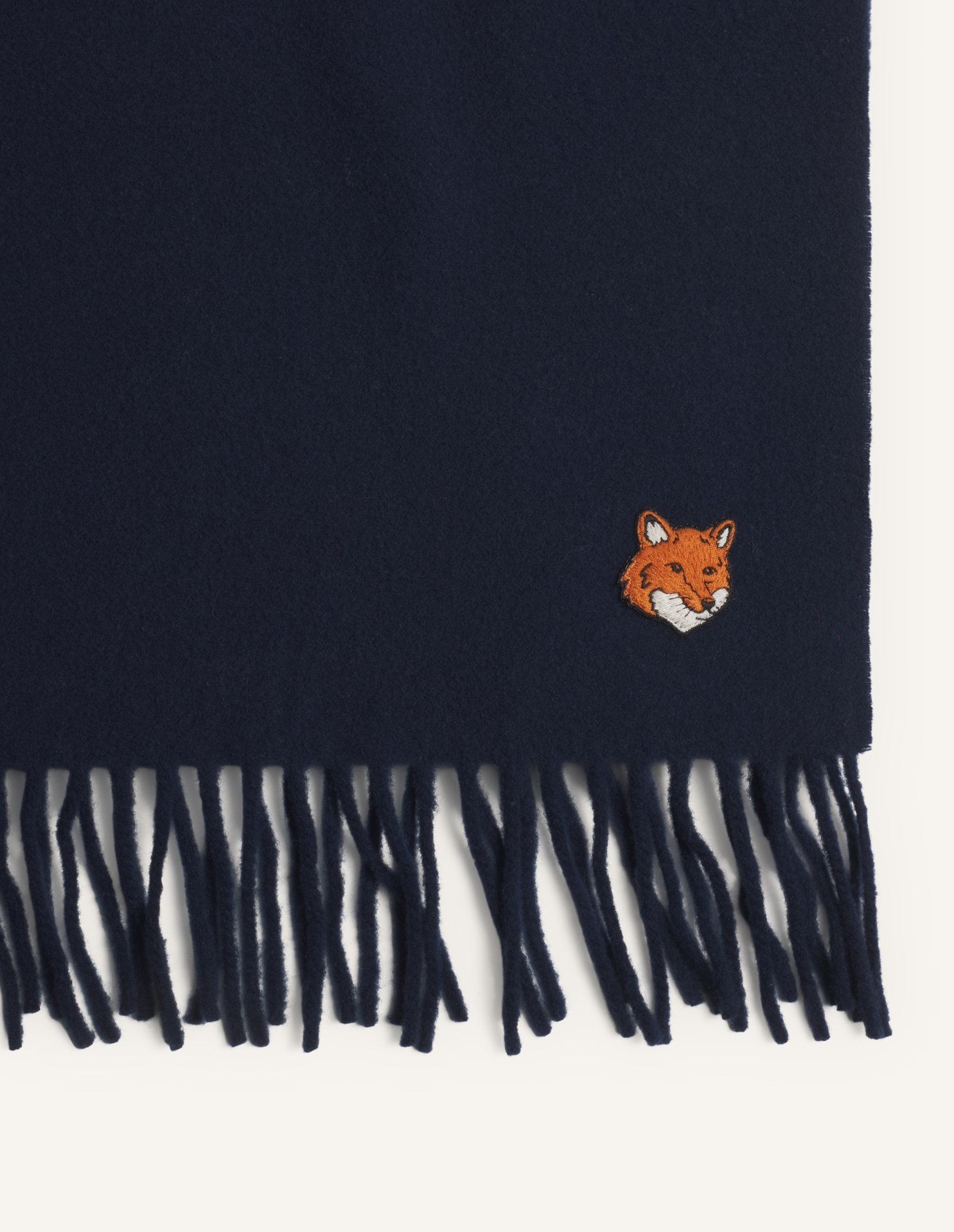 버진 울 소재의 스카프. 가장자리에 폭스헤드 패치가 자수되어 있습니다.