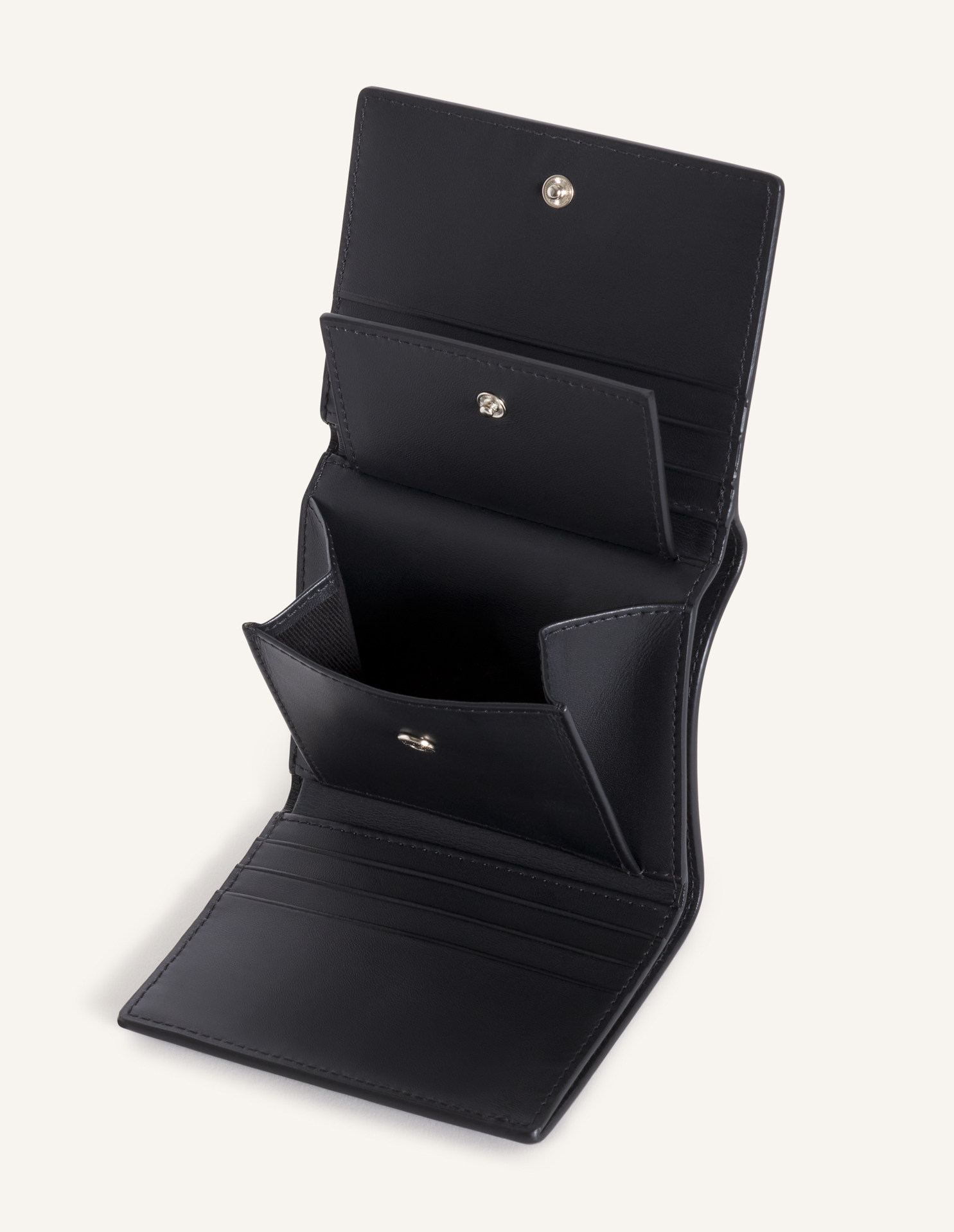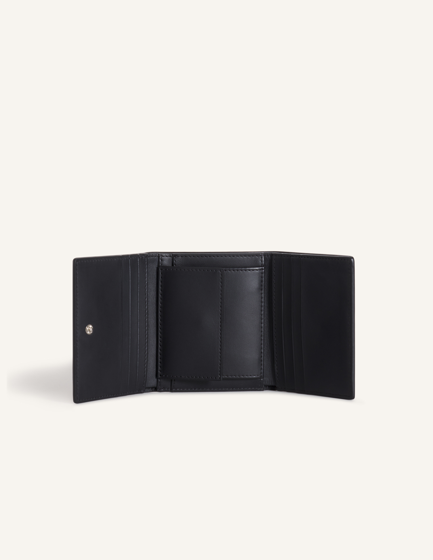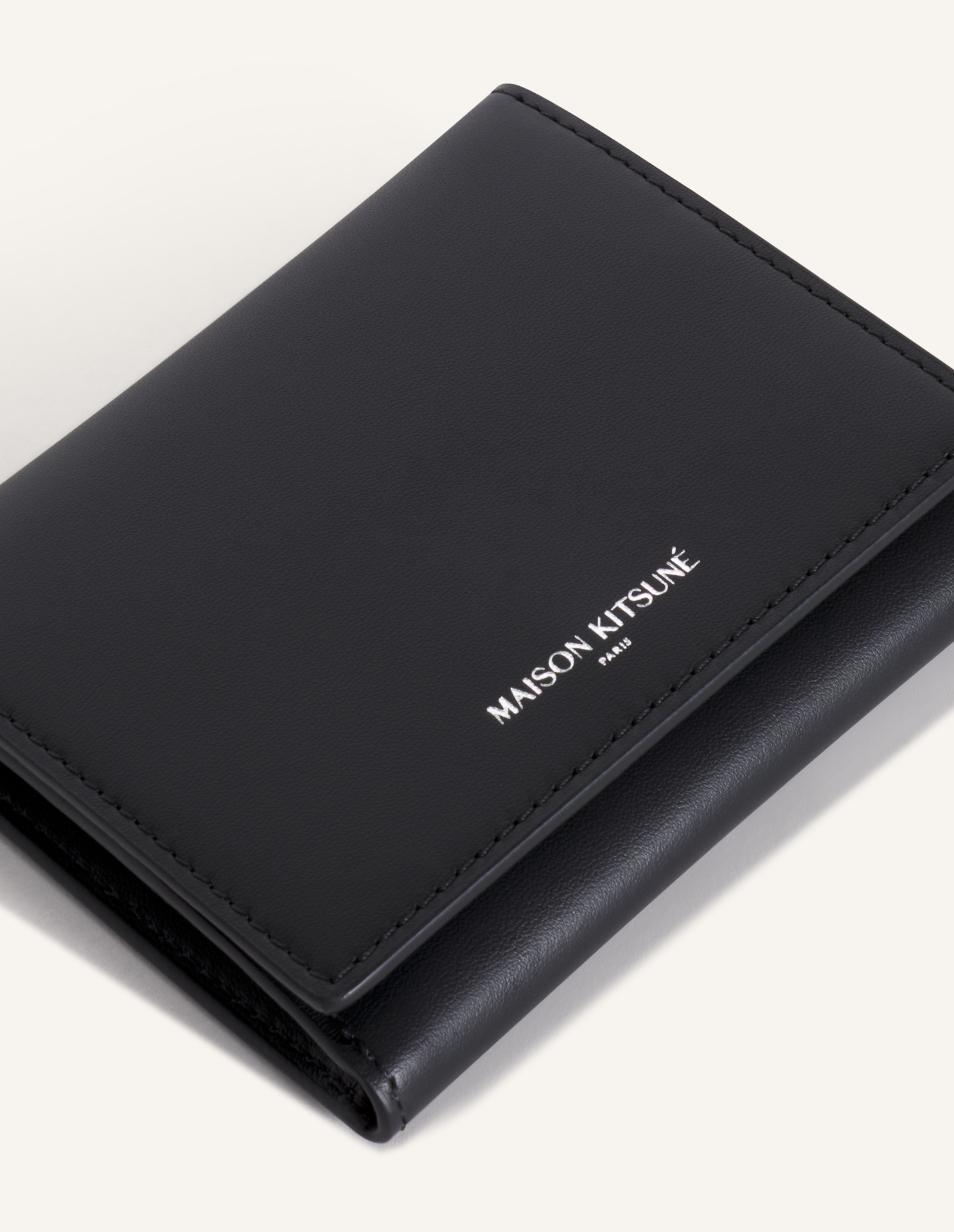 부드러운 그레인 가죽 소재의 3단 지갑. 앞면에 엠보싱 처리된 메종키츠네 파리 로고.