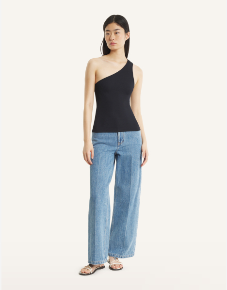 일본산 헤비웨이트 데님 소재의 와이드 레그 진. 뒷면 허리 라인의 가죽 자크론에 메종키츠네 파리 메탈 리벳이 장식되어 있습니다.