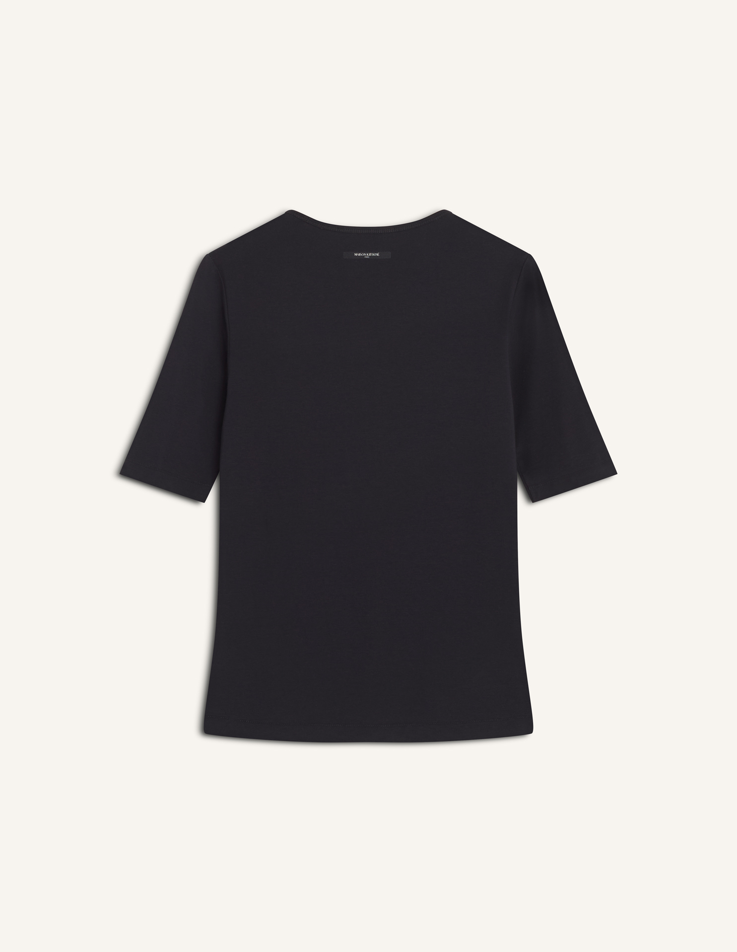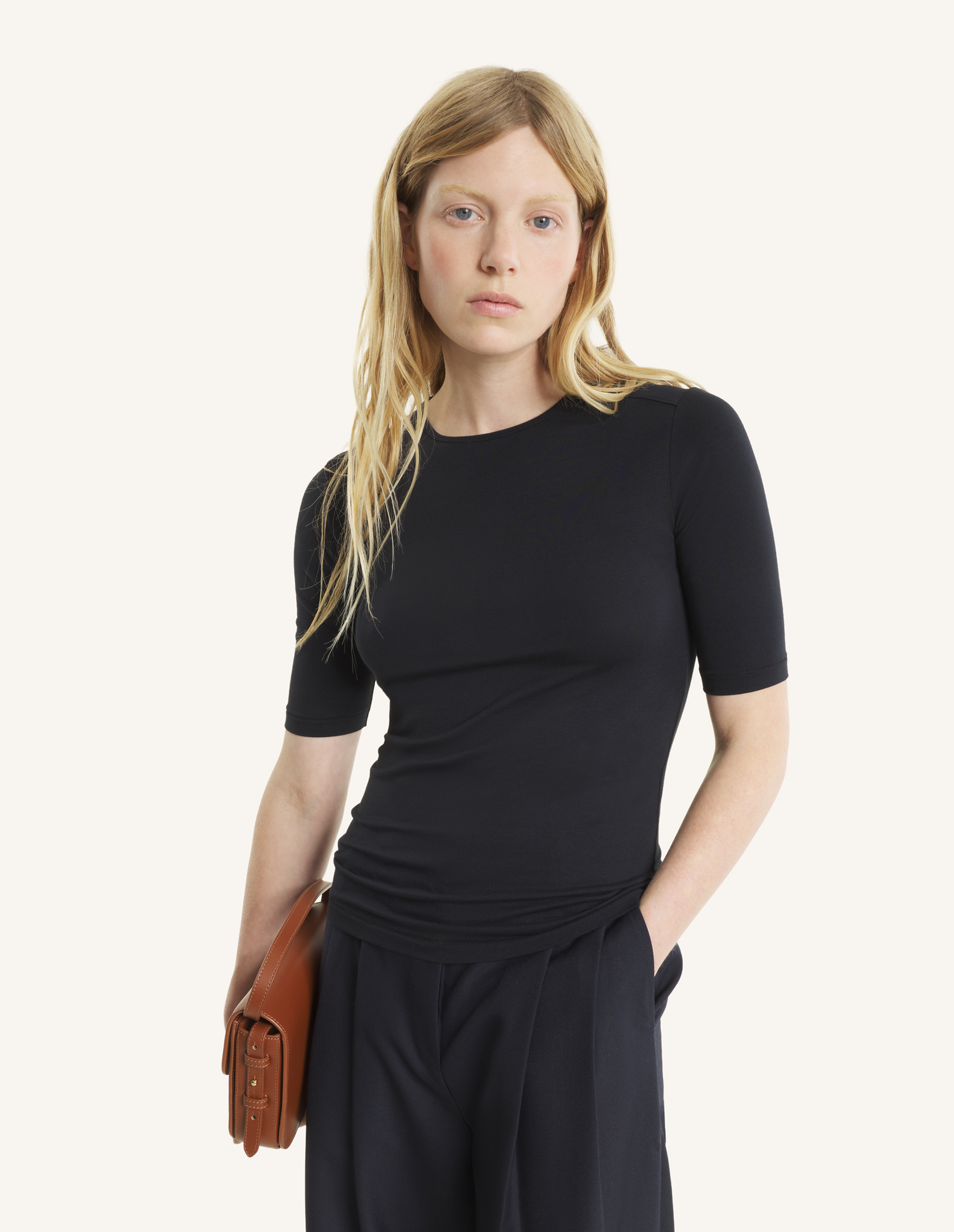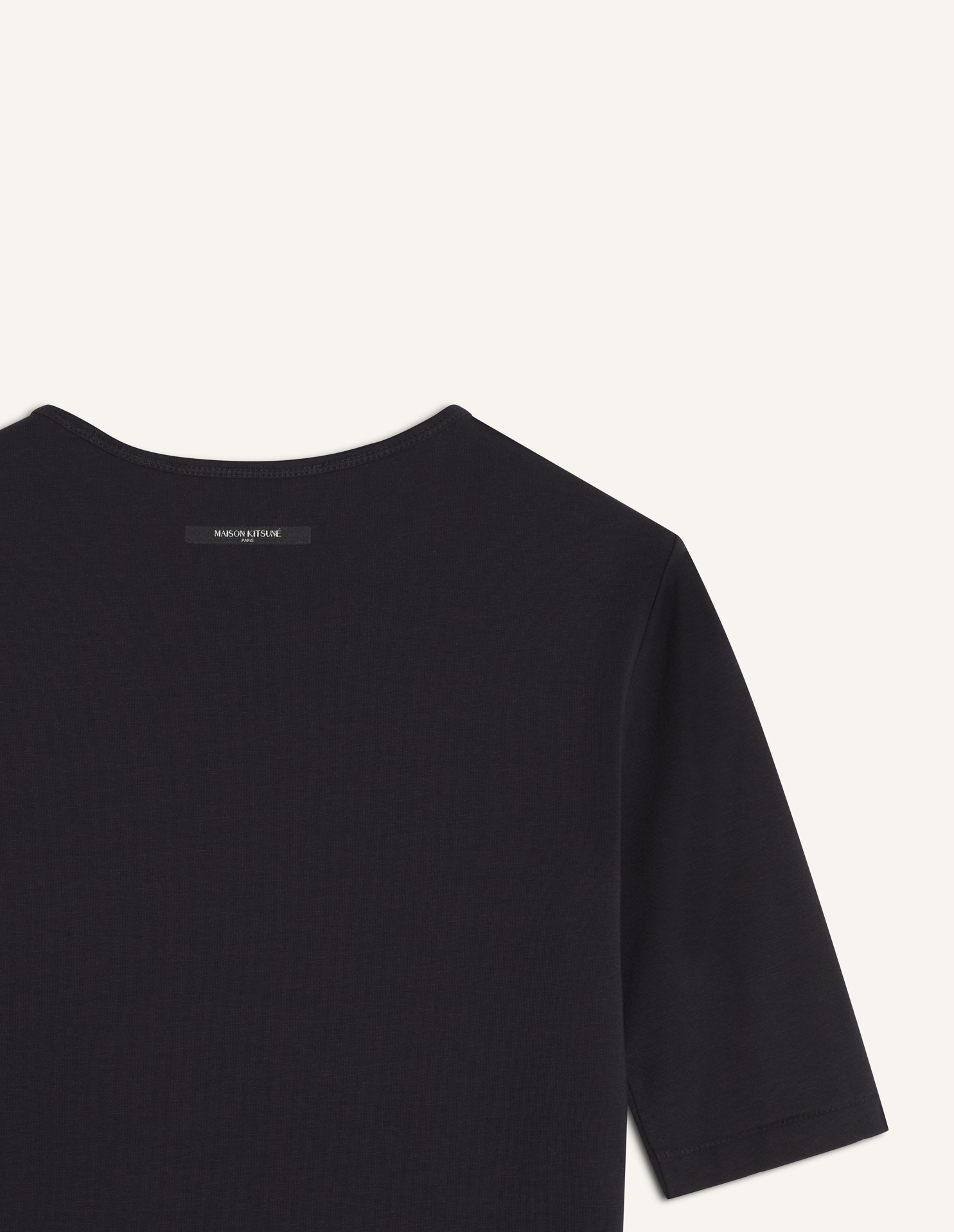 스트레치 저지 소재의 반소매 탑. 메종키츠네 파리 레이저 컷 패치가 부착된 피티드 컷.