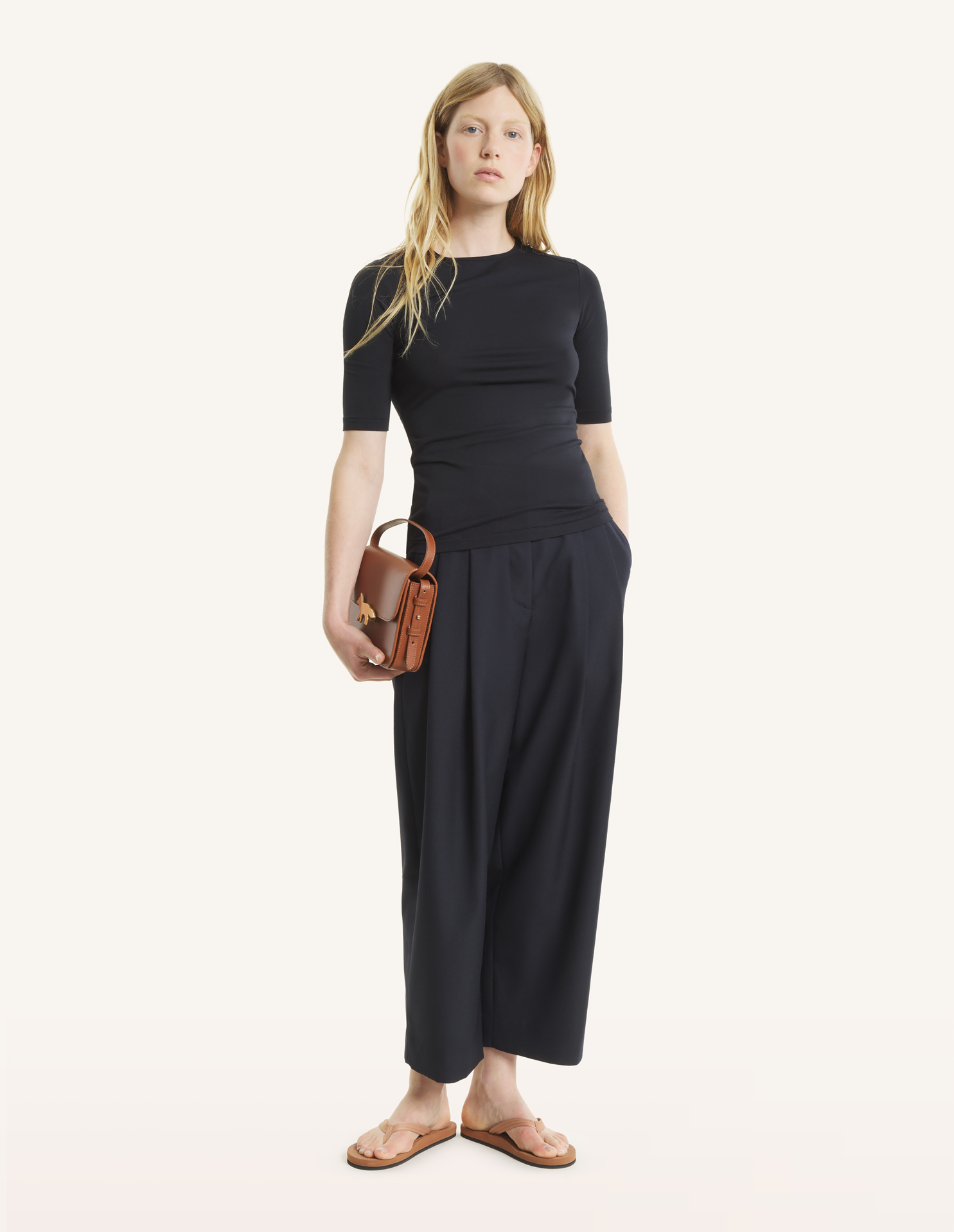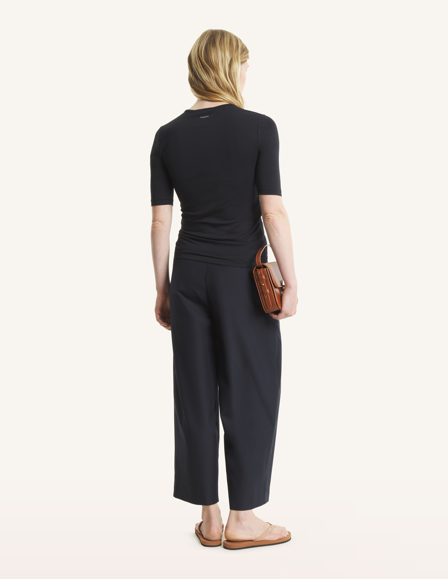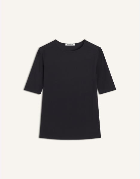스트레치 저지 소재의 반소매 탑. 메종키츠네 파리 레이저 컷 패치가 부착된 피티드 컷.