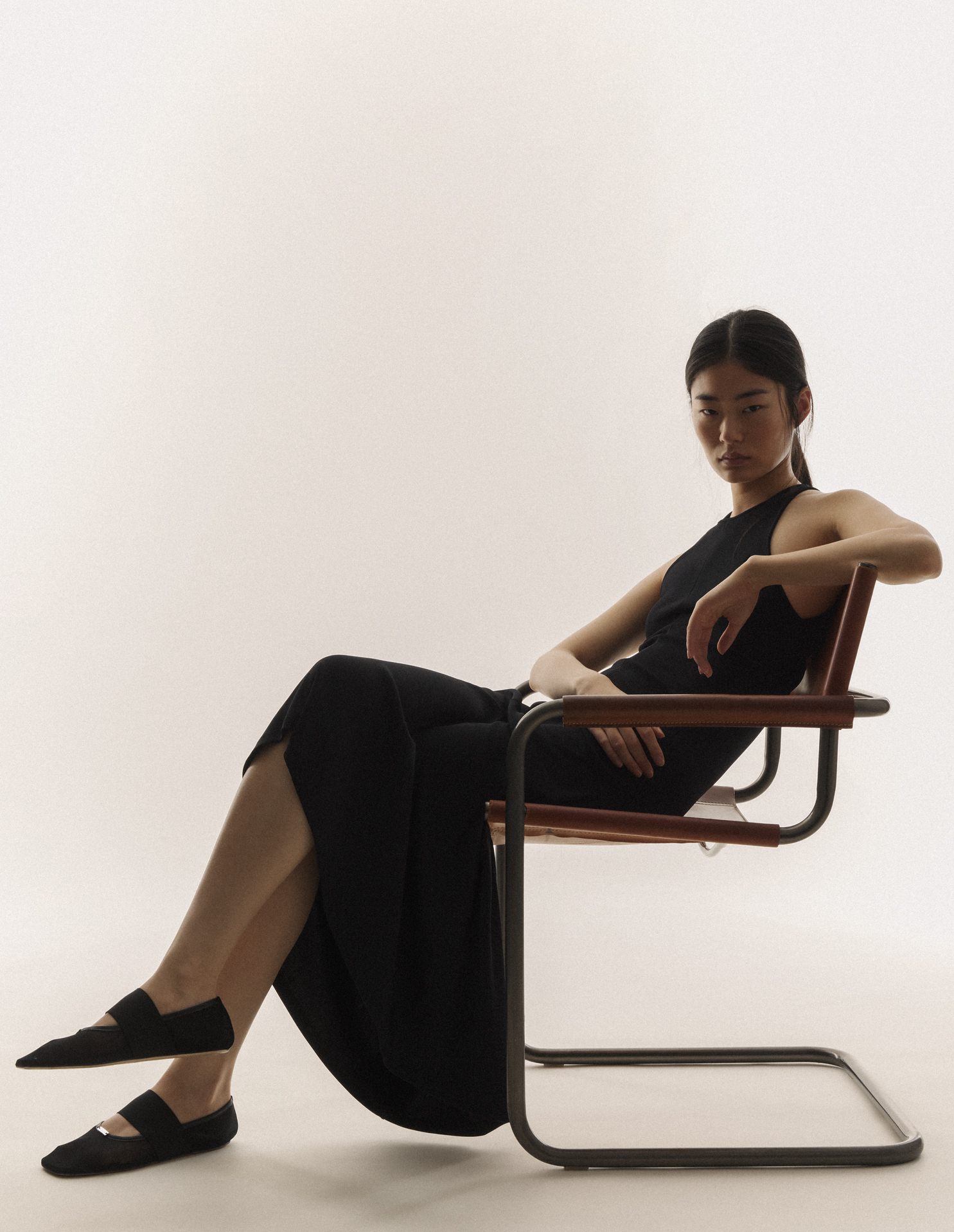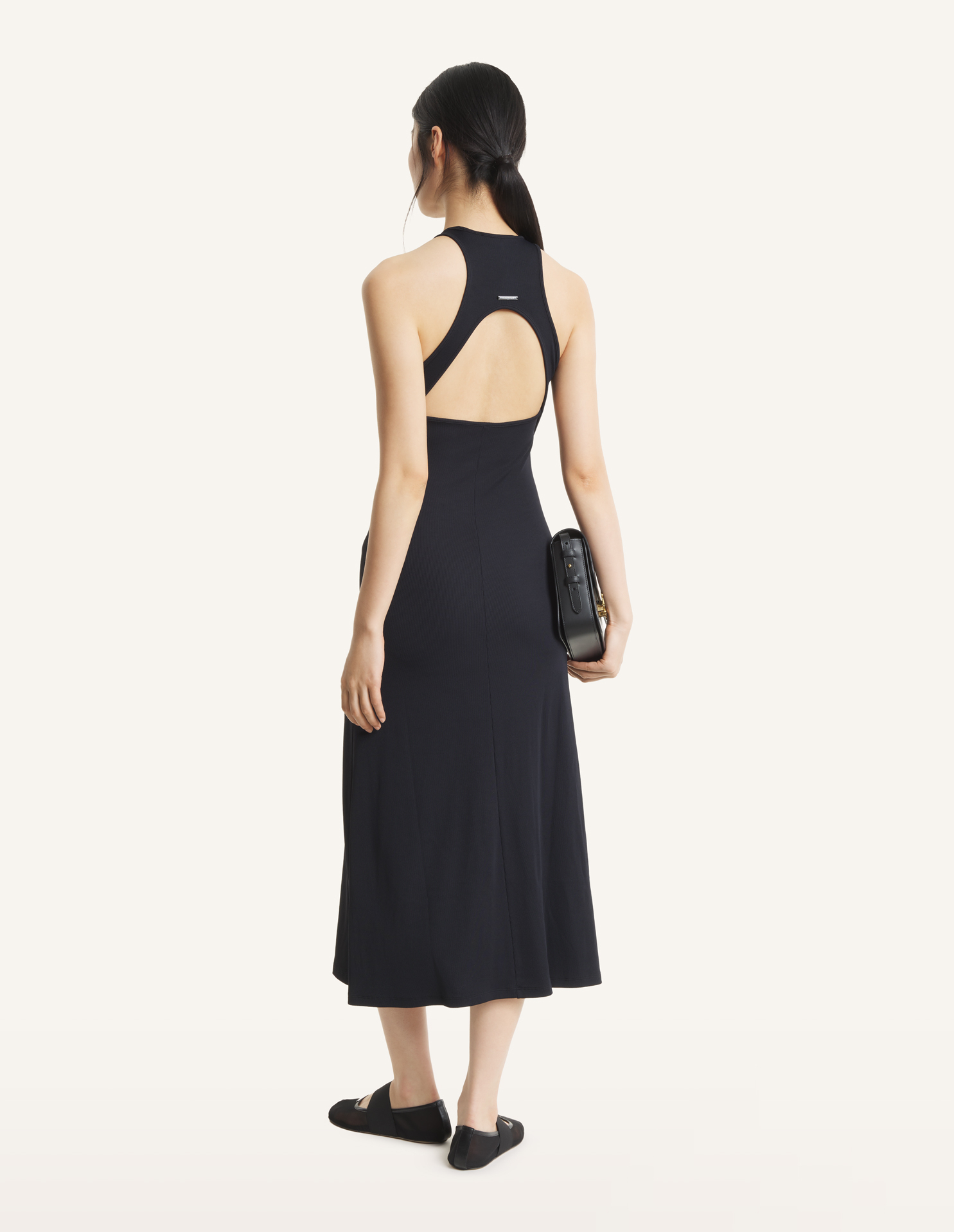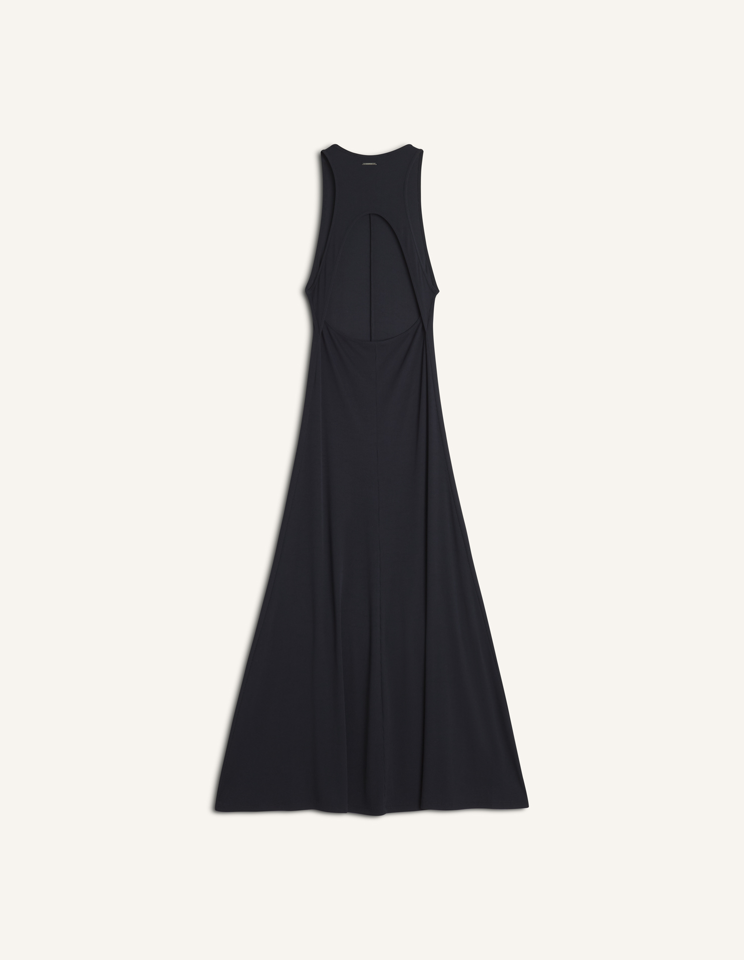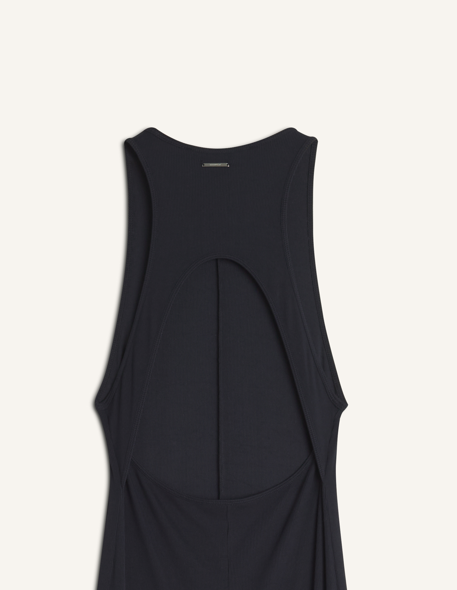 부드럽고 가는 골지 원단의 레이서 백 드레스. 롱핏 디자인으로, 뒷면에 메종키츠네 파리가 각인된 메탈 리벳 디테일이 있습니다.