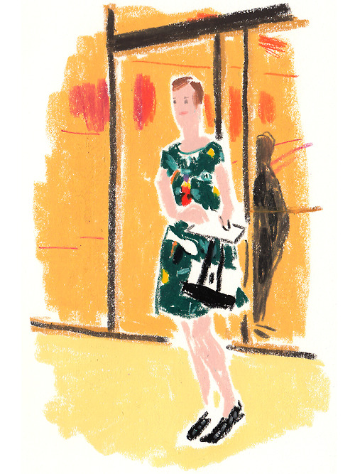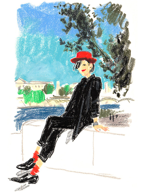 Two years ago I was going to the Dior show (merely just to hang out outside really) and arriving at the Hôtel des Invalides a guard told me the event was all the way at the back. I saw a very well dressed Asian lady – an editor for some magazine – trying to figure that out, looking absolutely panicked as she clearly would miss the show if she tried to run 1km in 3 minutes on 15cm (6in) heels. So I told her to hop on my Velib and I dropped her in front of the show’s venue. I did a drawing of it for my spread for T magazine.