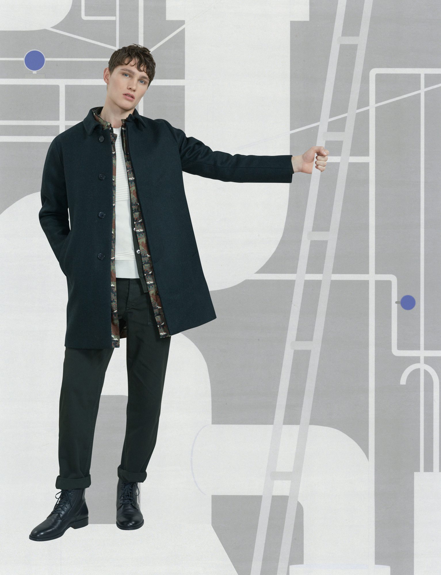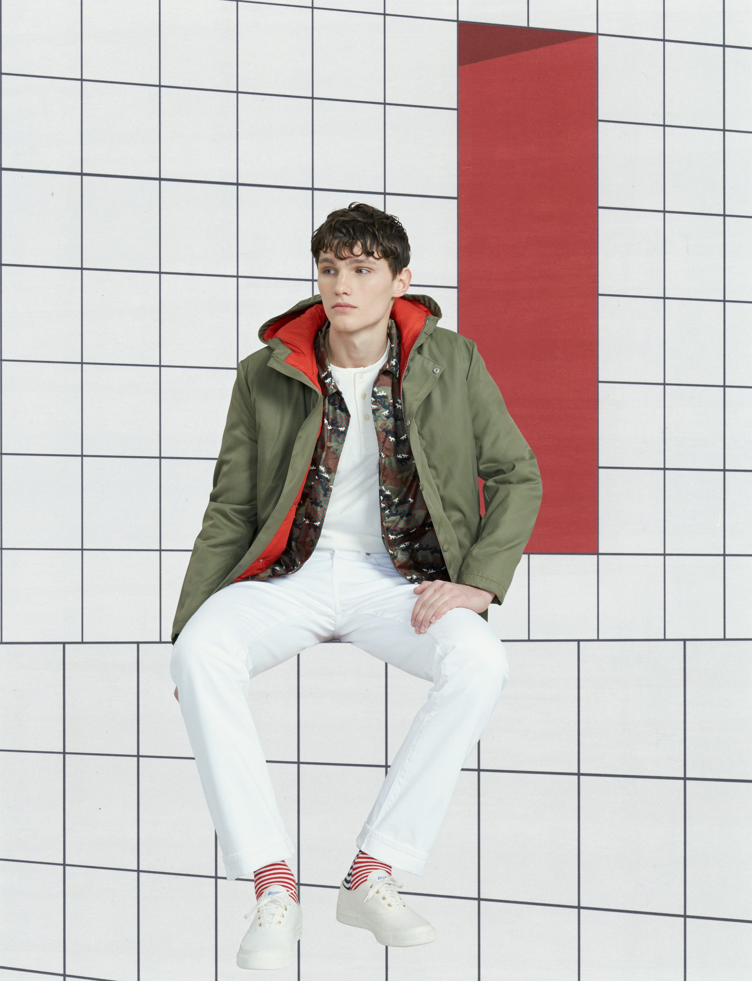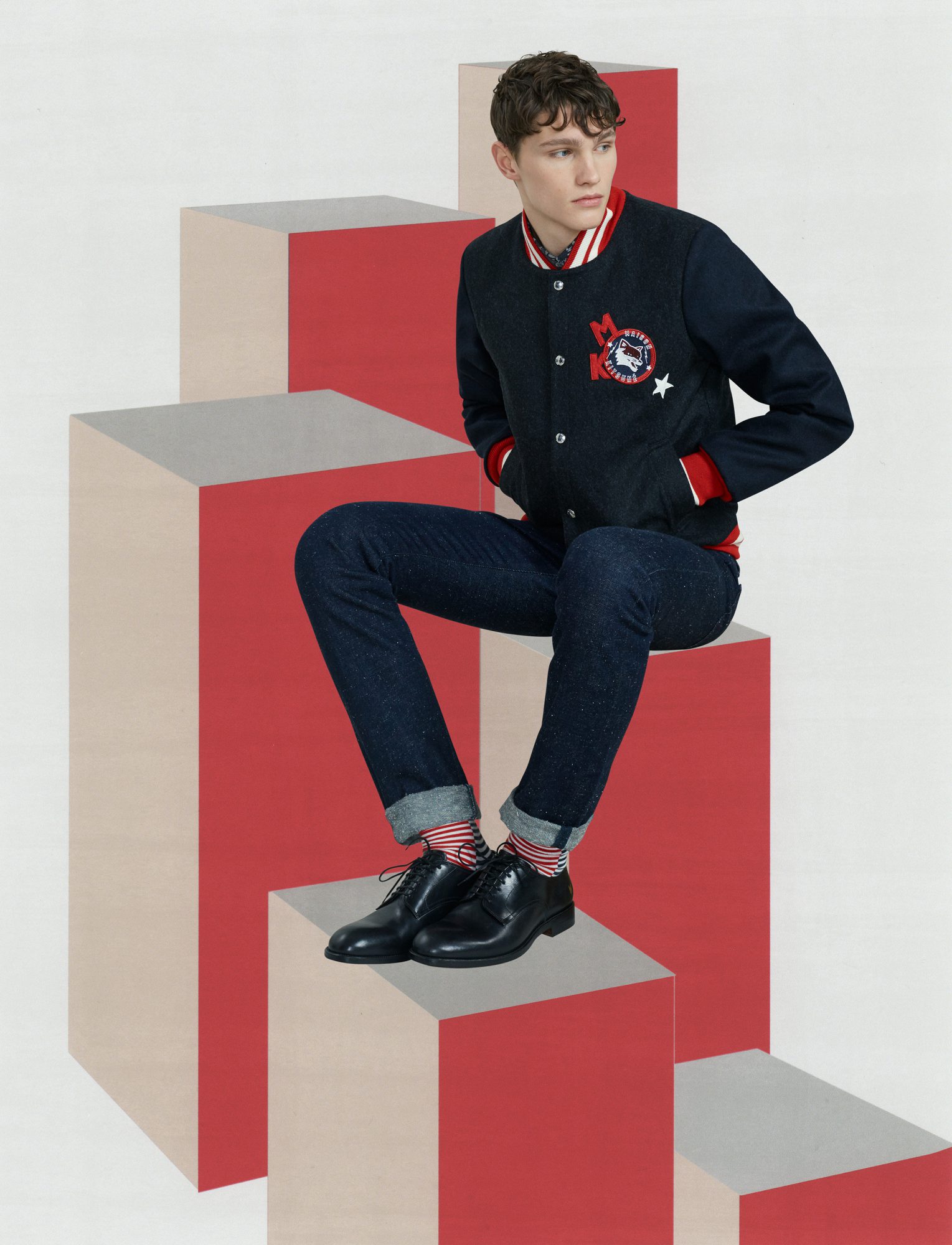 “Courage” and “Formidable” become the slogans of a collection where the games of fabrics and volumes sketch out a profound desire for comfort and protection. Thus unveils our vision of the modern man’s wardrobe complete with cosmopolitan influences and where chic flirts with sportswear. The minimalist silhouettes, with ultra-precise detailing, combine our Franco-Japanese heritage with American accents. This season the Maison Kitsuné man can have fun and mix genres with confidence; the look brims with humor, providing dynamic pieces for a wardrobe that ranges from laidback cool to au courant sophistication.