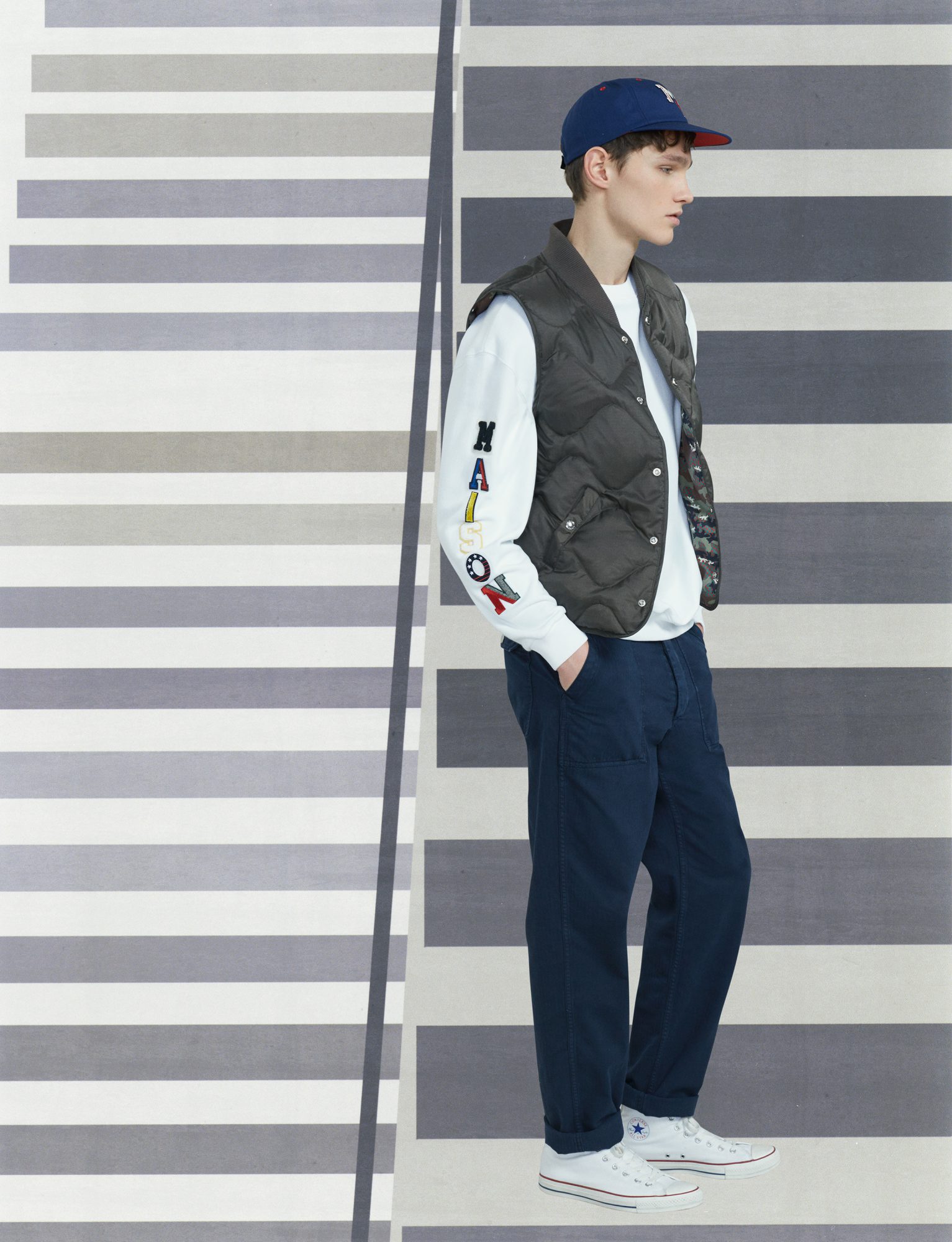 Vintage preppy style is modernized, with pieces ranging from classic staples to more sporty designs. Playful references to American super-heroes are nuanced across the classics, here and there. Details from the classic military ensemble are subtly drawn from.