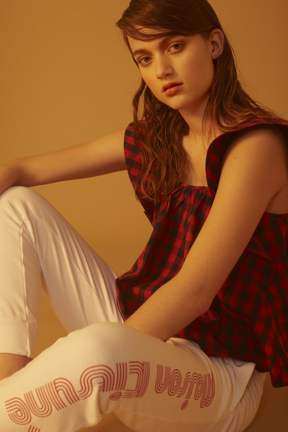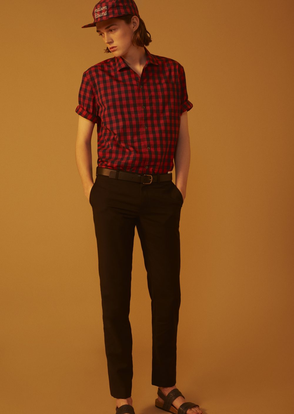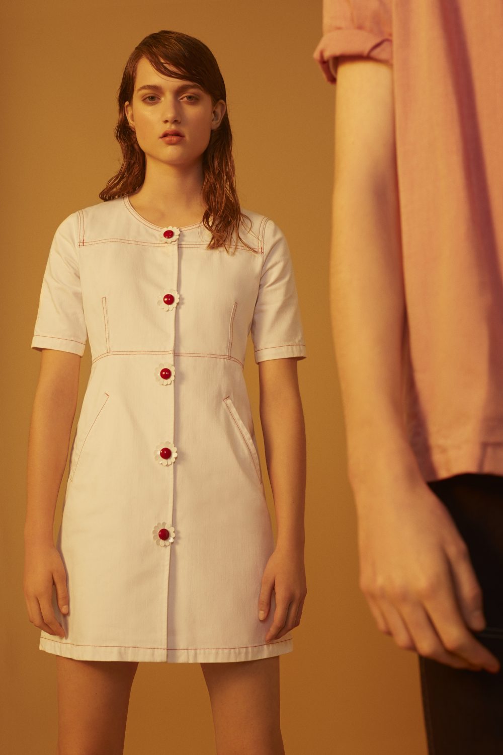 To celebrate the sweet arrival of Spring, Maison Kitsuné reveals its “Summer Glow” capsule collection. Designed by Gildas Loaëc and Masaya Kuroki, co-founders and creative directors, this capsule collection presents a graphic, edgy and sophisticated wardrobe. “Bubble” printed tee-shirts and sweat-shirts for men and women are both colorful and playful. A white denim dress and skirt with contrasted stitches are adorned with red and white daisy snap buttons on the front. Flounced tops, soft knitwear, midi skirts, chino shorts and short-sleeve shirts for men, as well as accessories are available in plain, color block or red-checked styles.