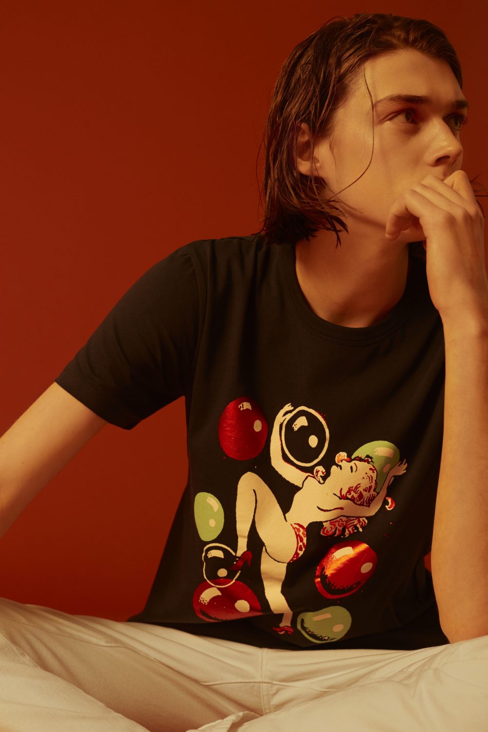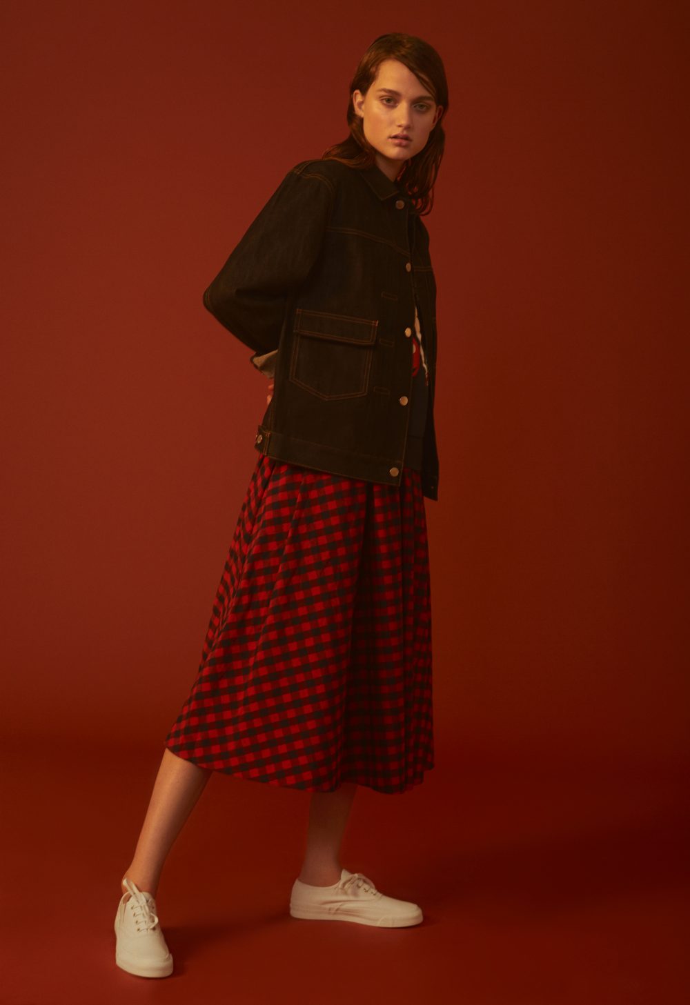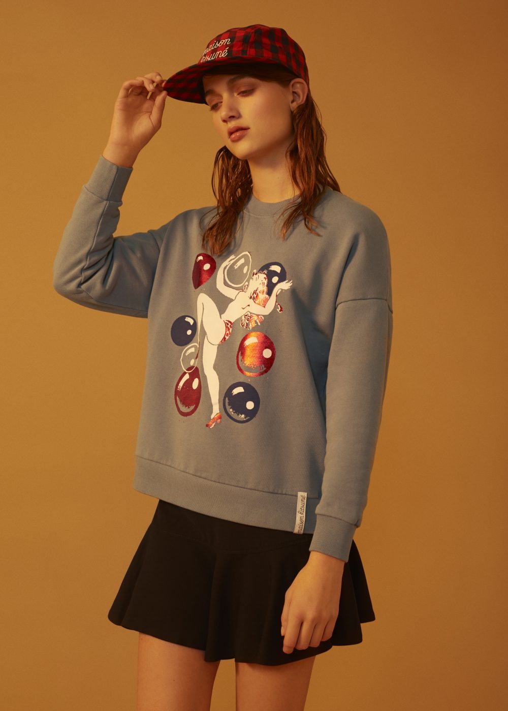 To celebrate the sweet arrival of Spring, Maison Kitsuné reveals its “Summer Glow” capsule collection. Designed by Gildas Loaëc and Masaya Kuroki, co-founders and creative directors, this capsule collection presents a graphic, edgy and sophisticated wardrobe. “Bubble” printed tee-shirts and sweat-shirts for men and women are both colorful and playful. A white denim dress and skirt with contrasted stitches are adorned with red and white daisy snap buttons on the front. Flounced tops, soft knitwear, midi skirts, chino shorts and short-sleeve shirts for men, as well as accessories are available in plain, color block or red-checked styles.