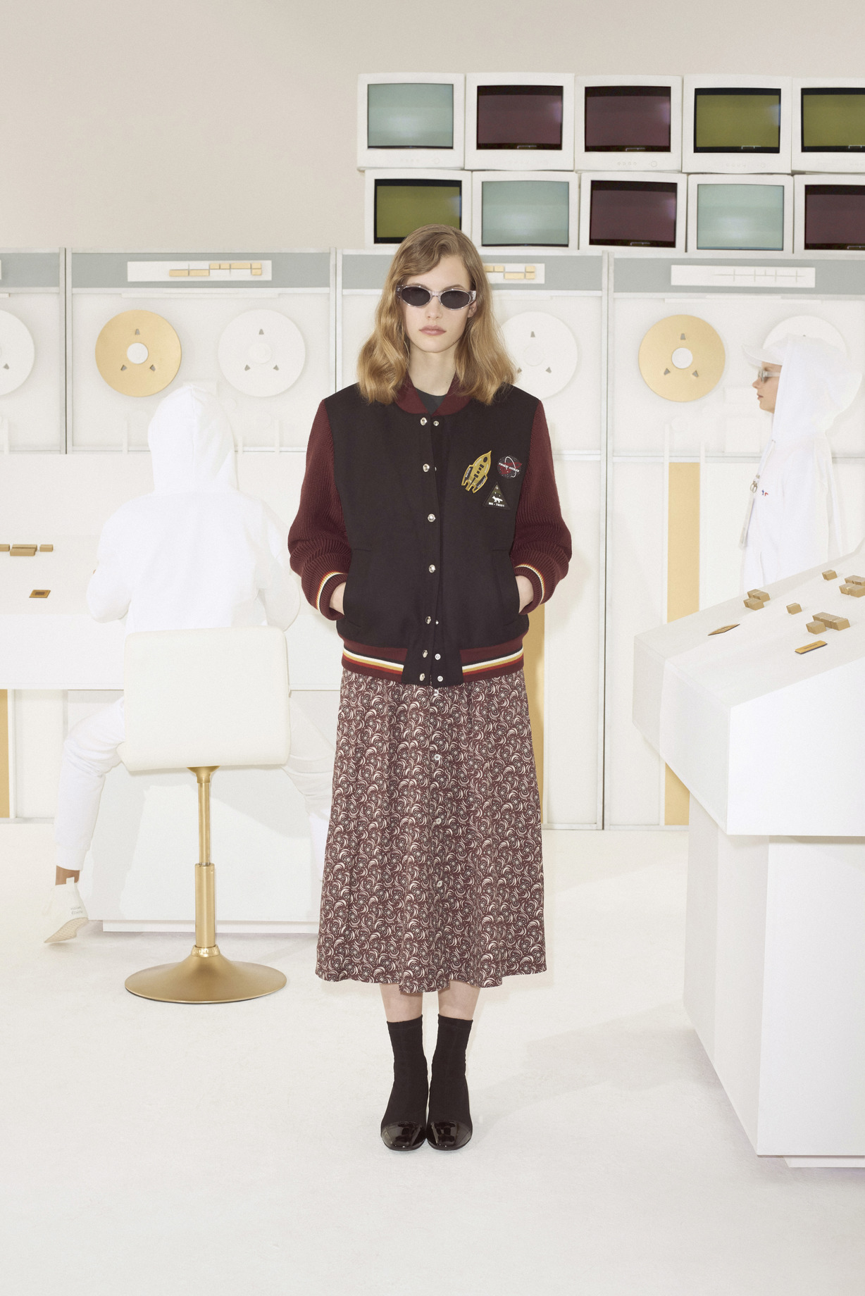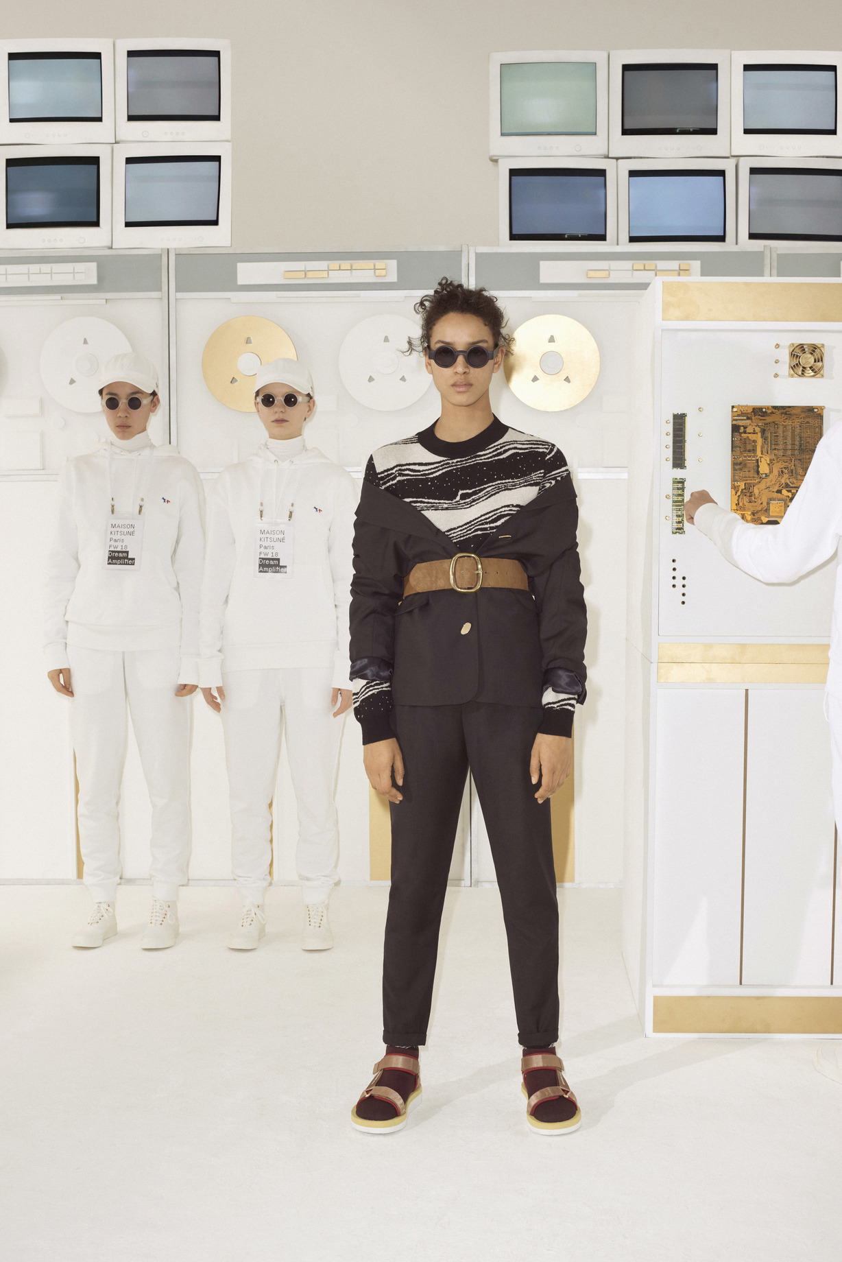 Computer jargon invades certain garments, appearing as a visible label reminiscent of a pop-up window, or on a white cotton sweatshirt. The all-over prints, embroideries and deconstructed space travel patches punctuate looks here and there. Nods to the world of gaming add a playful dimension. The iconic Maison Kitsuné fox has been redesigned as an animated and pixelated character, while shapes, little geometric buttons and contrast over-stitching are interspersed throughout.