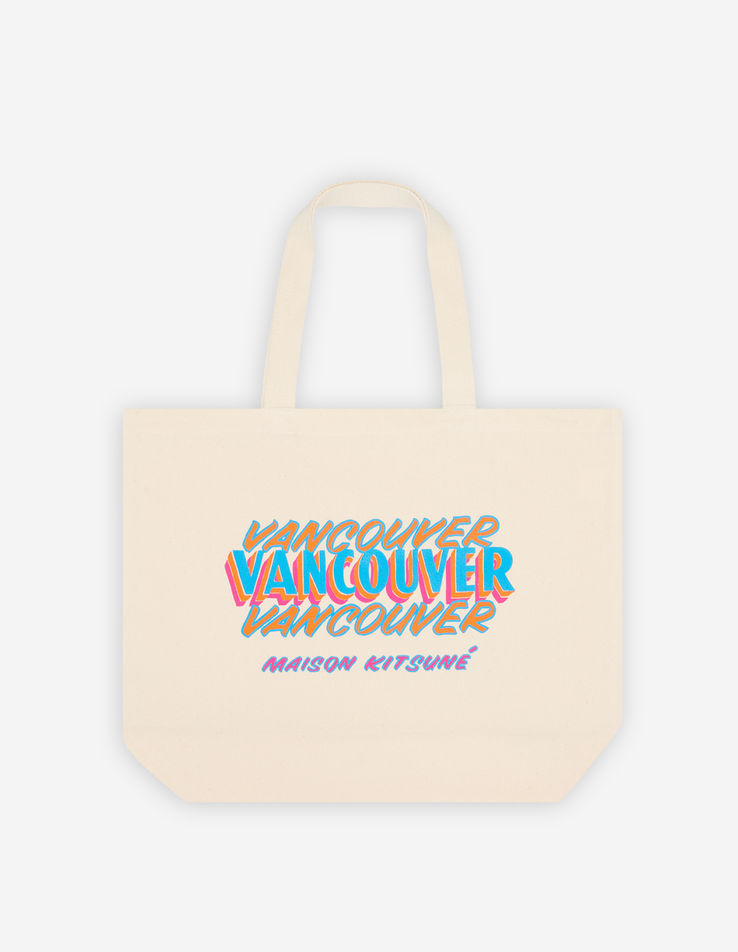 Canvas BEN KLEVAY x MAISON KITSUNÉ print tote bag. Contrast 3D-effect “Vancouver” printed on the frontside. Classic cut with two handles for handheld or shoulder wear.