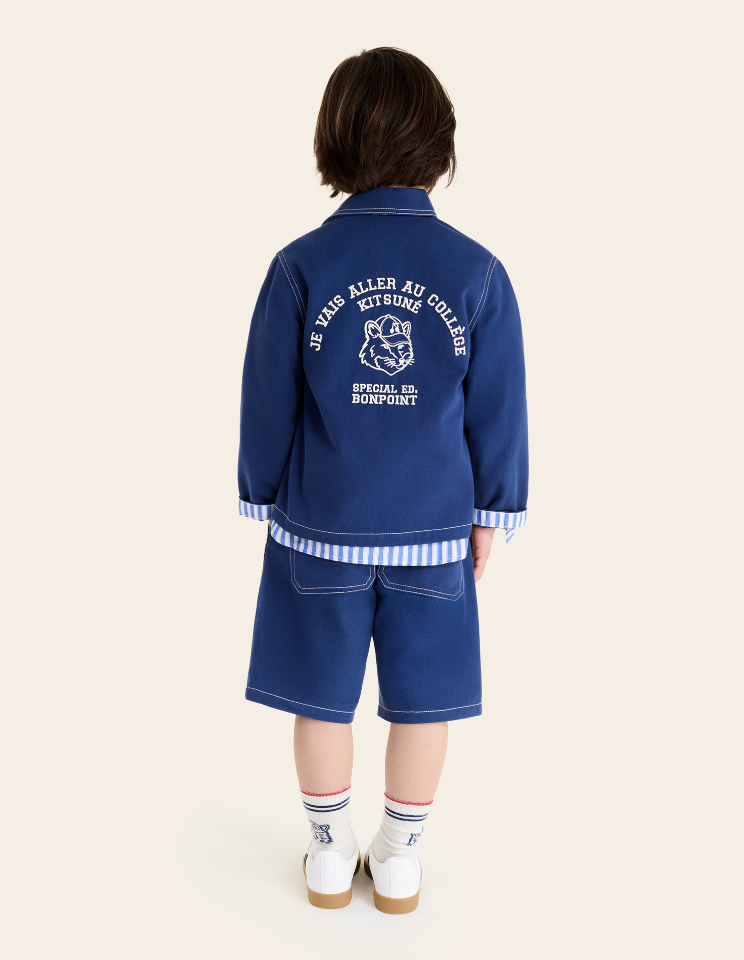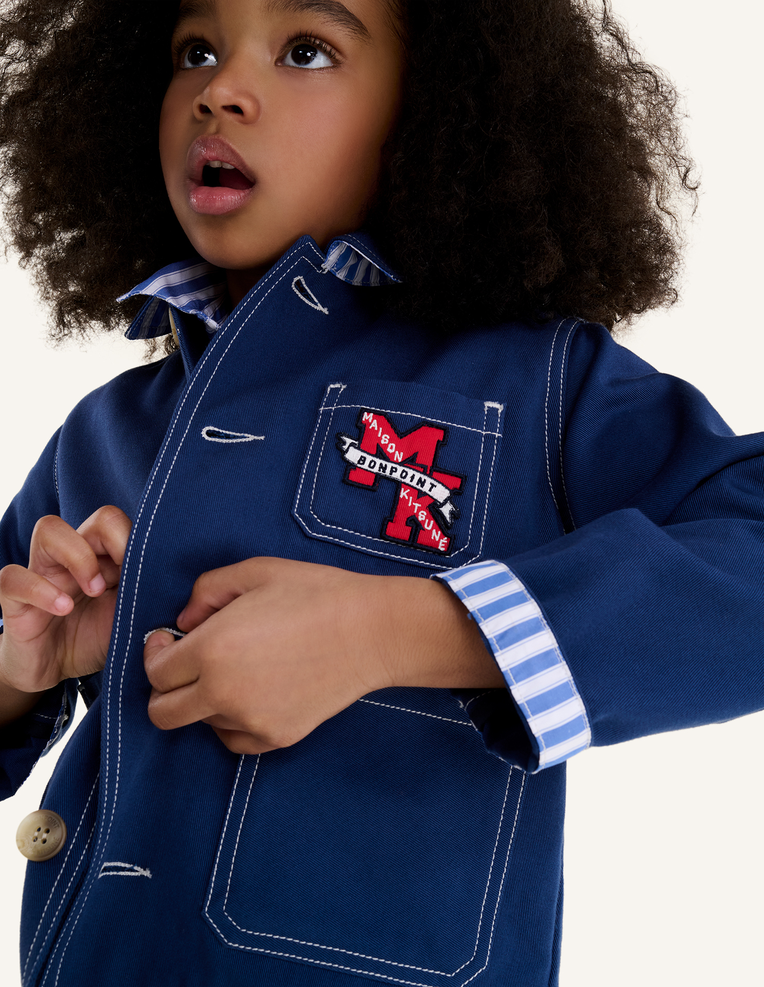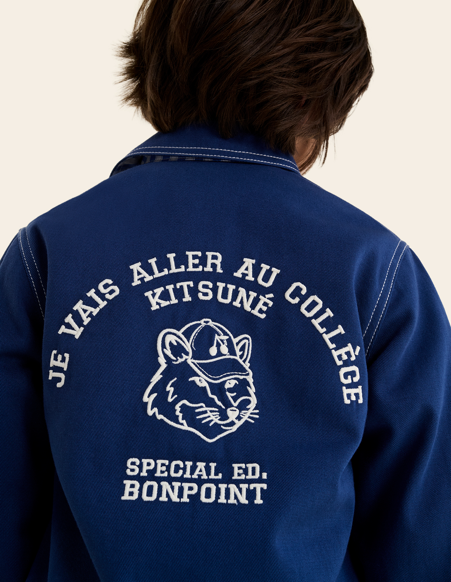 Maison Kitsuné x Bonpoint workwear jacket for kids. Varsity patch embroidered on the chest and back.