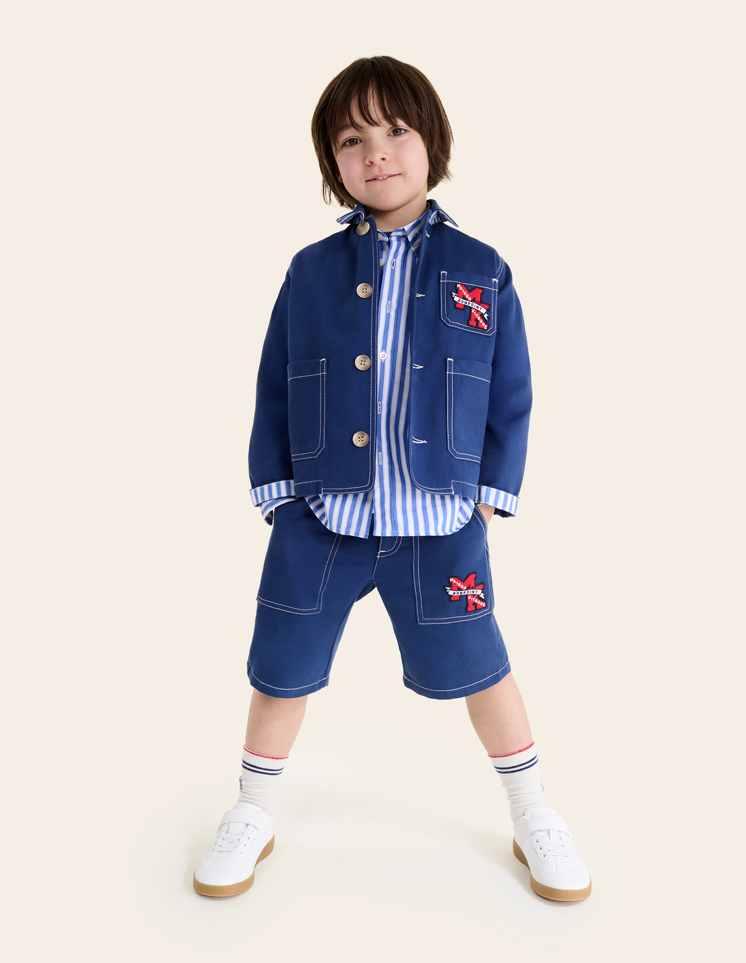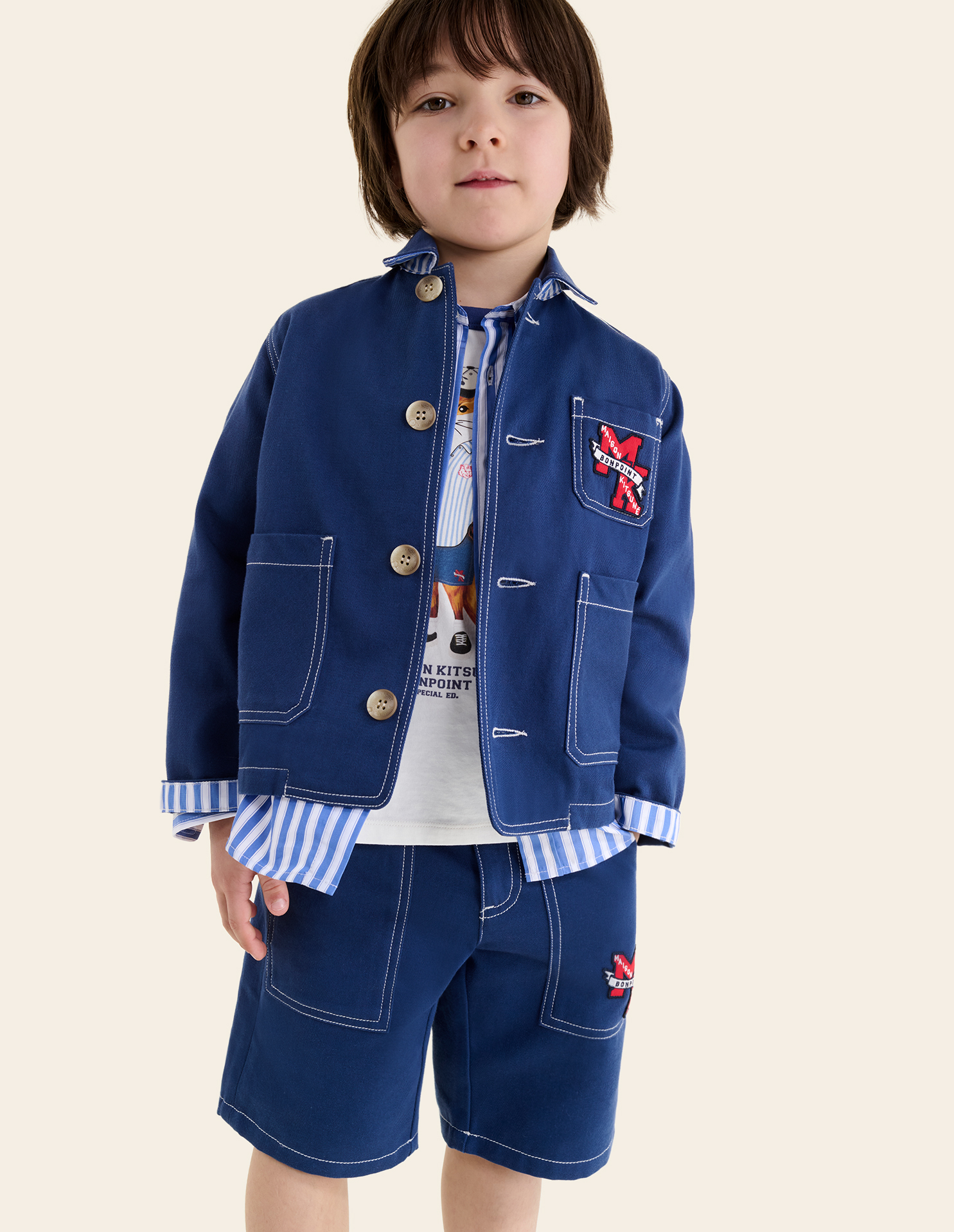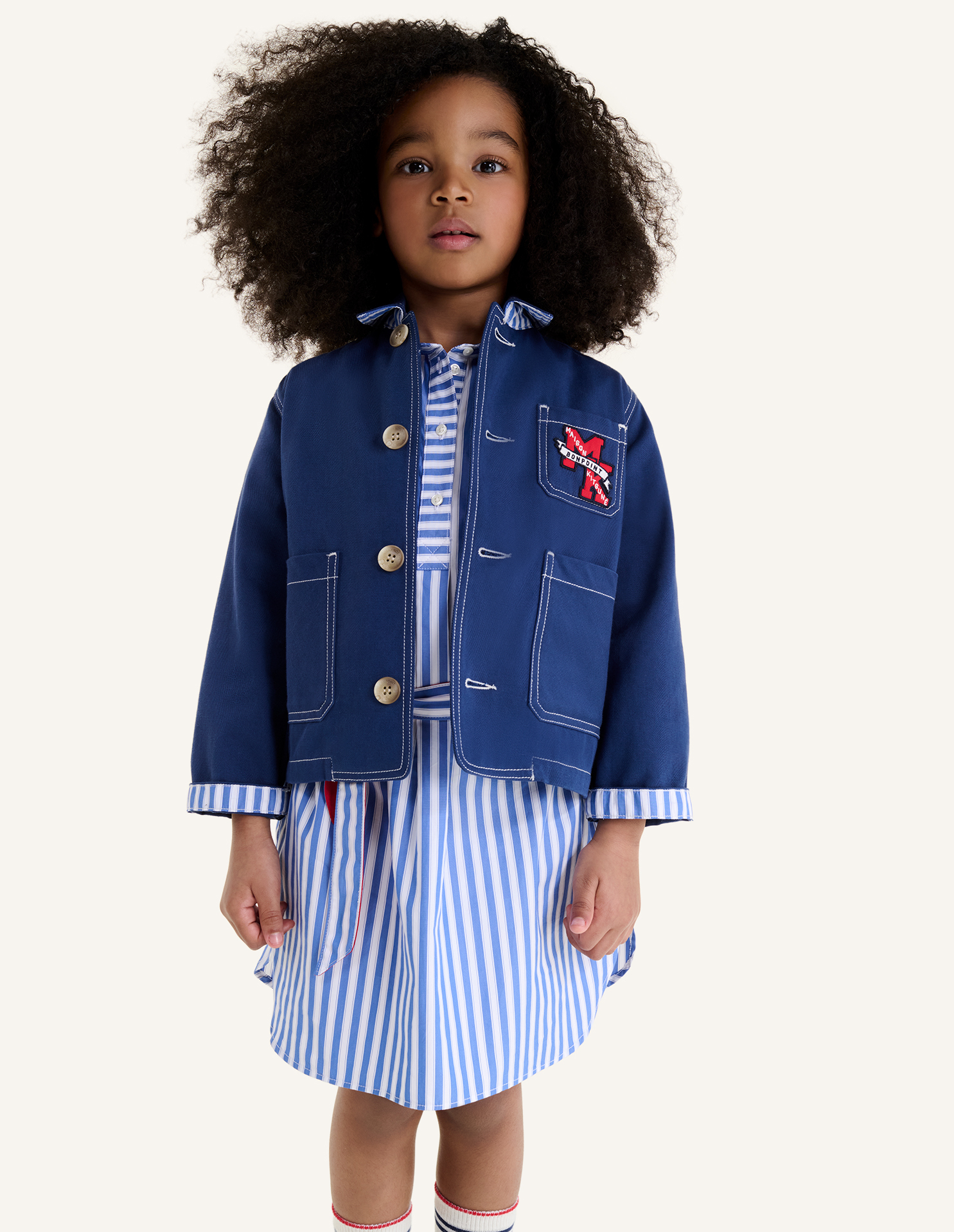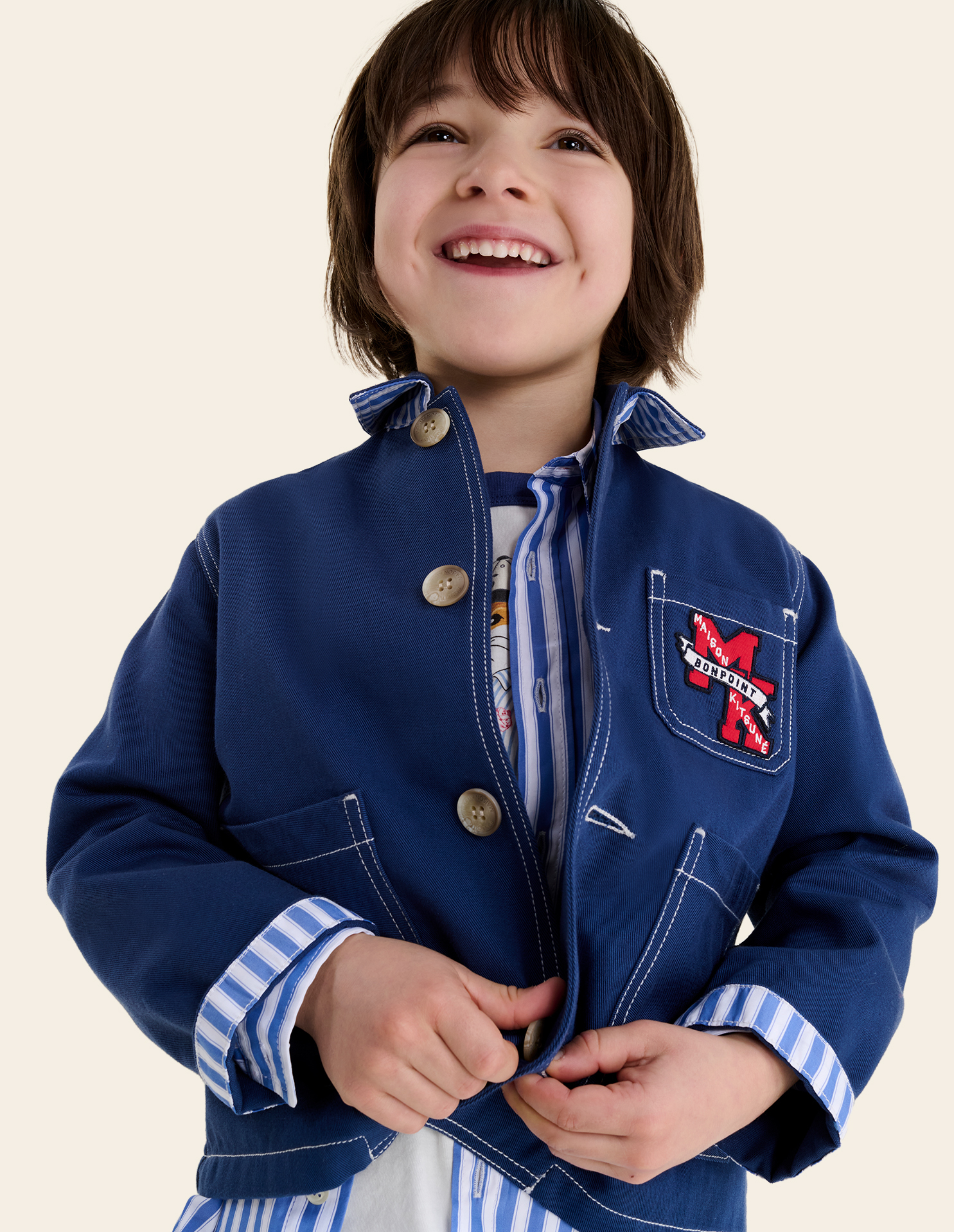 Maison Kitsuné x Bonpoint workwear jacket for kids. Varsity patch embroidered on the chest and back.